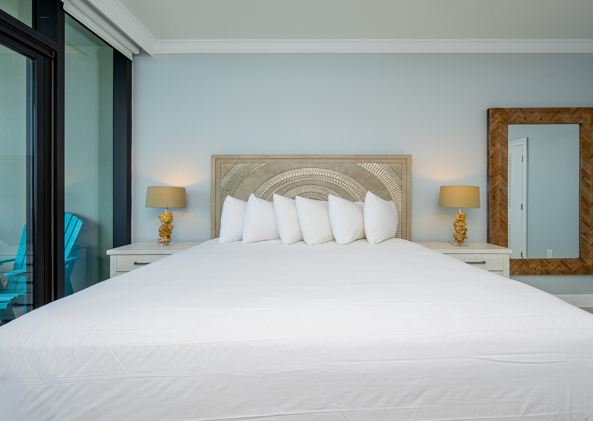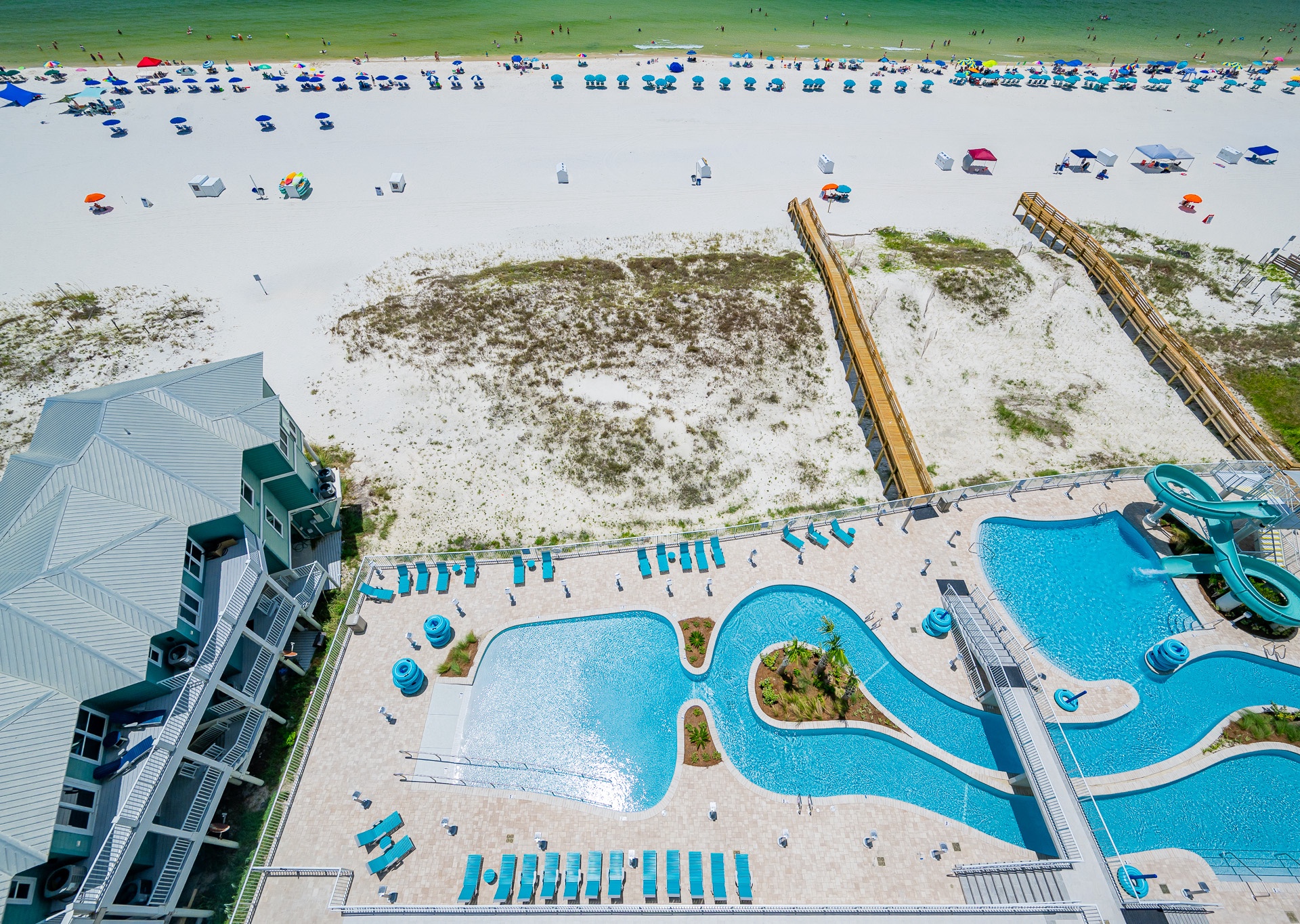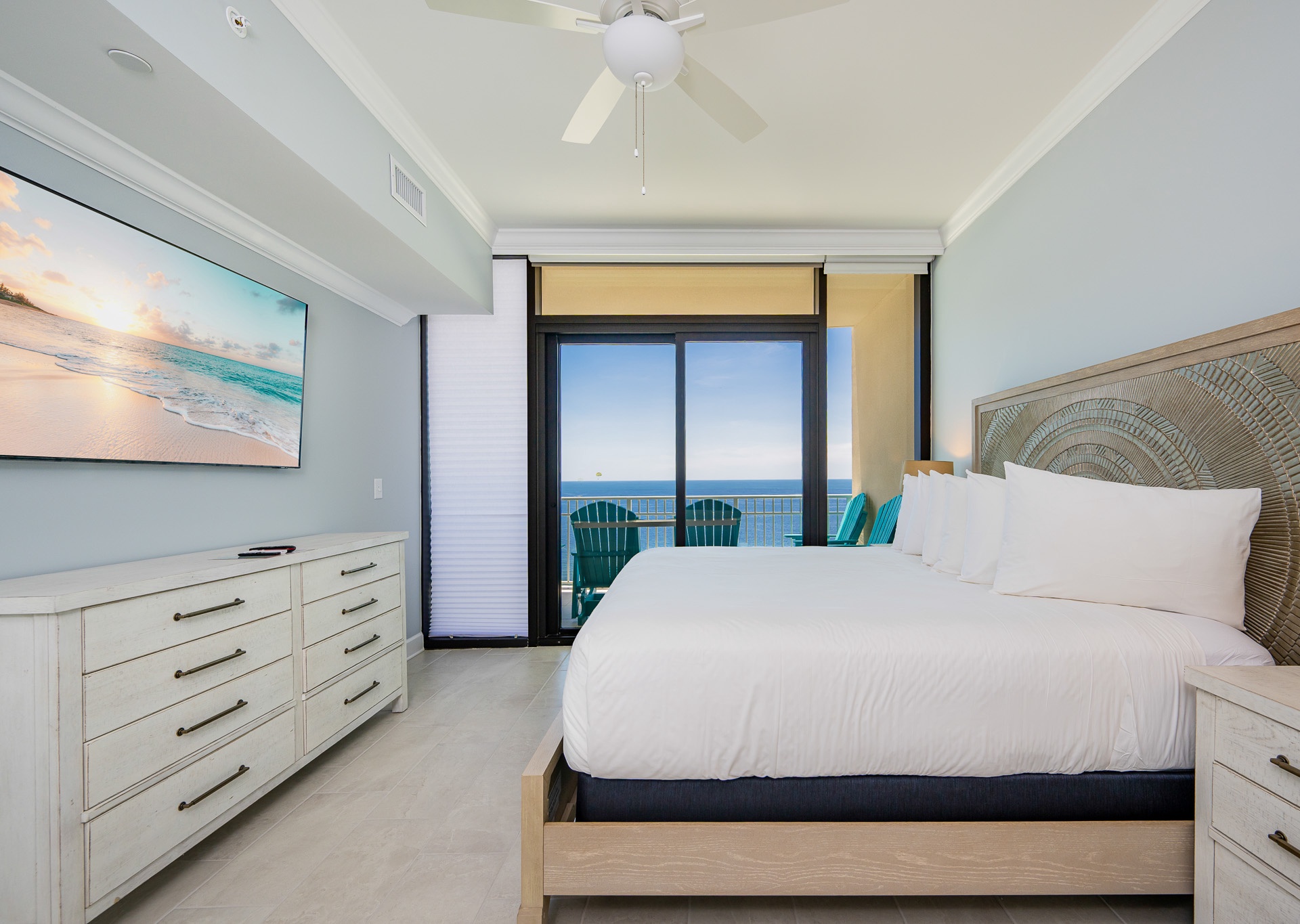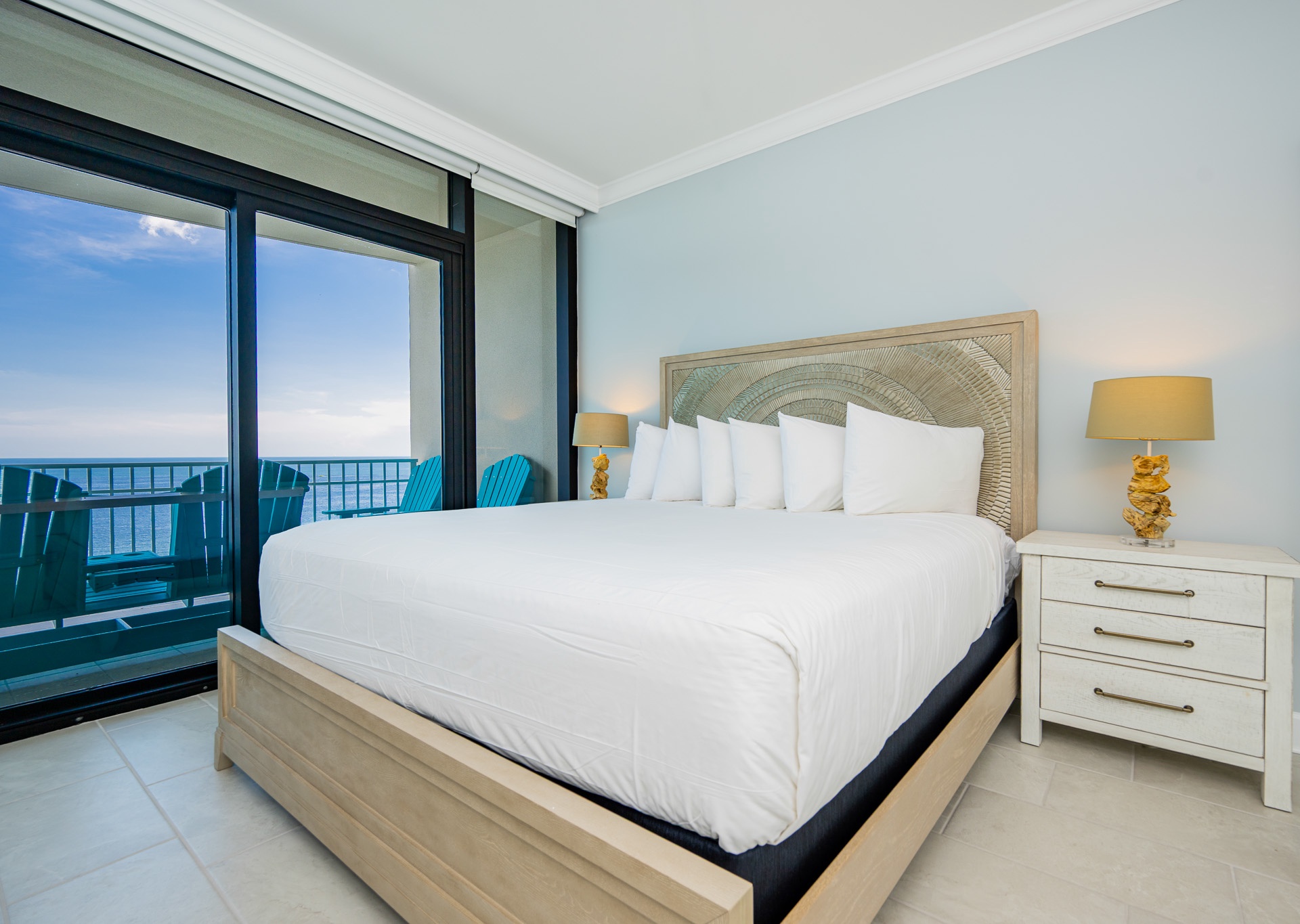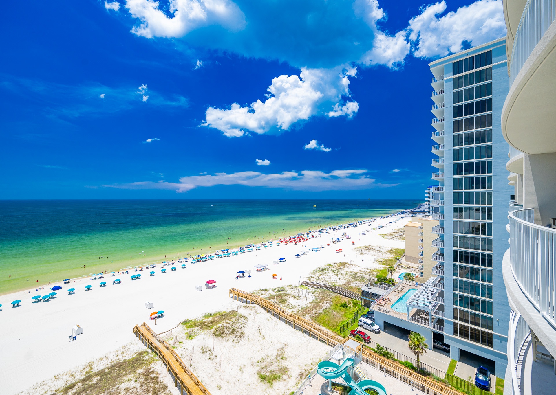 Step outside to the spacious Gulf-front balcony and enjoy the popular Polywood furniture—with plenty of seating for your entire group, including chairs, loungers, and a table for outdoor dining or relaxing. The views are unbeatable, overlooking the white sand beaches, lazy river, waterslide, and sparkling outdoor pool below.