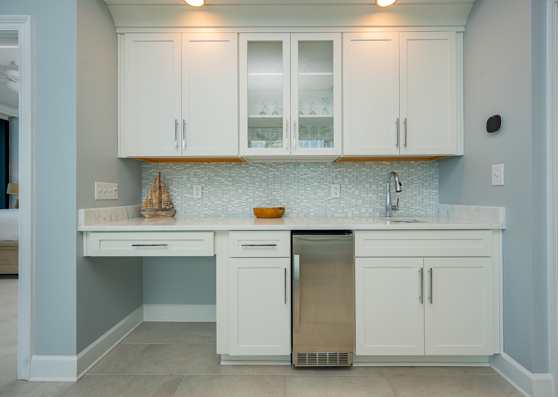 One of the standout features is the entertainment-ready wet bar, which includes a sink, icemaker, and even a desk area with a chair—perfect if you need to check in with work while away.