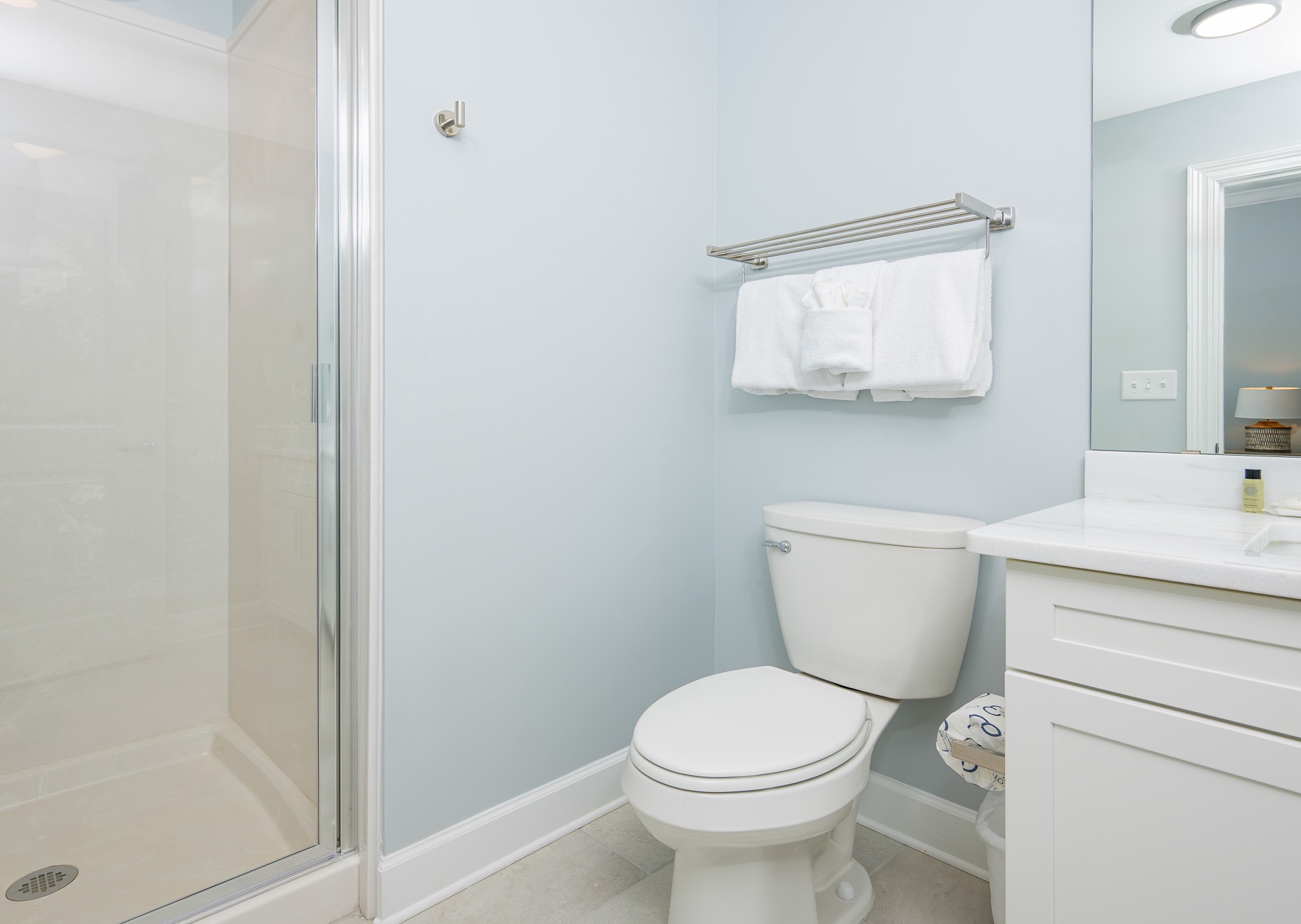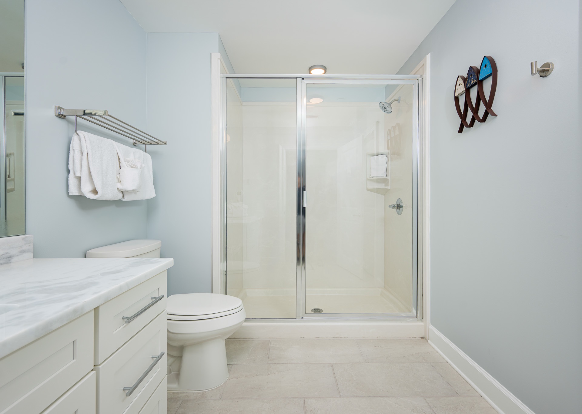 Each bedroom has its own private bathroom with a single vanity and walk-in shower, while the master bath features an oversized glass walk-in shower and a relaxing Jacuzzi tub.