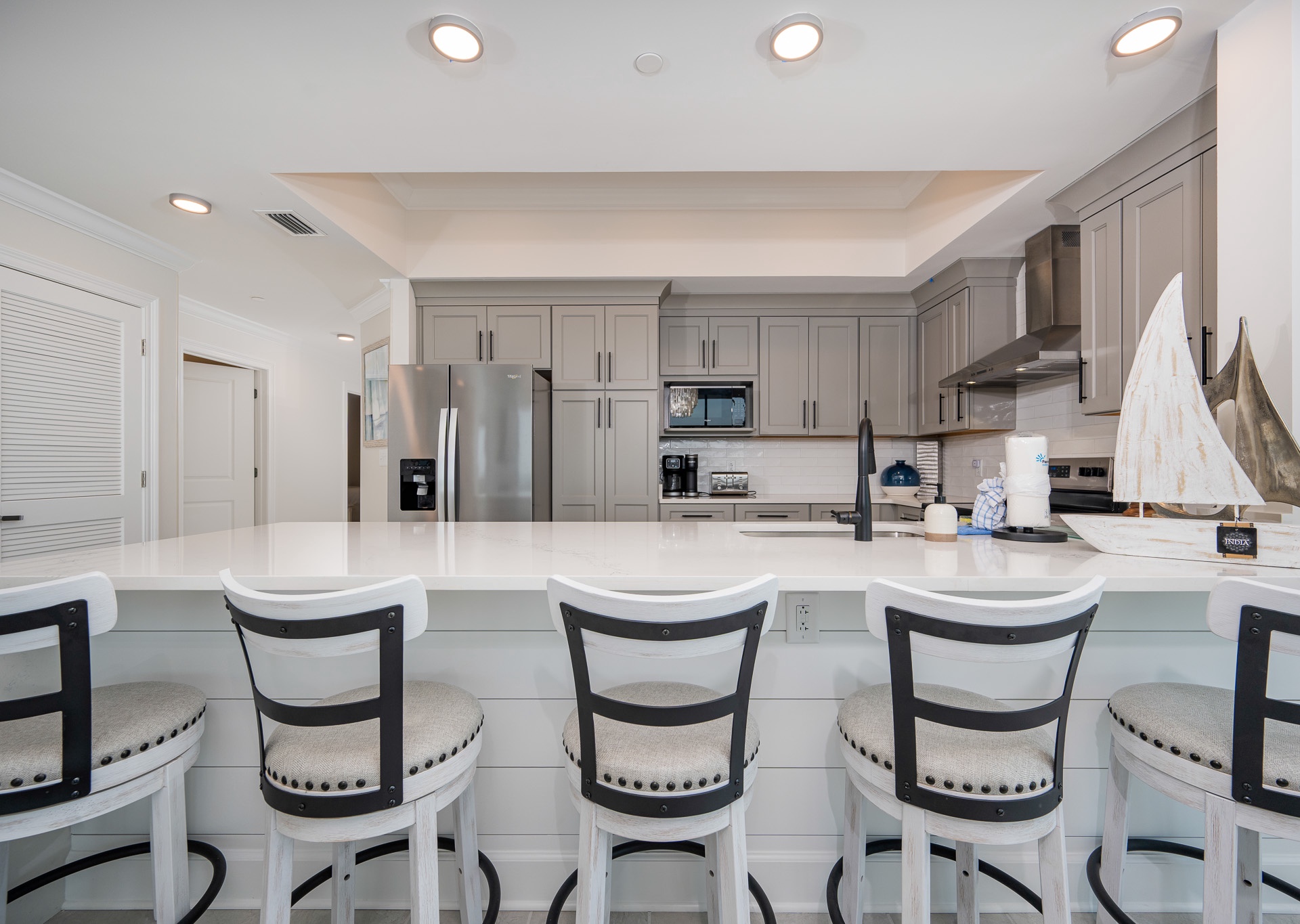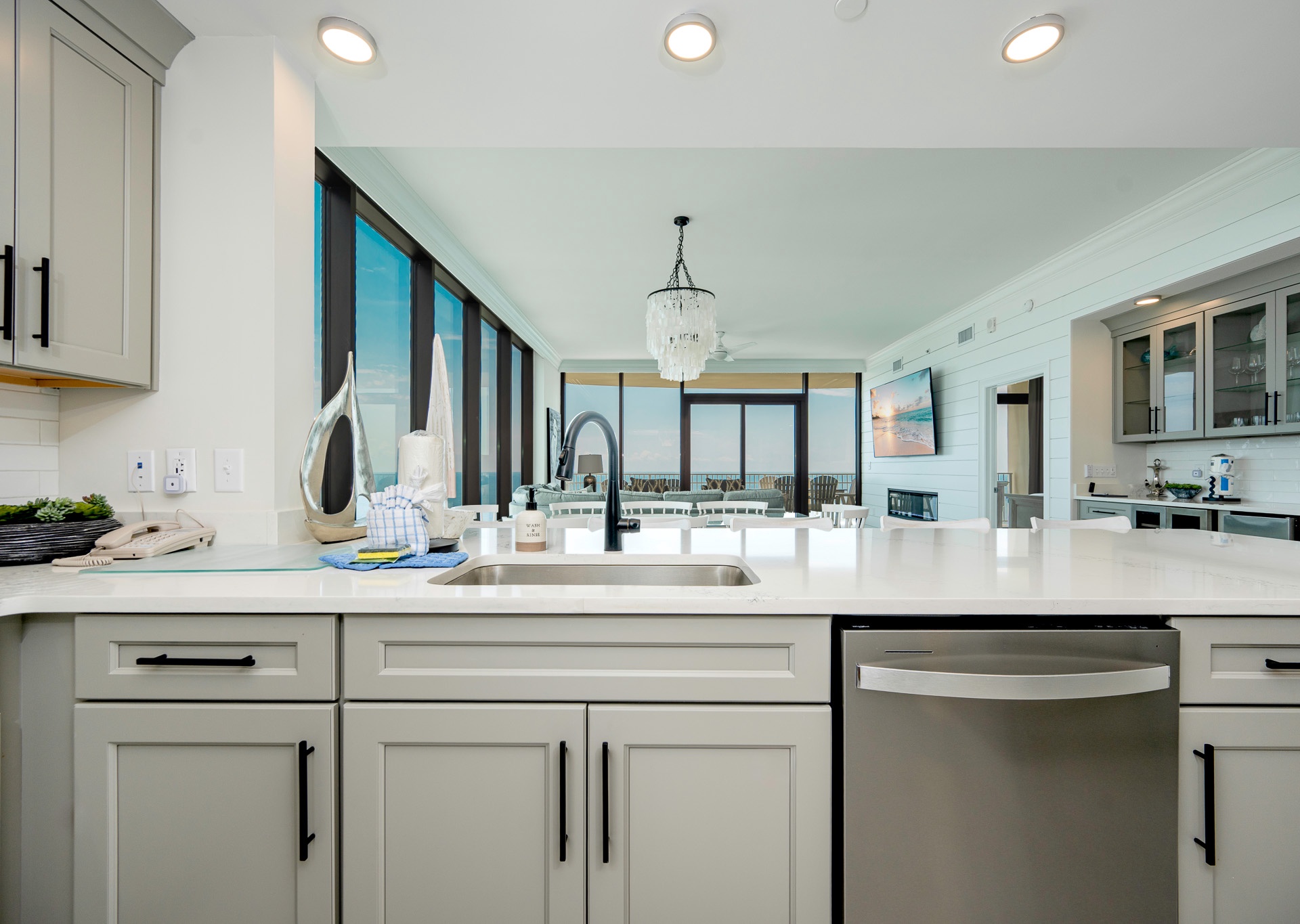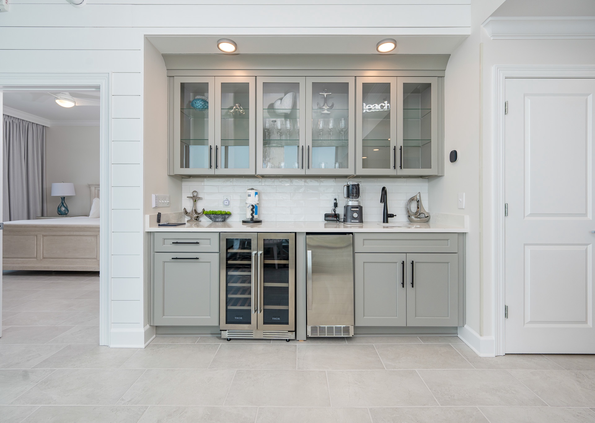 Inside, the spacious open-concept design is perfect for gathering. The dining table seats eight beneath a gorgeous chandelier, with five additional barstools at the breakfast bar. The kitchen is fully stocked with stainless steel appliances, a regular coffee pot and Keurig, and everything you need for cooking and entertaining. Adjacent to the kitchen, you’ll find a stylish bar area with a wine fridge, beverage fridge, ice maker, and plenty of glassware for your favorite drinks.