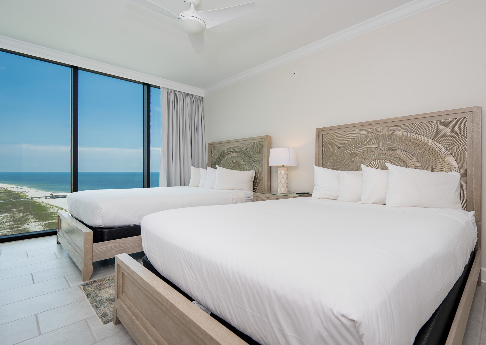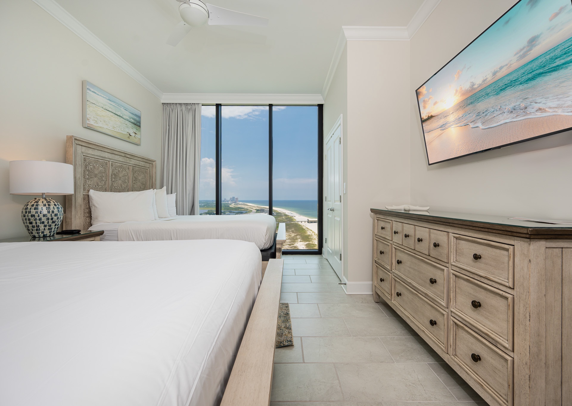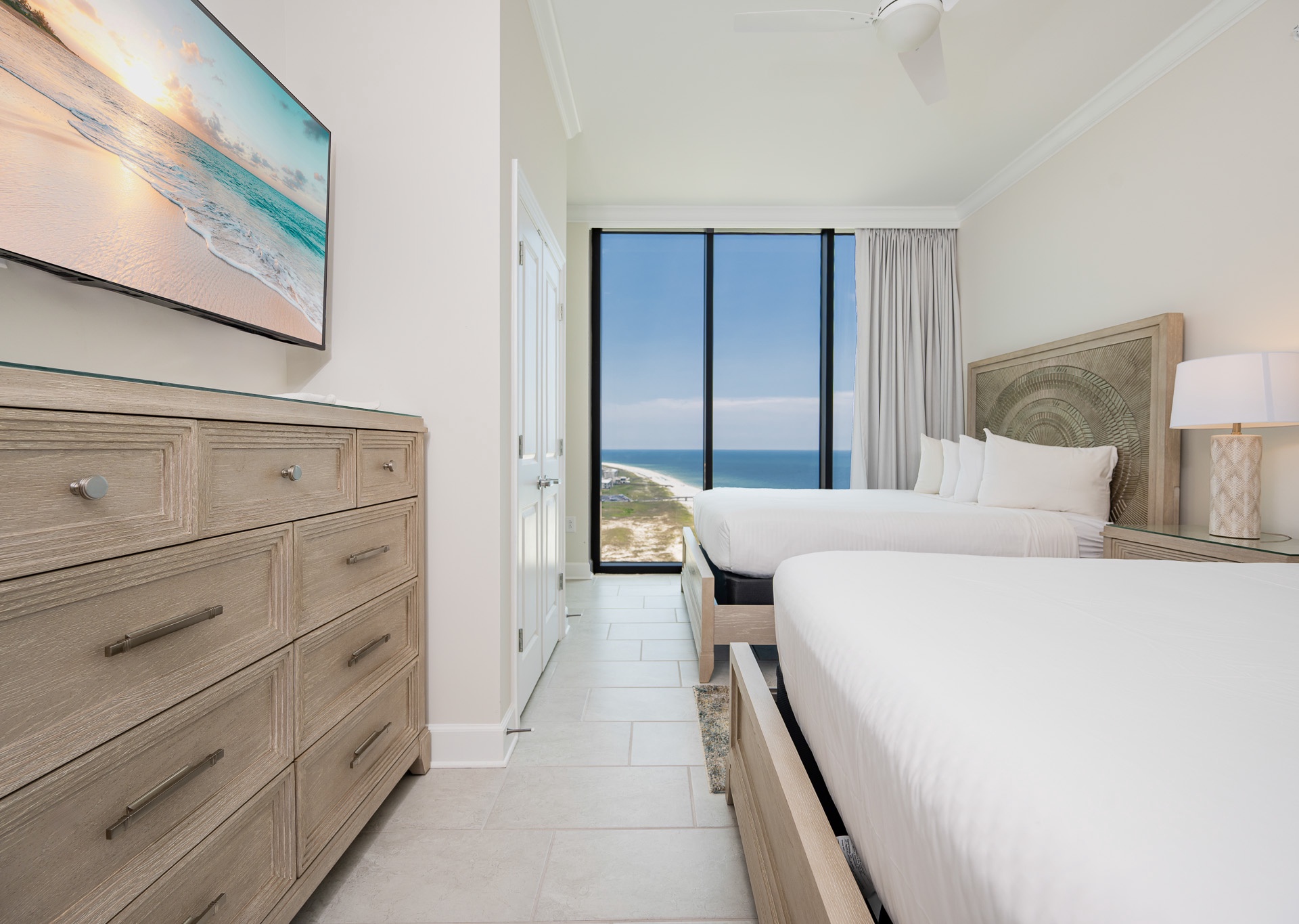• Bedroom 2: Two queen beds, floor-to-ceiling east-facing beach views, ensuite bath with walk-in shower and single vanity.