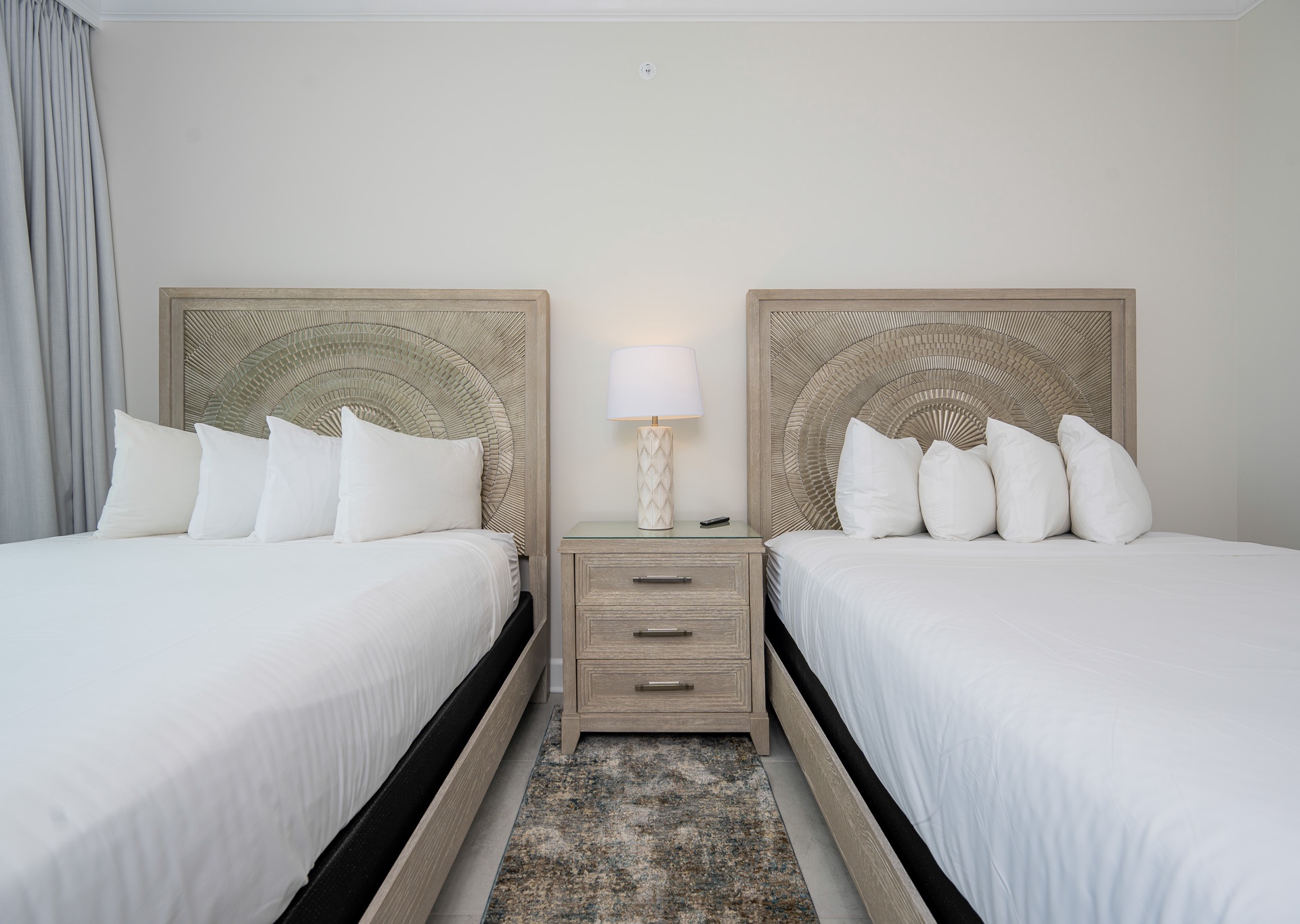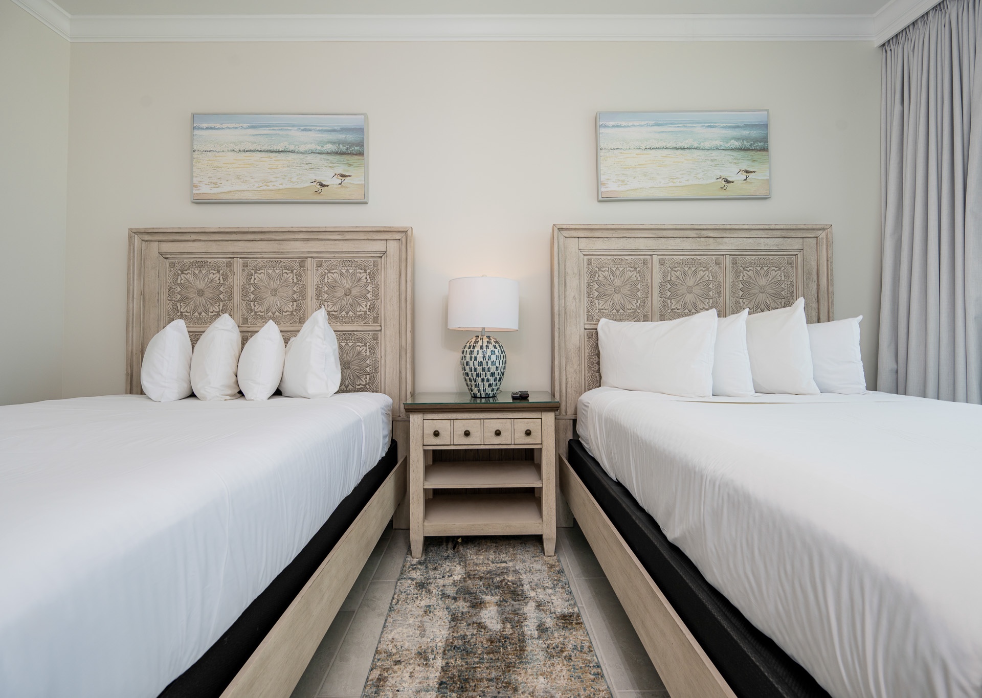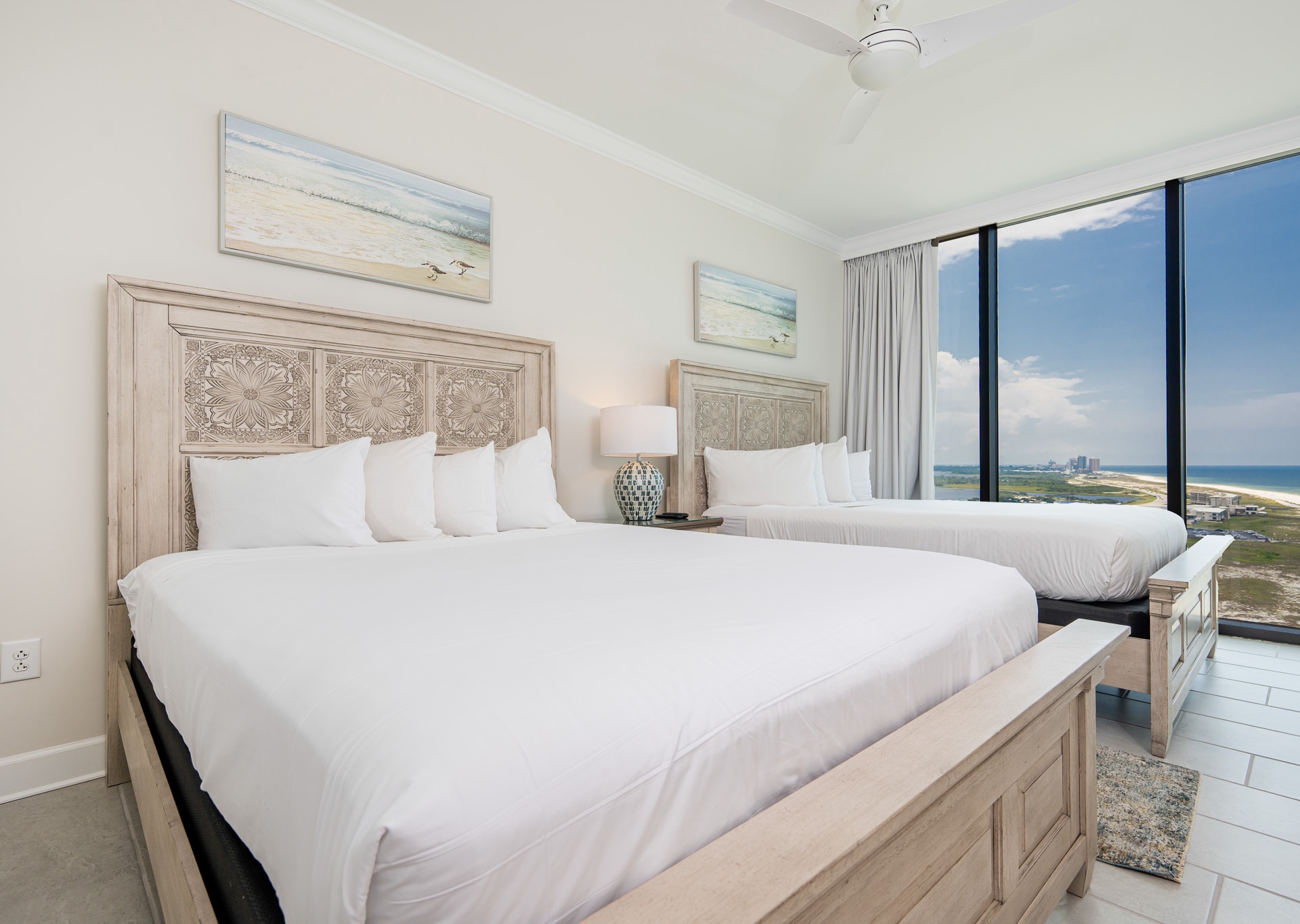 • Bedroom 2: Two queen beds, floor-to-ceiling east-facing beach views, ensuite bath with walk-in shower and single vanity.
