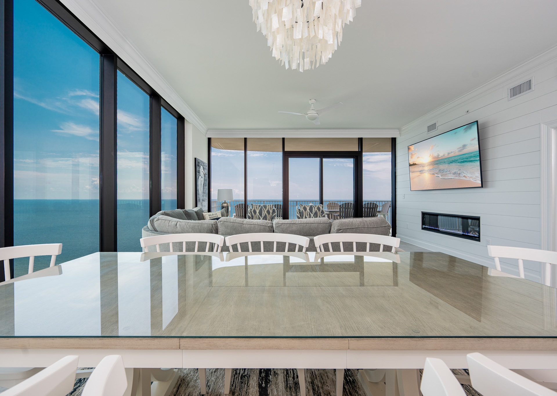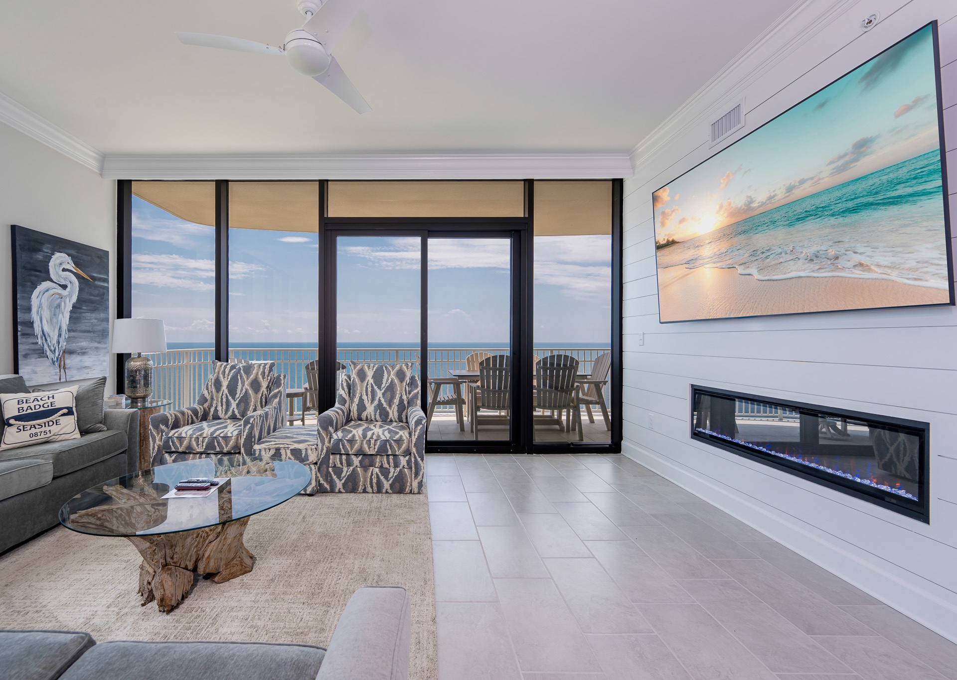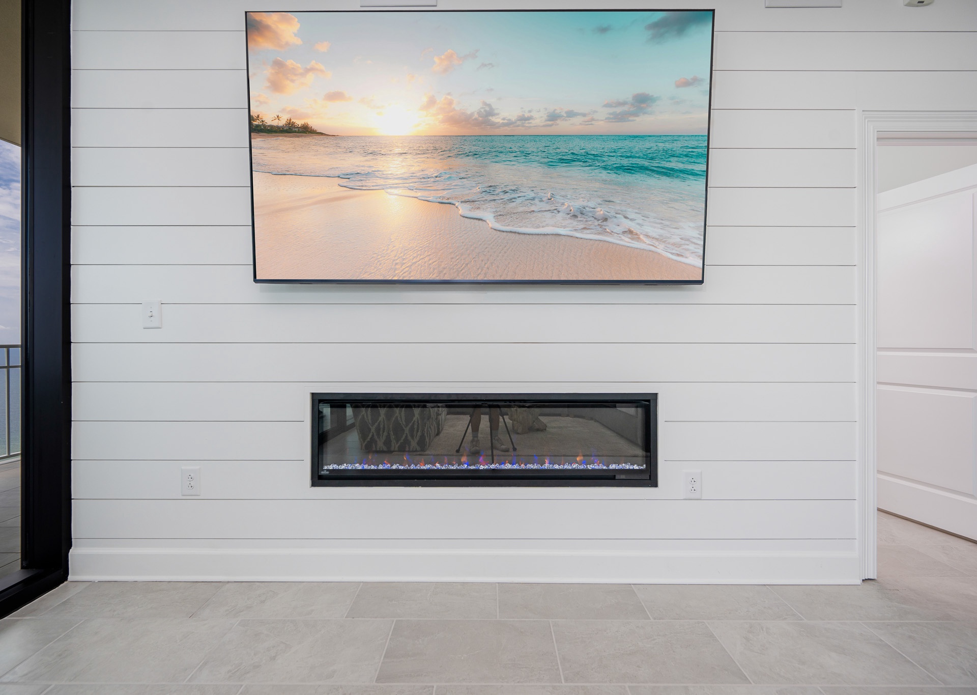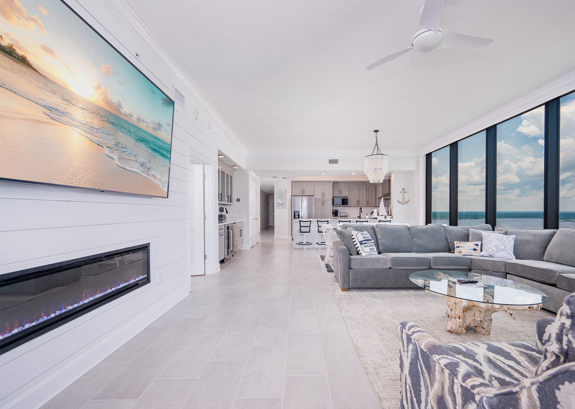 The living room features a cozy electric fireplace and a large flat-screen TV, with additional TVs throughout the condo.