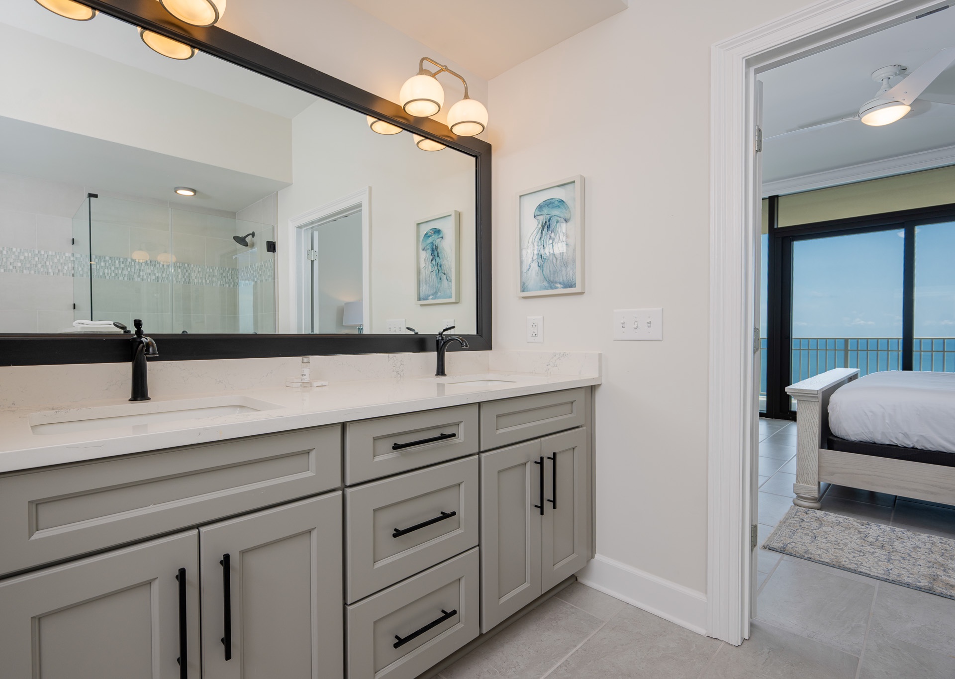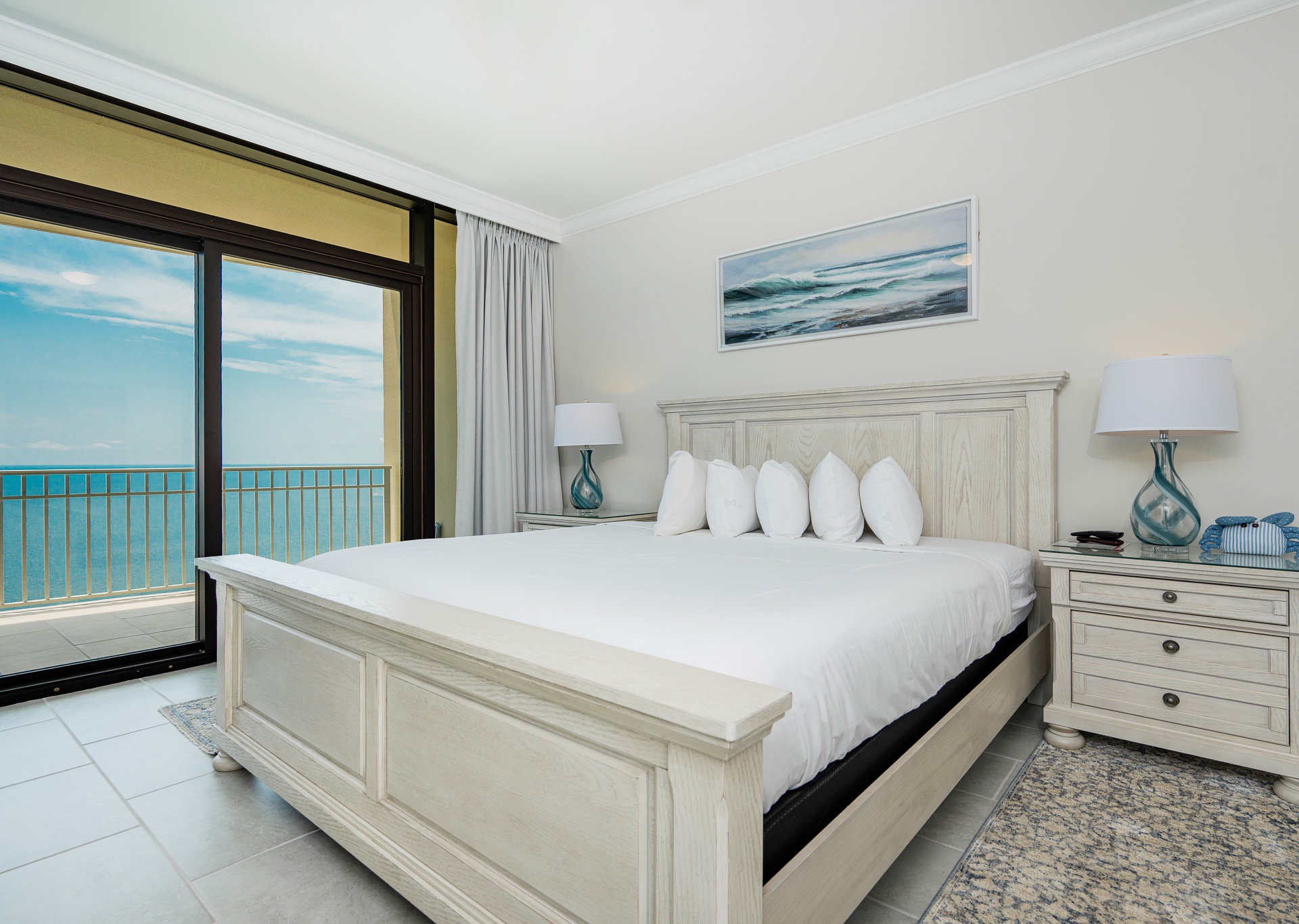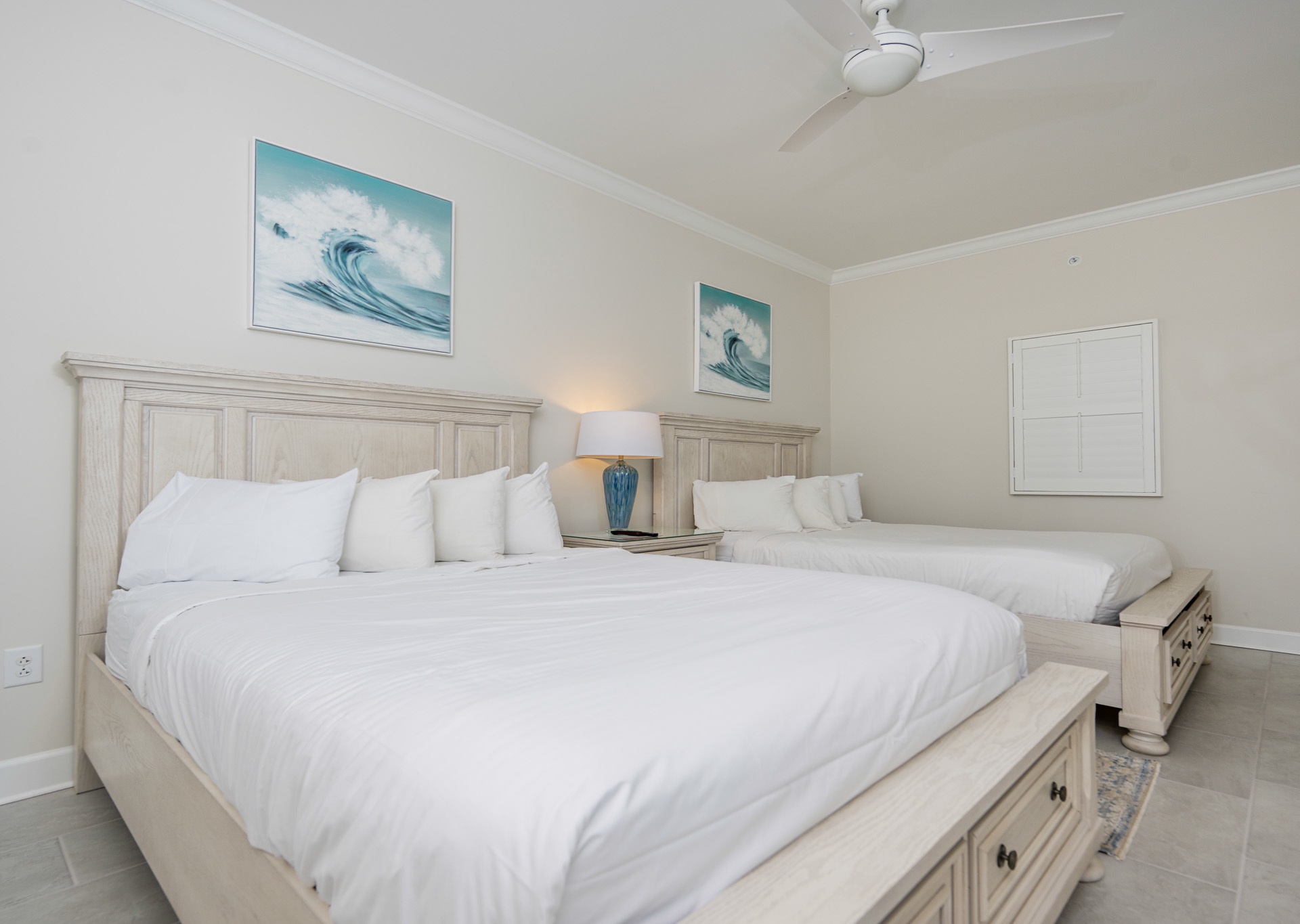 • Bedroom 3: Two queen beds, floor-to-ceiling east-facing beach views, ensuite bath with walk-in shower and single vanity.
