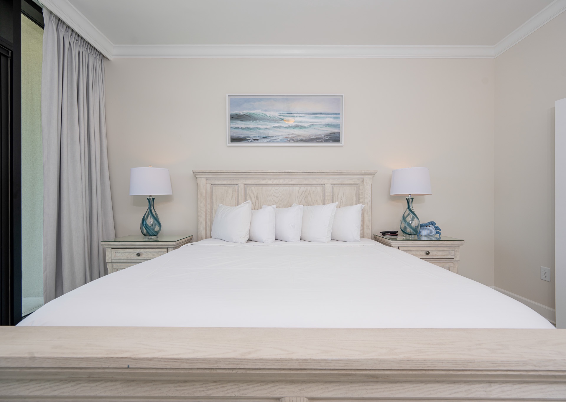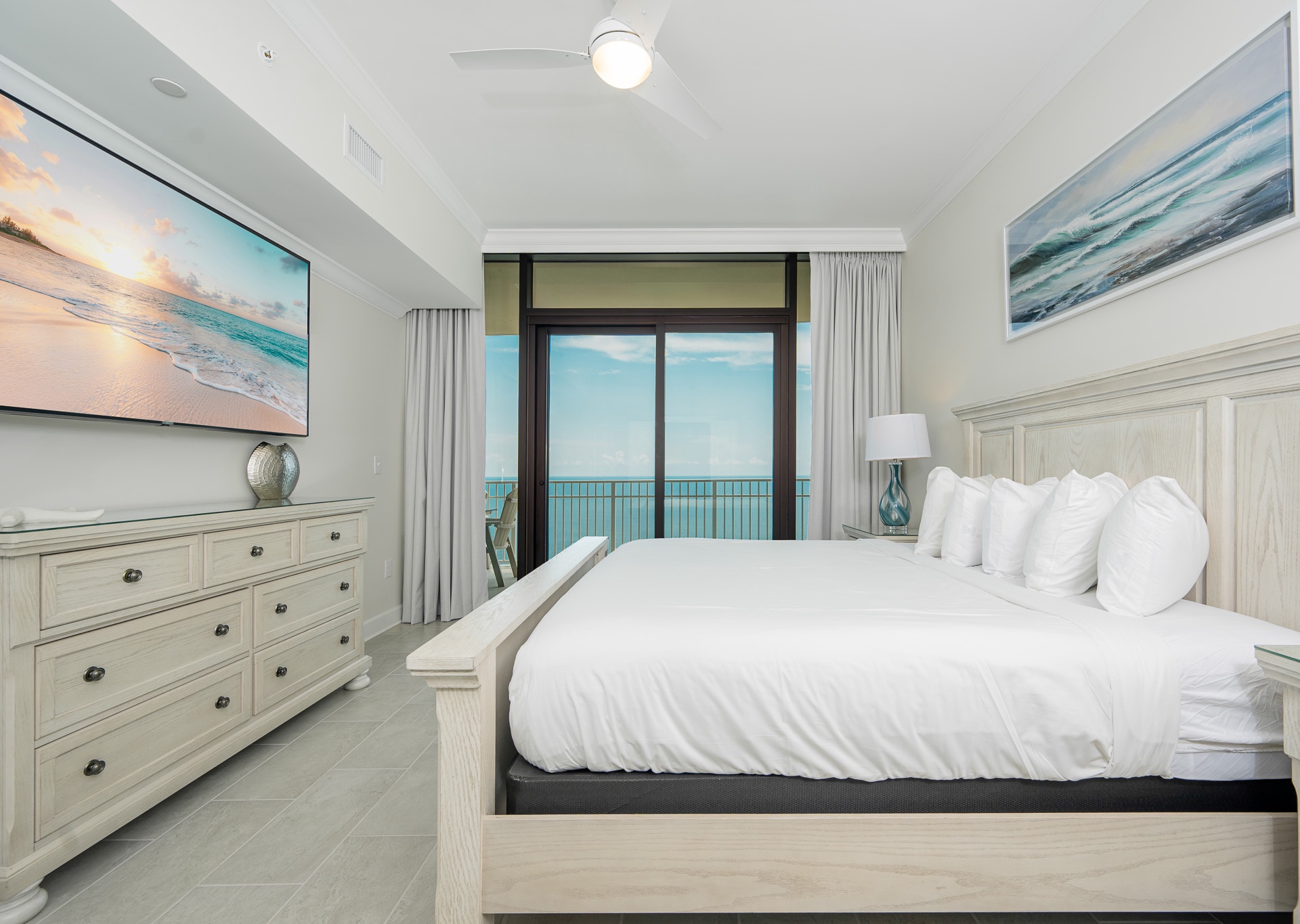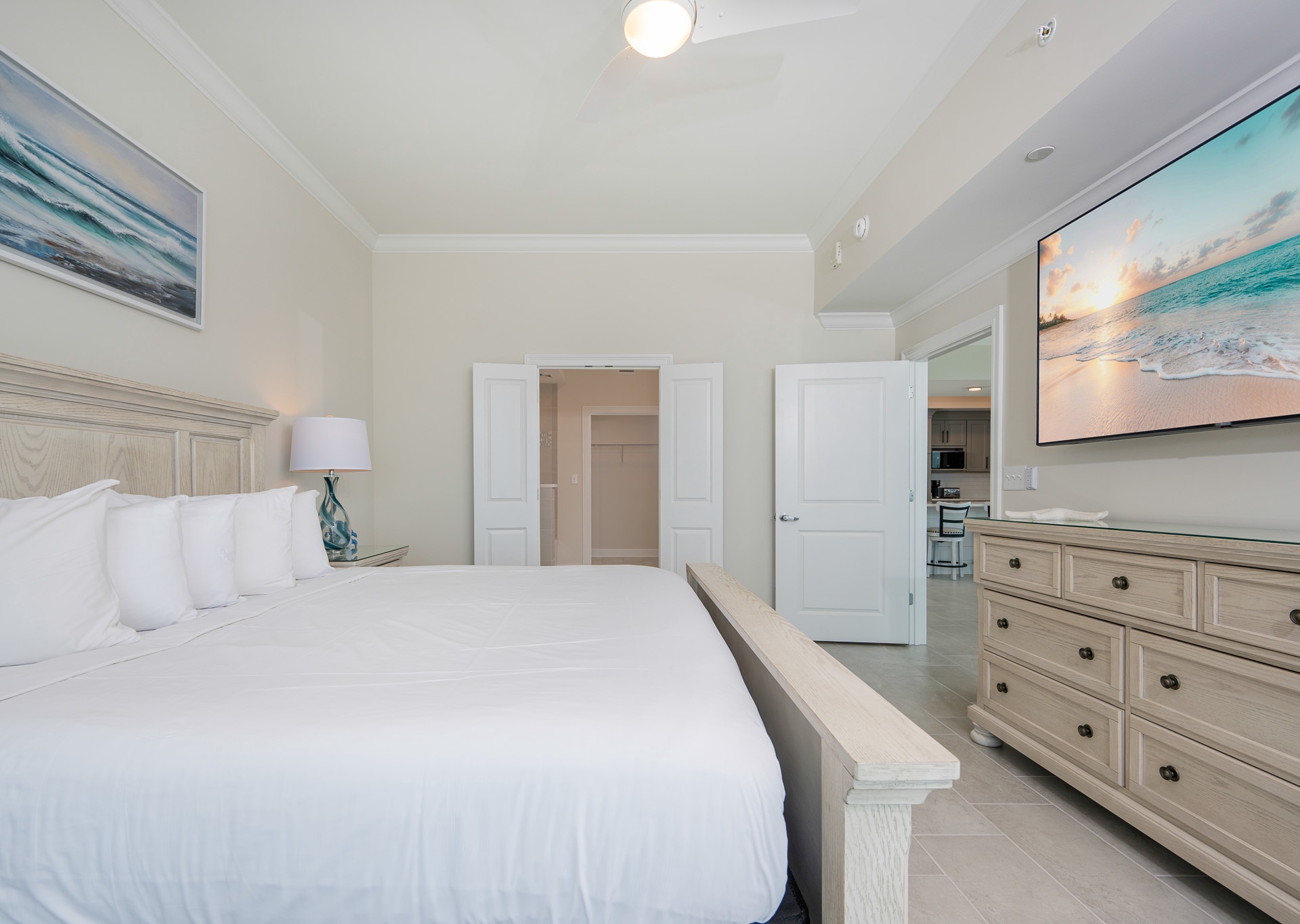 • Bedroom 3: Two queen beds, floor-to-ceiling east-facing beach views, ensuite bath with walk-in shower and single vanity.