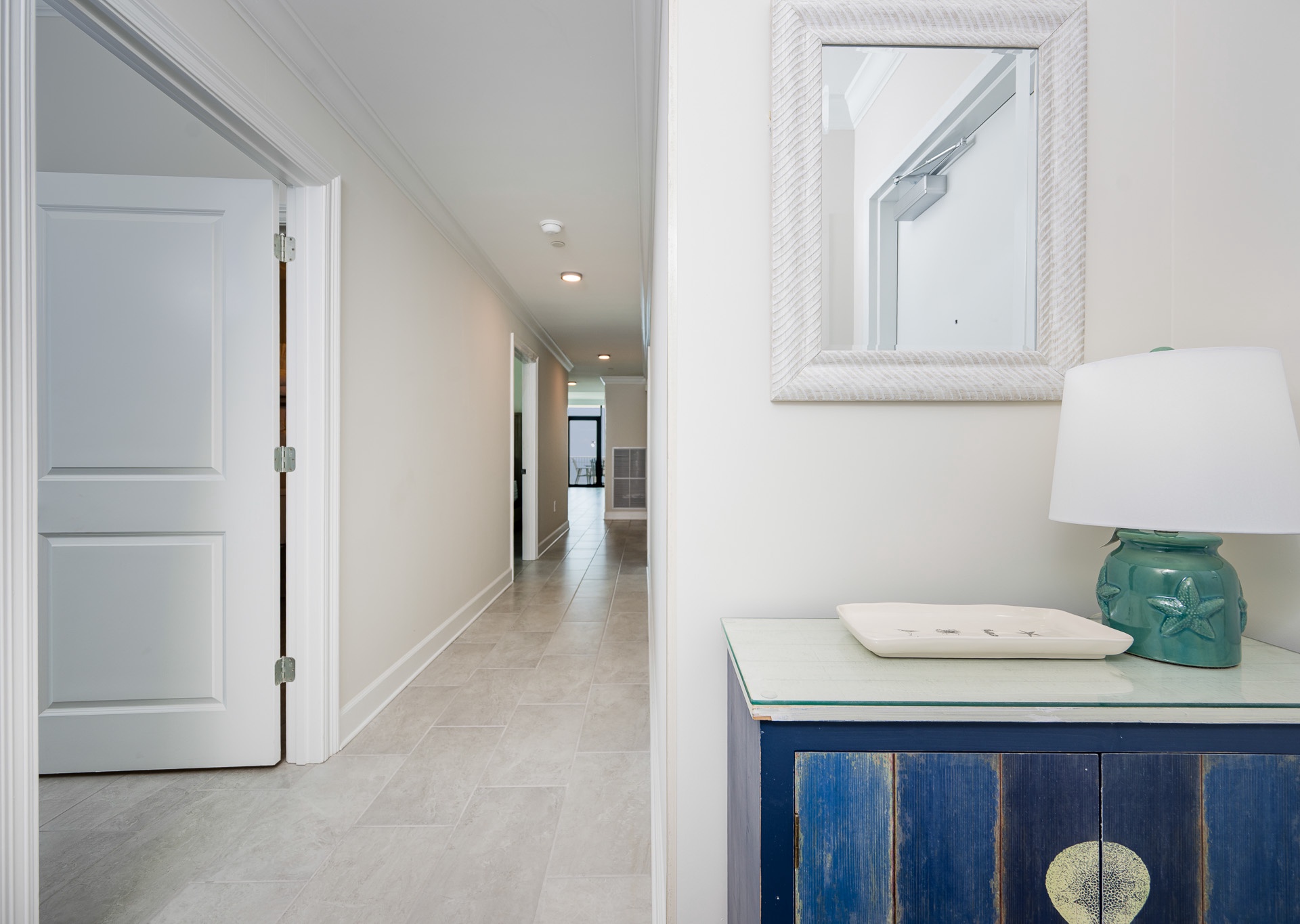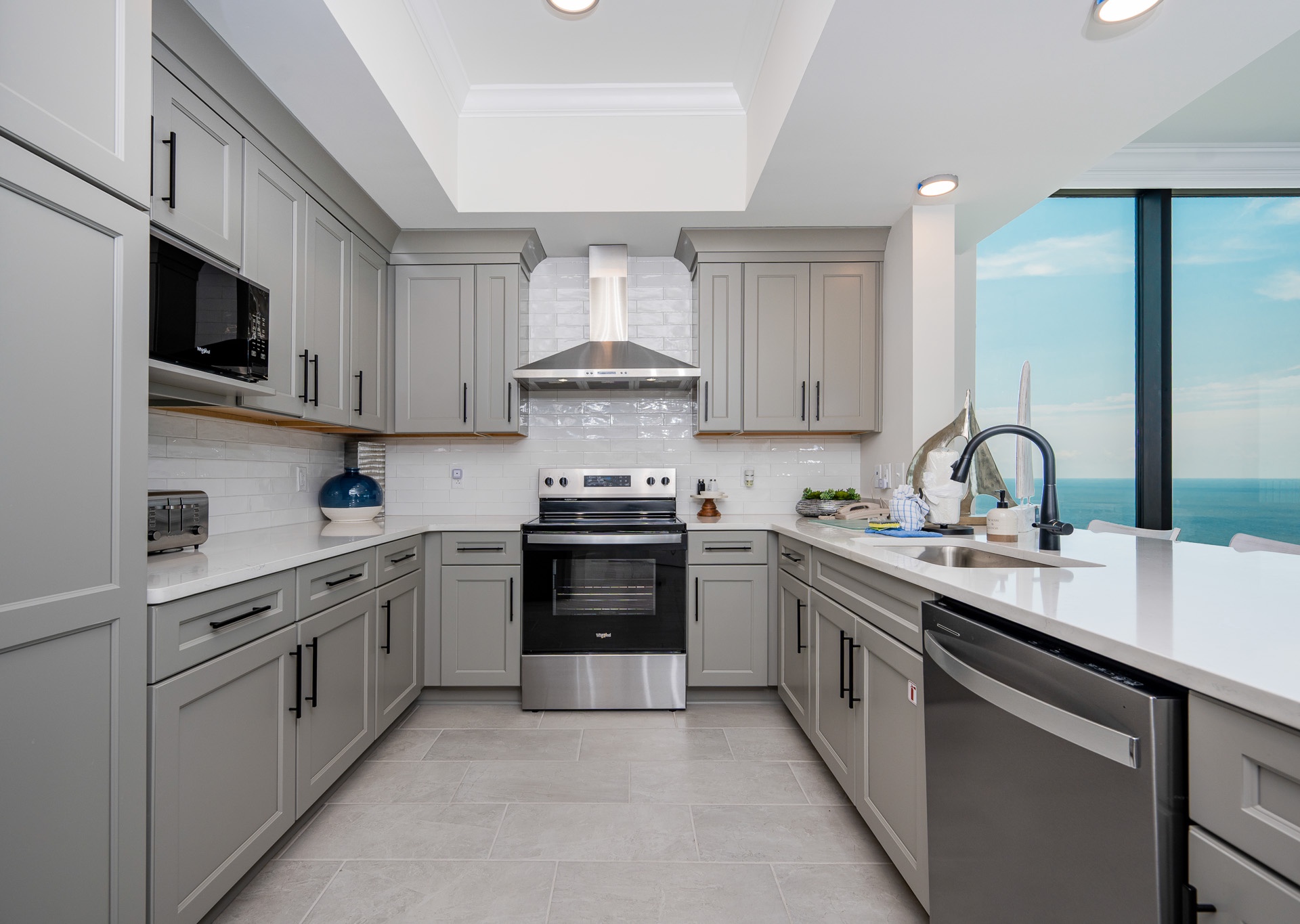 - Living areas with floor-to-ceiling windows, 10-foot smooth ceilings, large tile flooring, and crown molding.