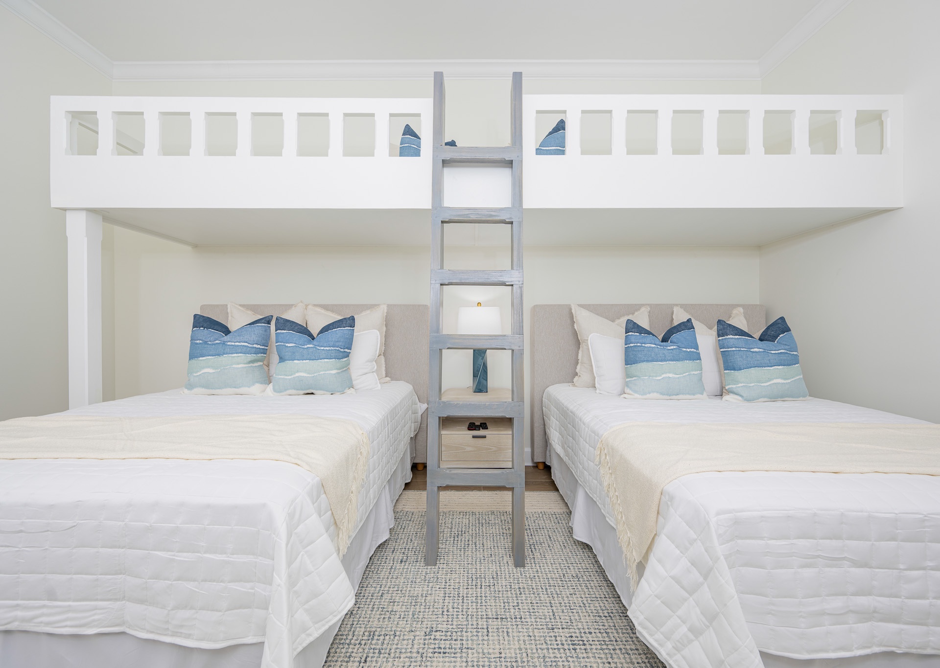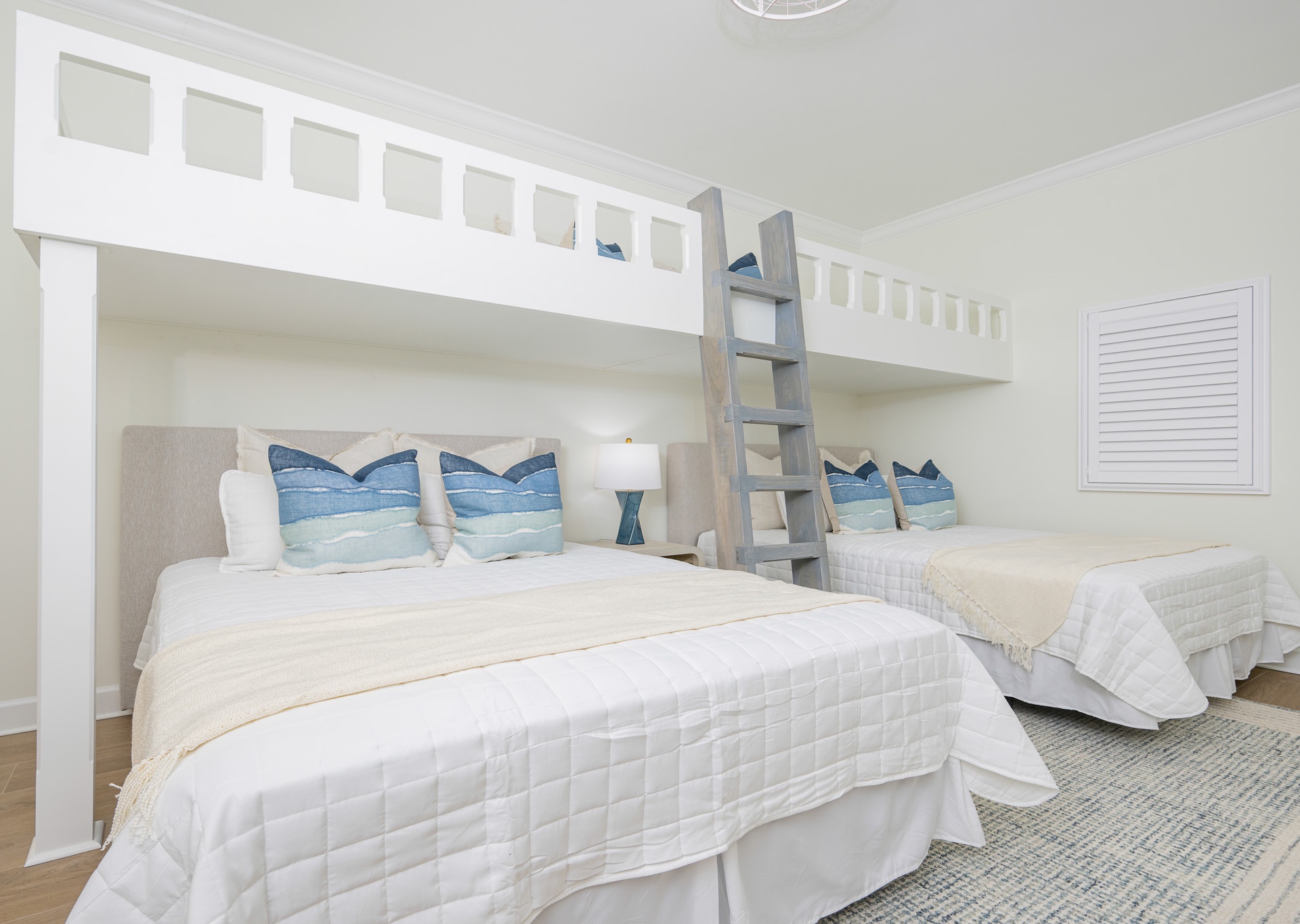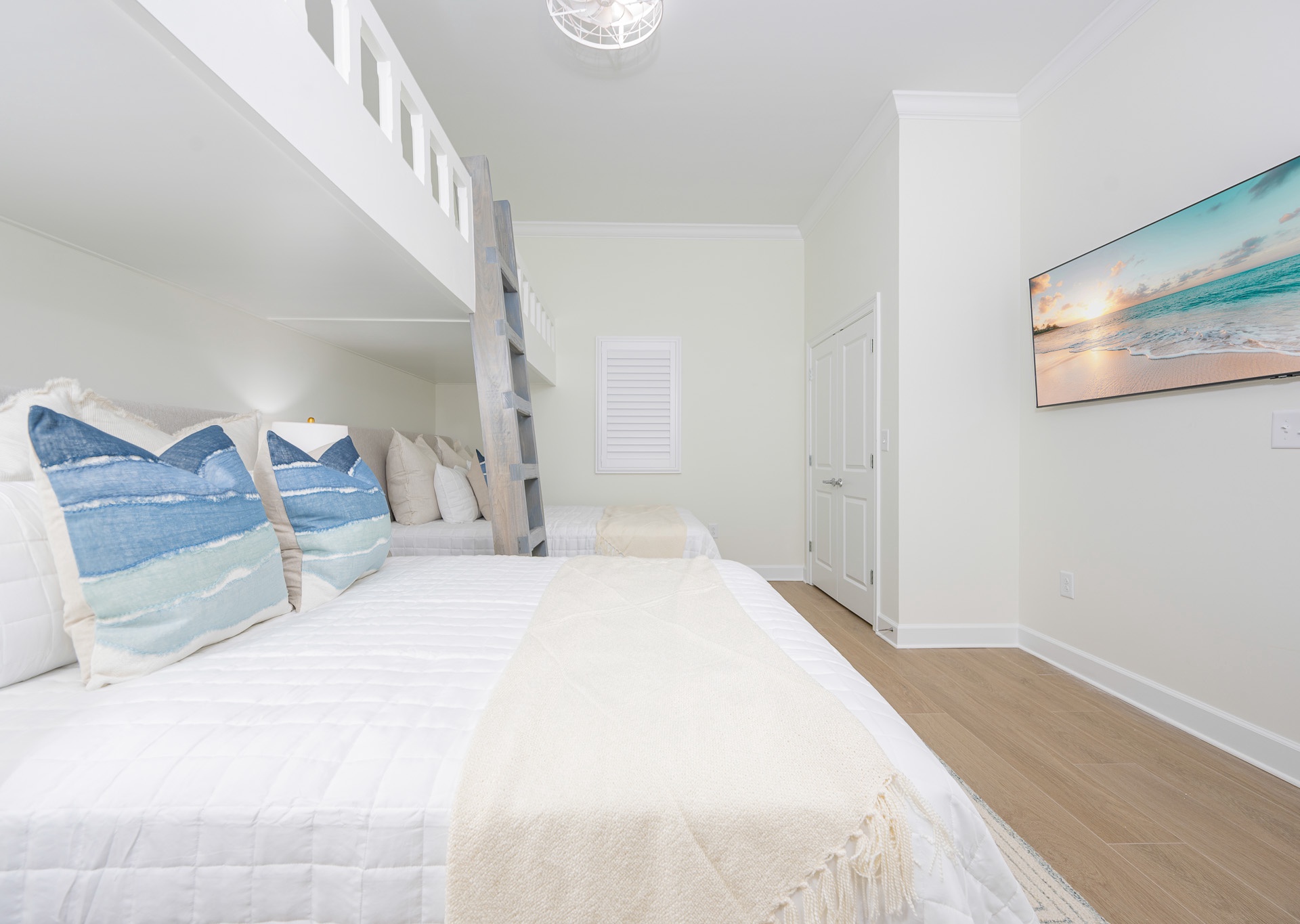 The master suite offers a king bed, accent wall, cozy chair, balcony access with sliding doors, and its own en-suite bathroom featuring a double vanity, soaking tub, and walk-in shower. The second bedroom is designed with families in mind, offering two queen beds plus built-in loft bunk beds above—a fun and practical sleeping setup for kids and teens. The third bedroom also includes two queen beds, with a bathroom that can be accessed from the room or hallway, complete with a walk-in shower and single vanity. A second full bathroom features a tub/shower combo.