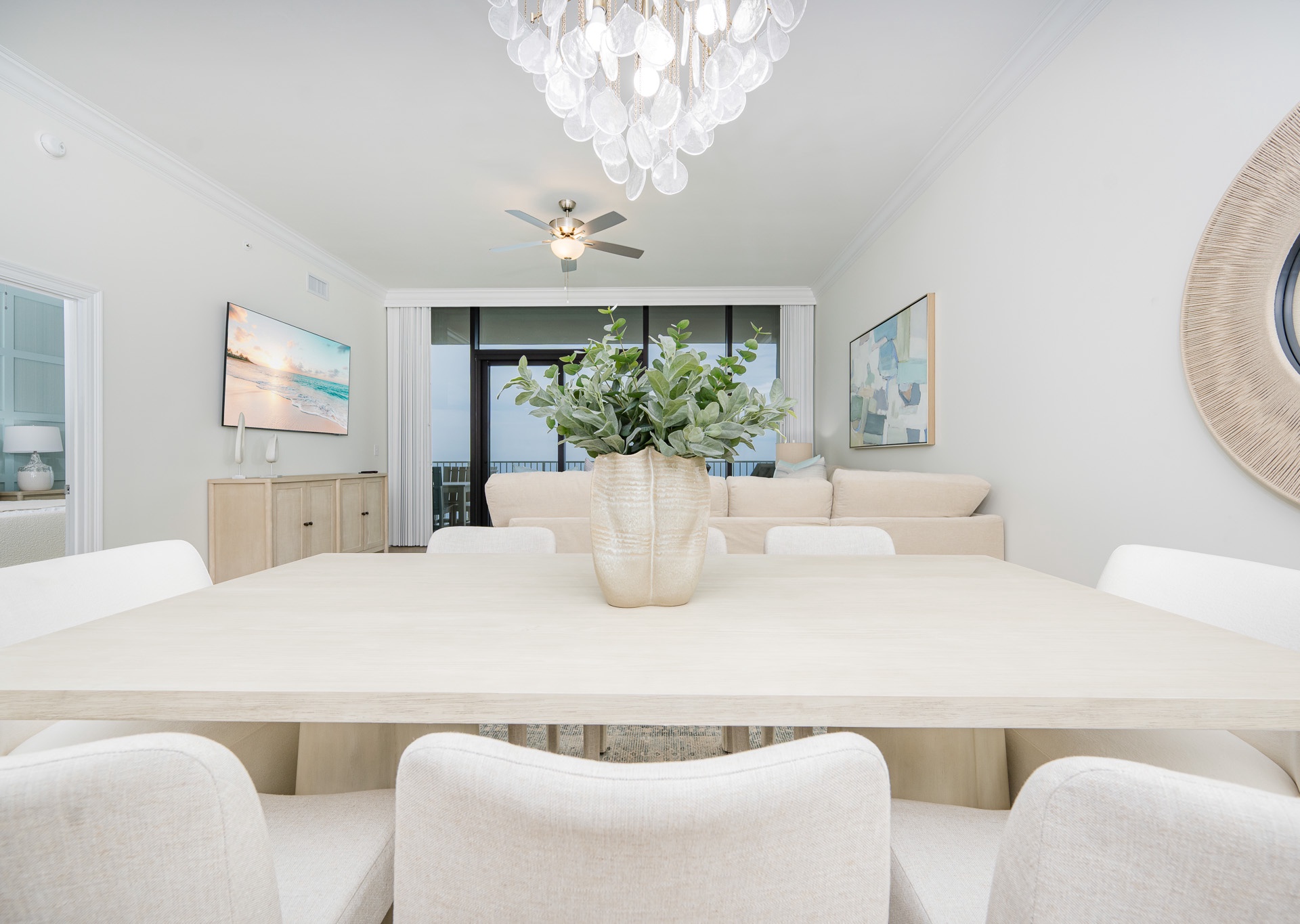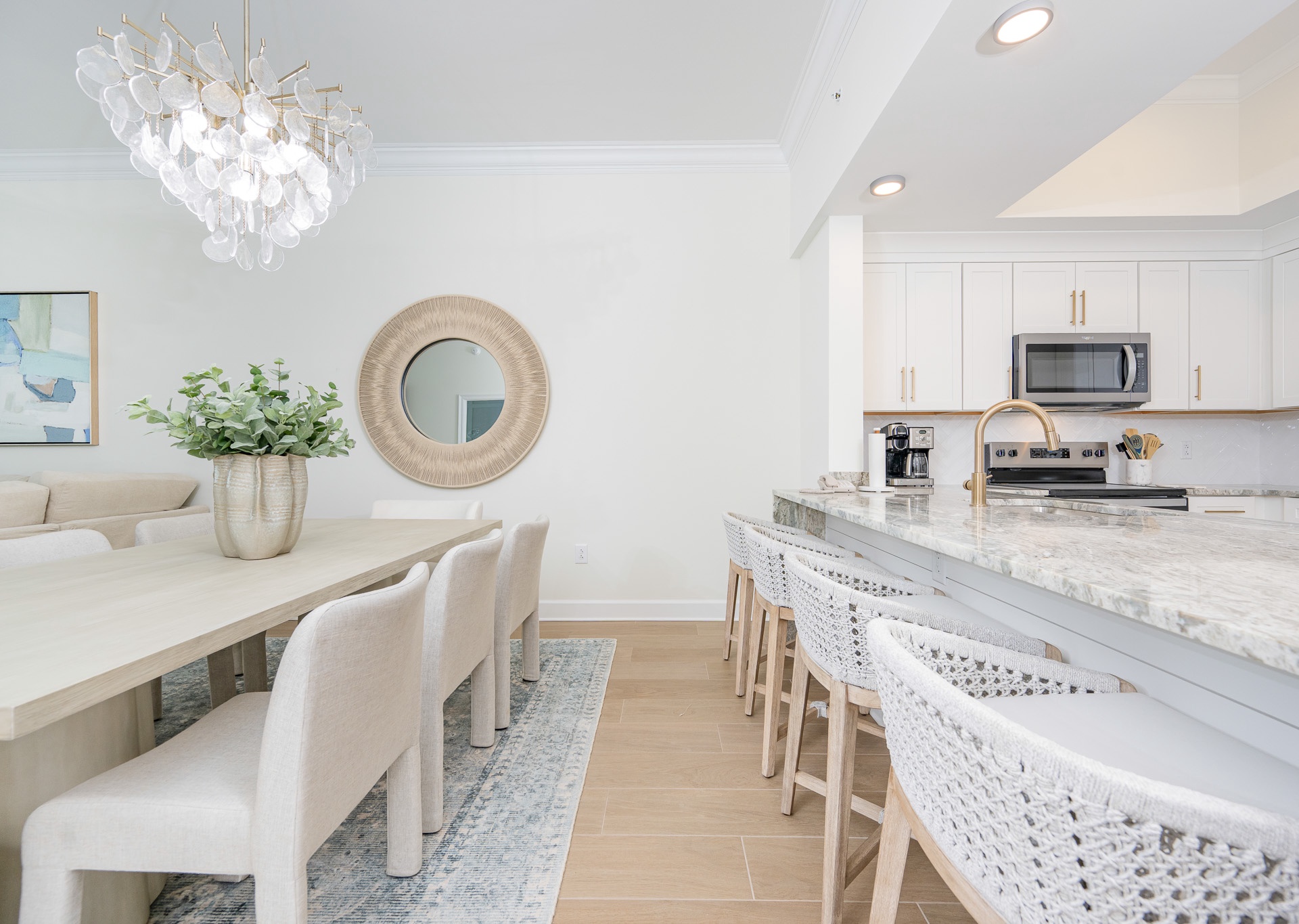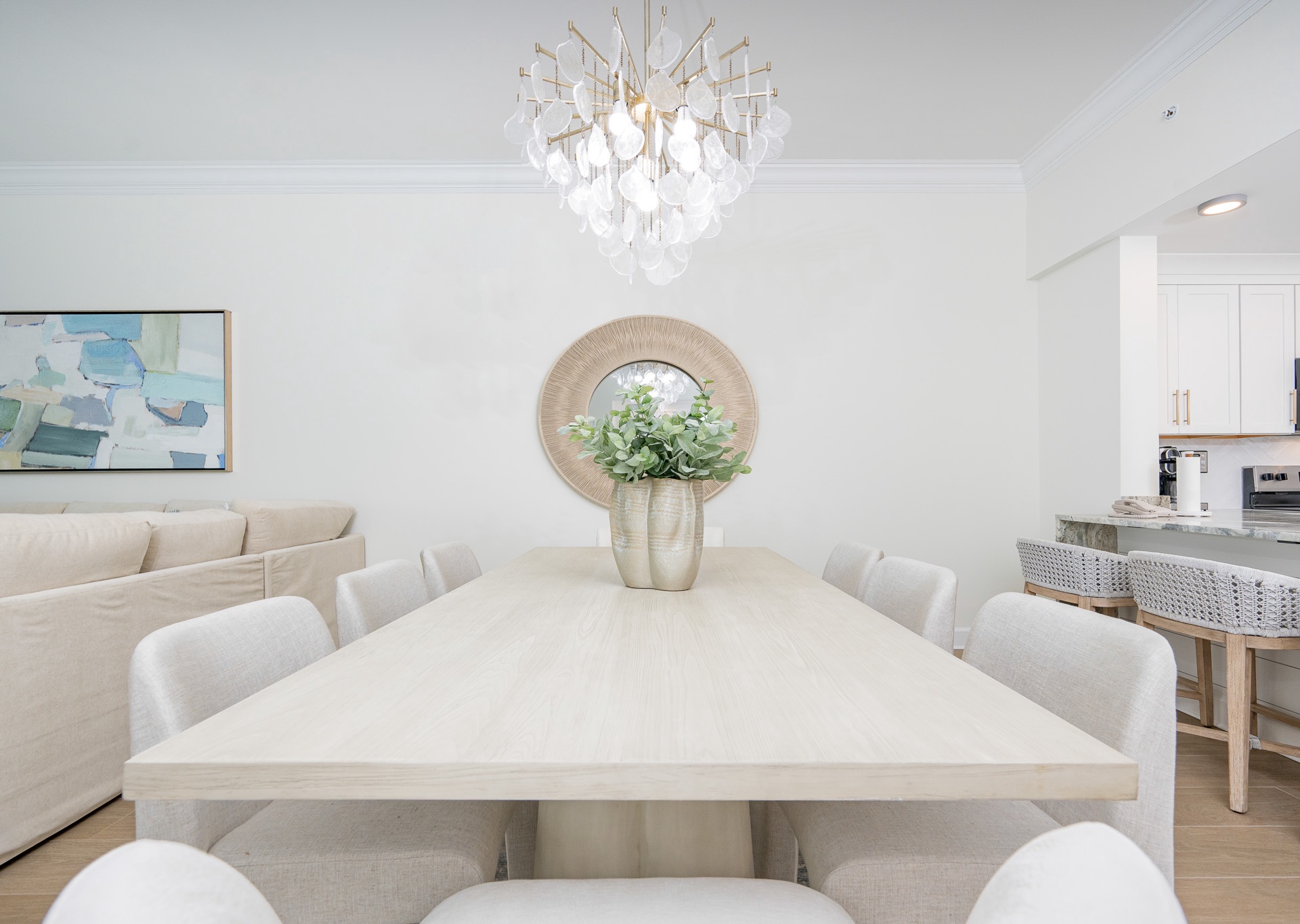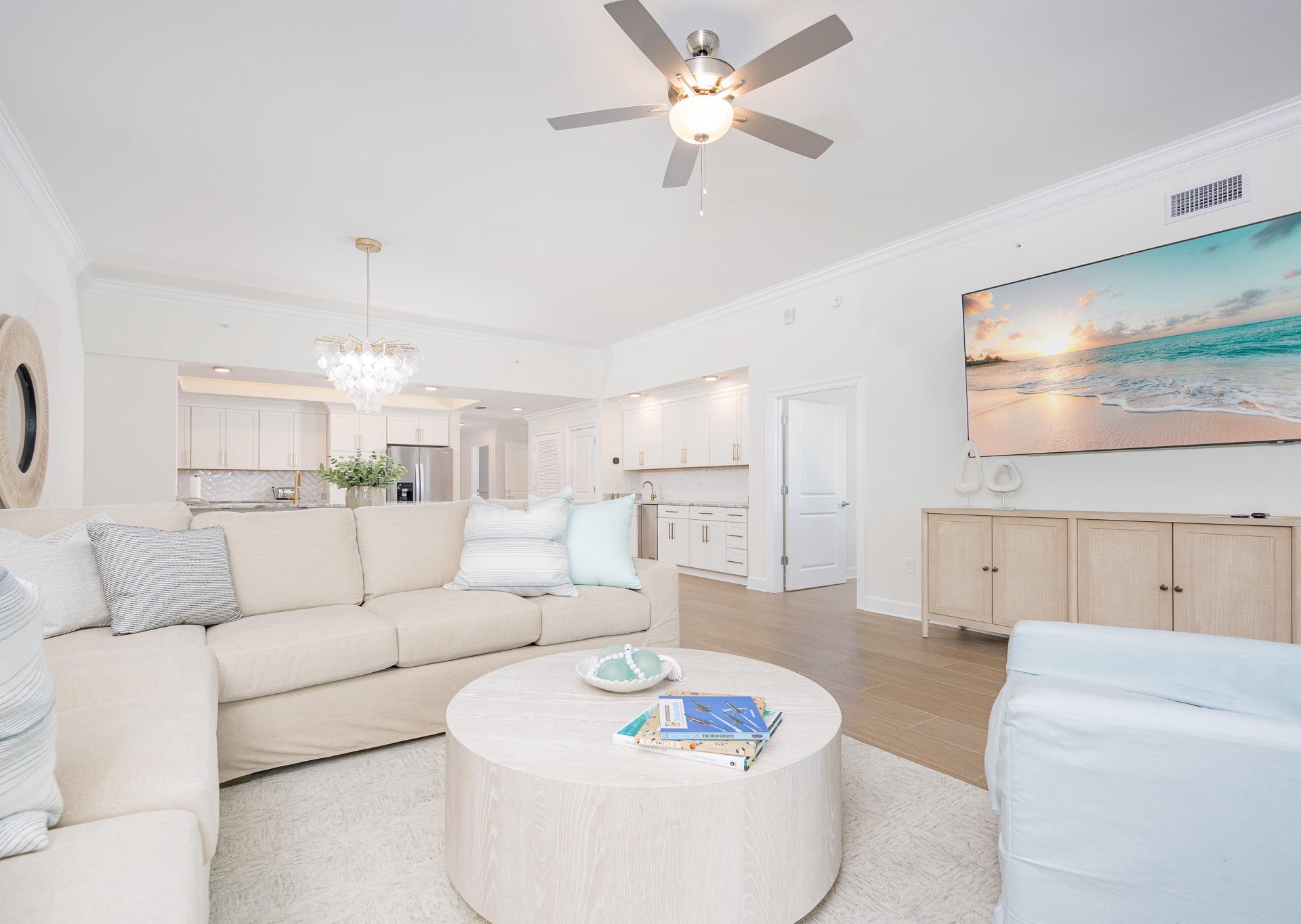 The open living area is both inviting and spacious, featuring a large sectional sofa, swivel chair, ceiling fan, and a wall-mounted flat-screen TV. Gather around the dining table for eight, lit by a beautiful chandelier and surrounded by comfortable fabric chairs, or pull up a seat at the breakfast bar with four barstools. The kitchen is well-appointed with white cabinetry, stainless steel appliances, inset sink, gorgeous countertops, and both a Keurig and regular coffee maker.