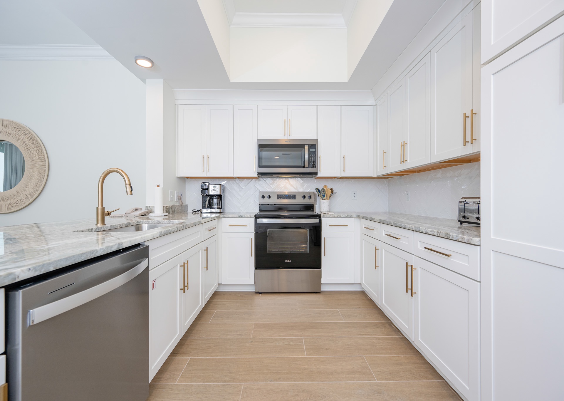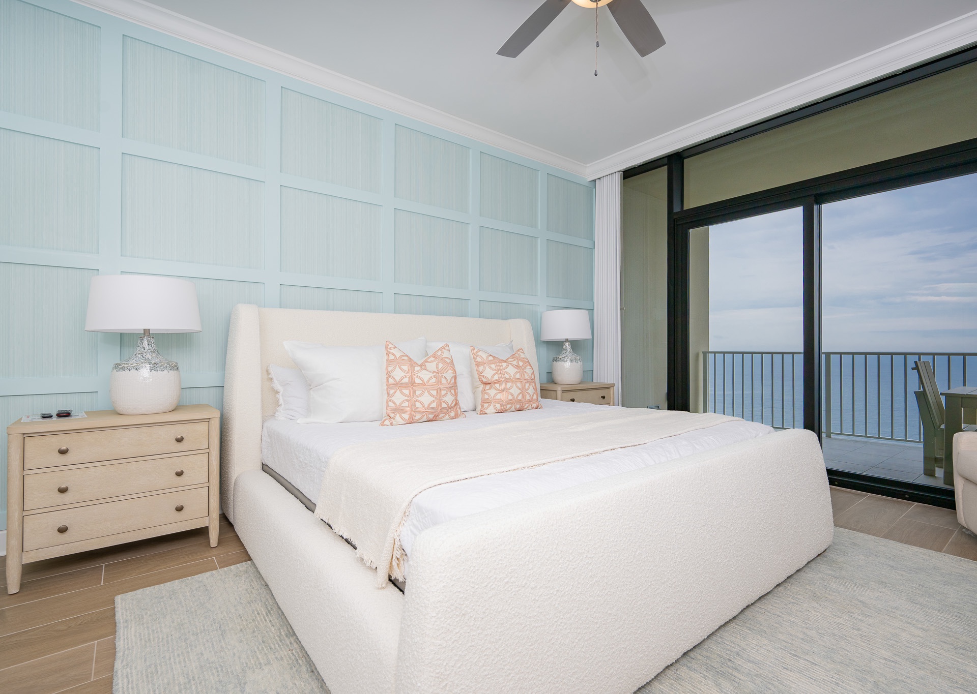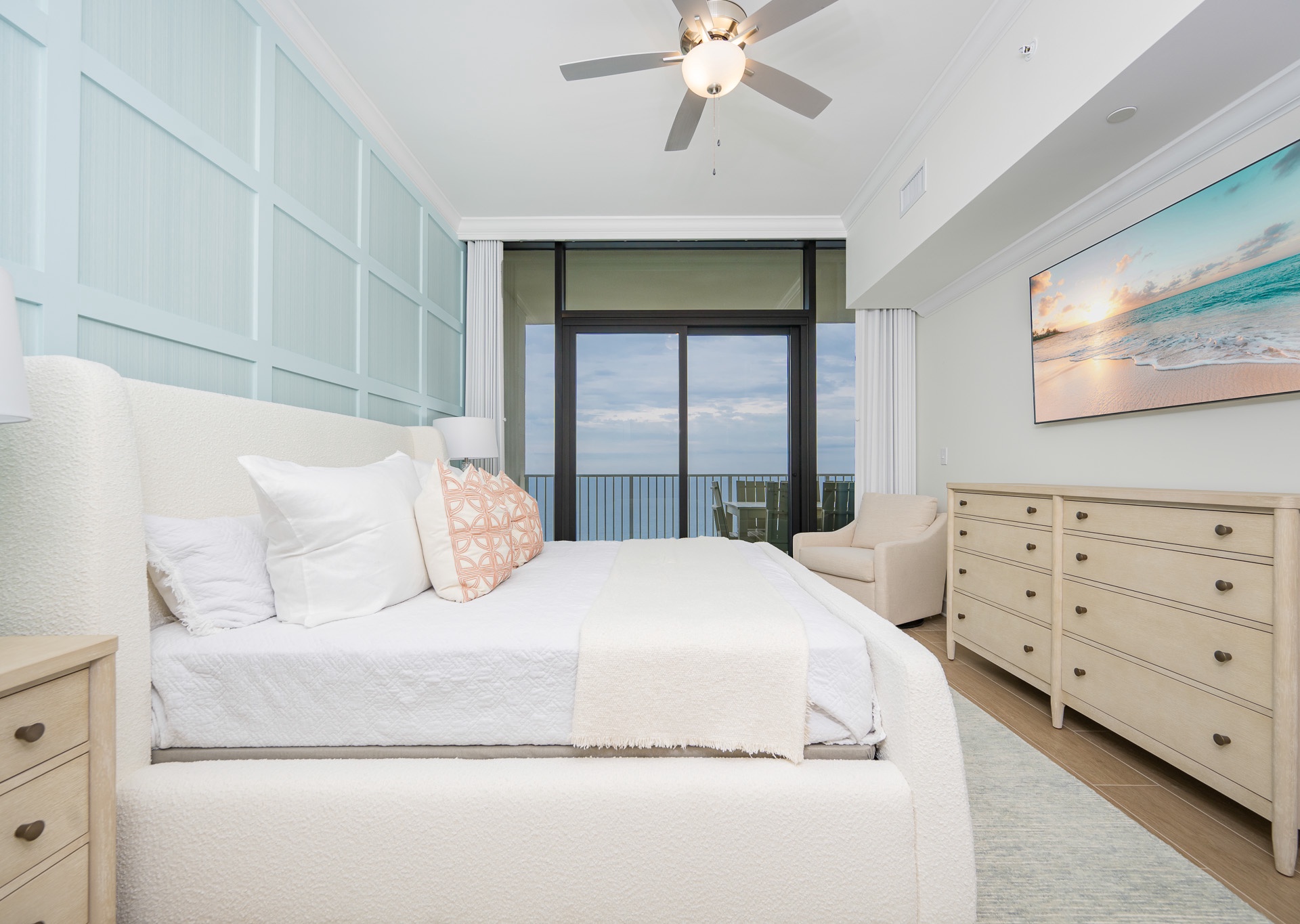 • Beautiful décor with gold accents, accent walls, and stylish touches that make it feel like a true coastal retreat
