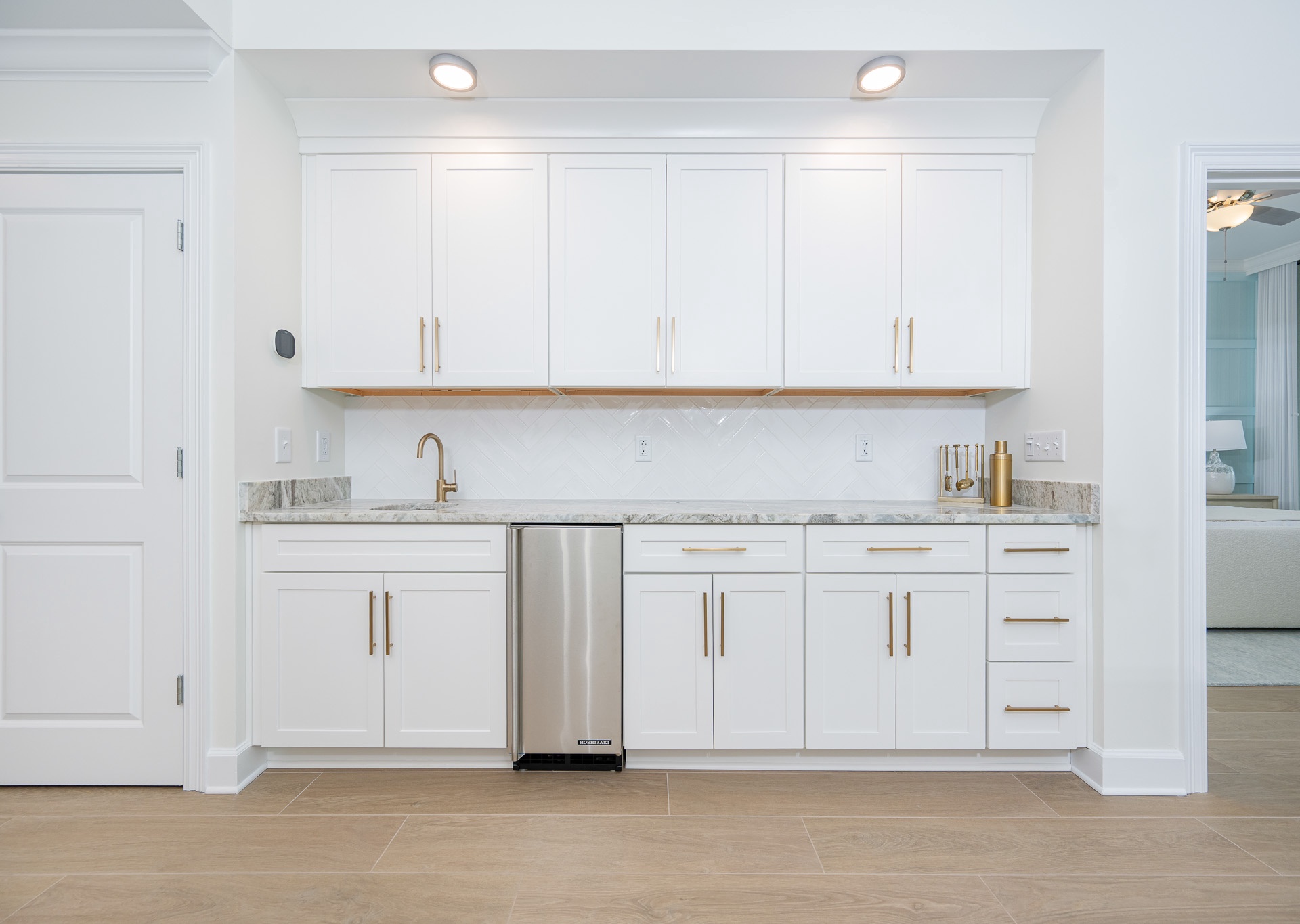 For entertaining, there’s also a separate wet bar with gold accents, tile backsplash, your own ice maker, and a small sink—perfect for mixing drinks or setting up a snack station.