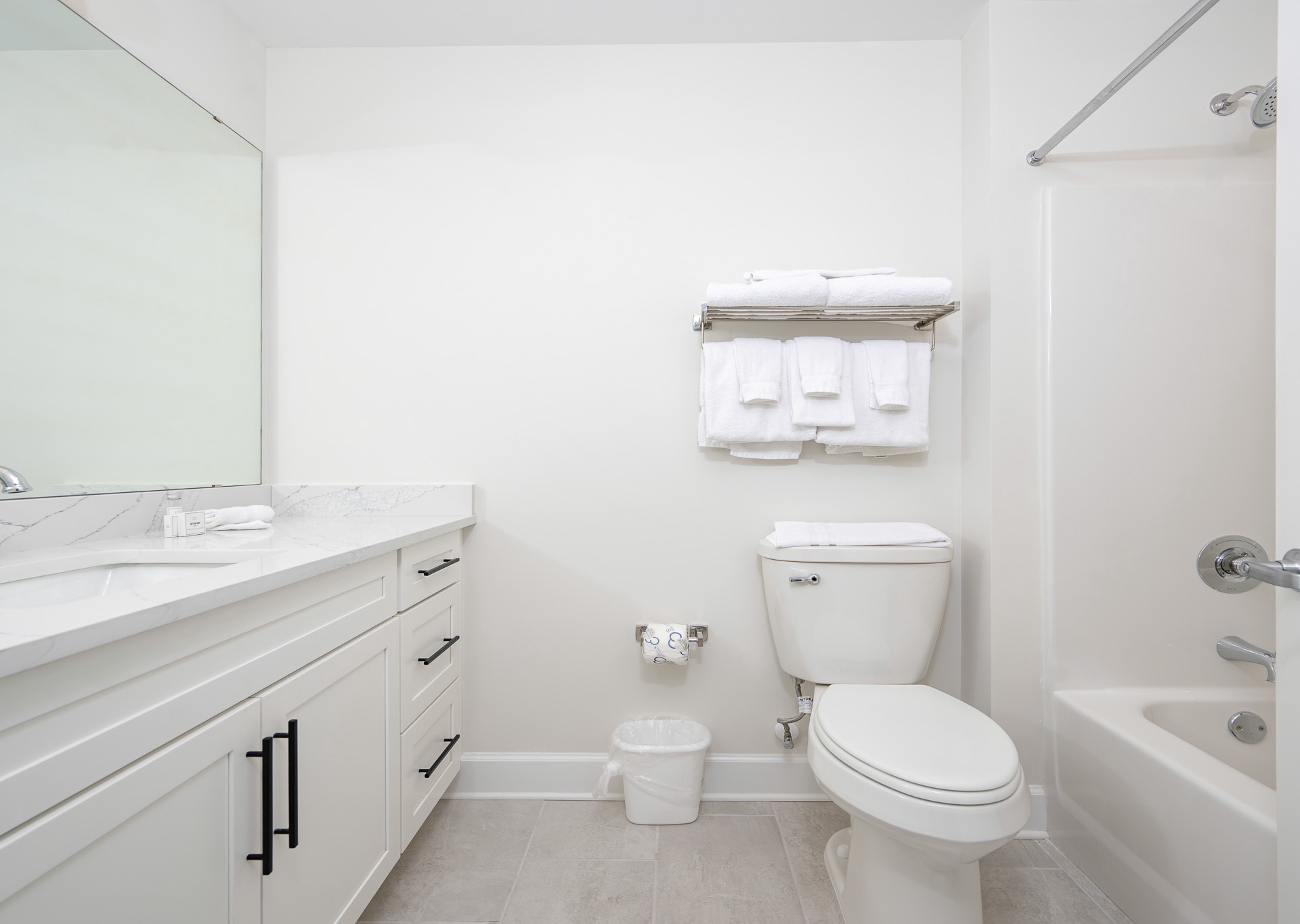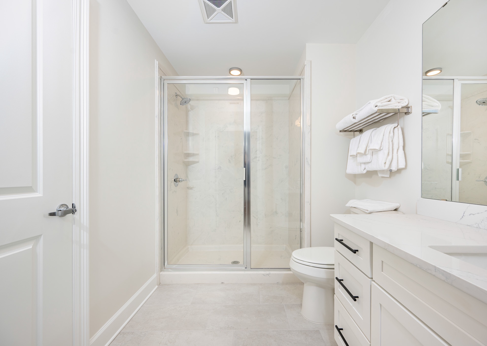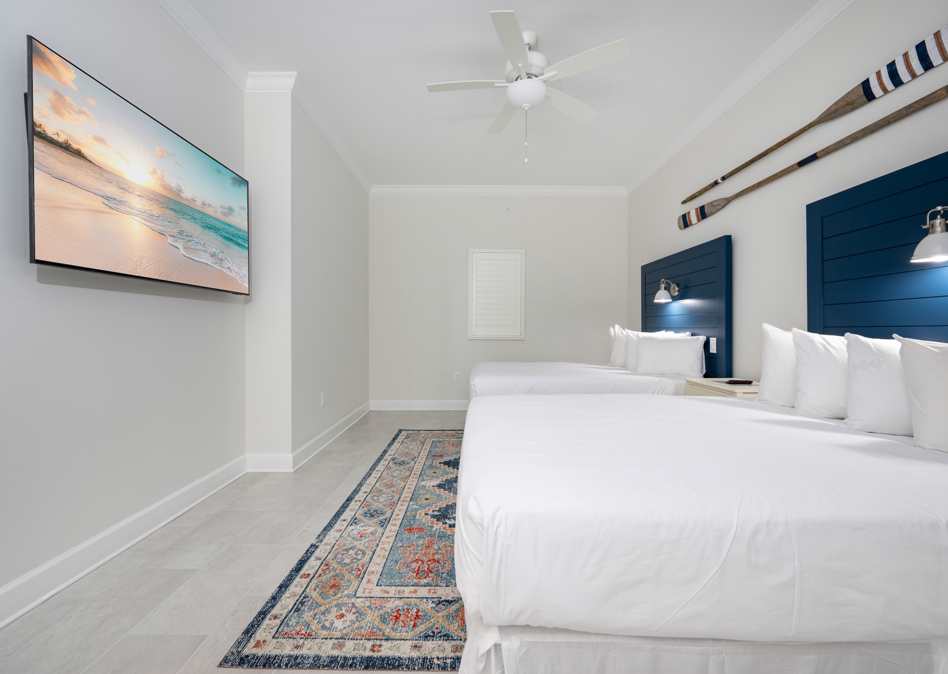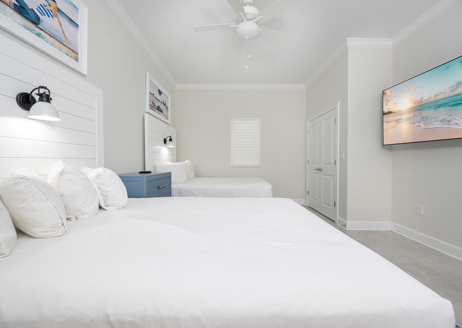 The master suite is a true retreat, featuring a king bed, private balcony access, double vanity, walk-in shower, and a luxurious soaking tub. Both guest bedrooms are spacious, each with two queen beds and their own private bathrooms, one with a tub/shower combination and single vanity, and the other with a convenient walk-in shower accessible from both the bedroom and hall.
