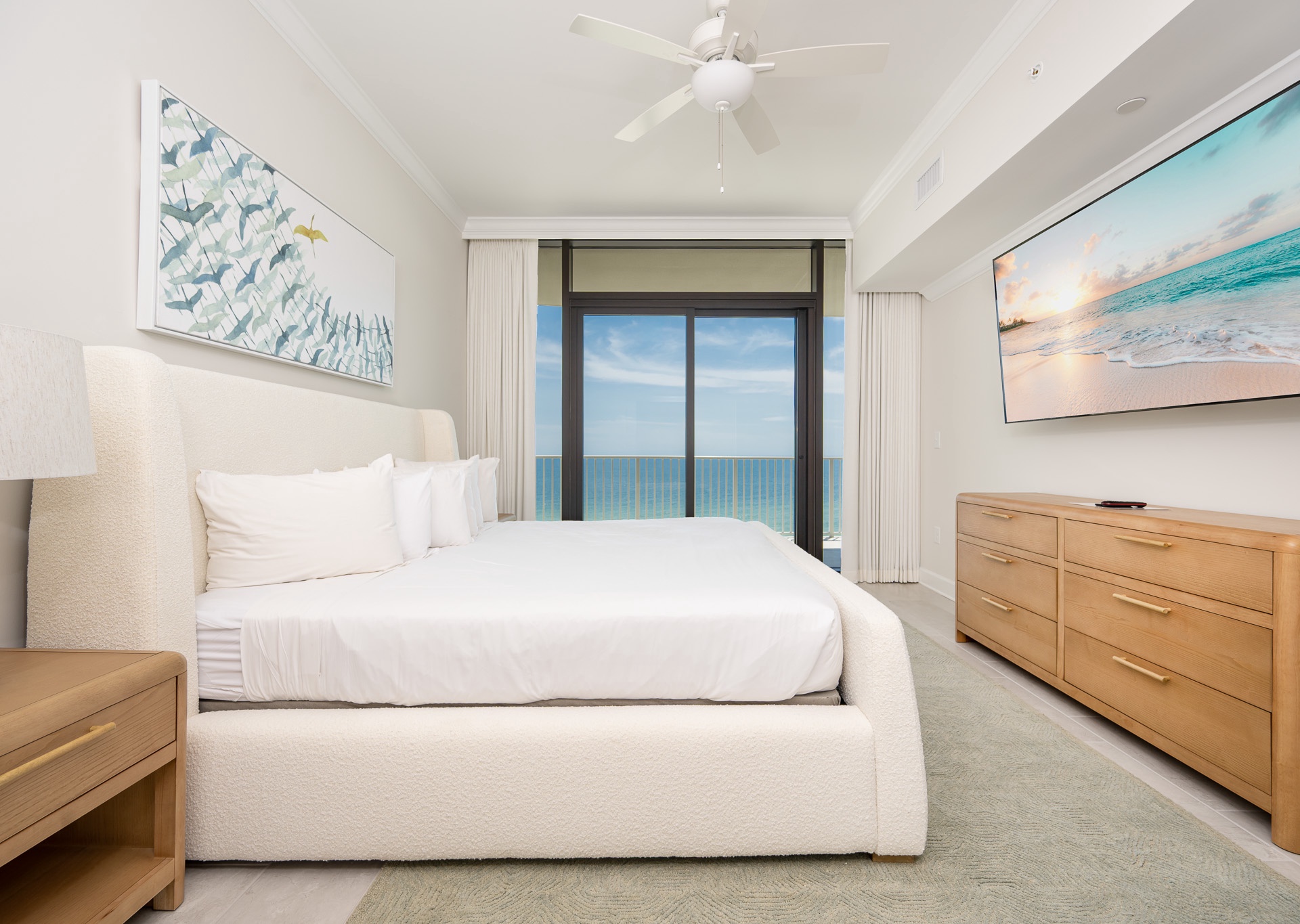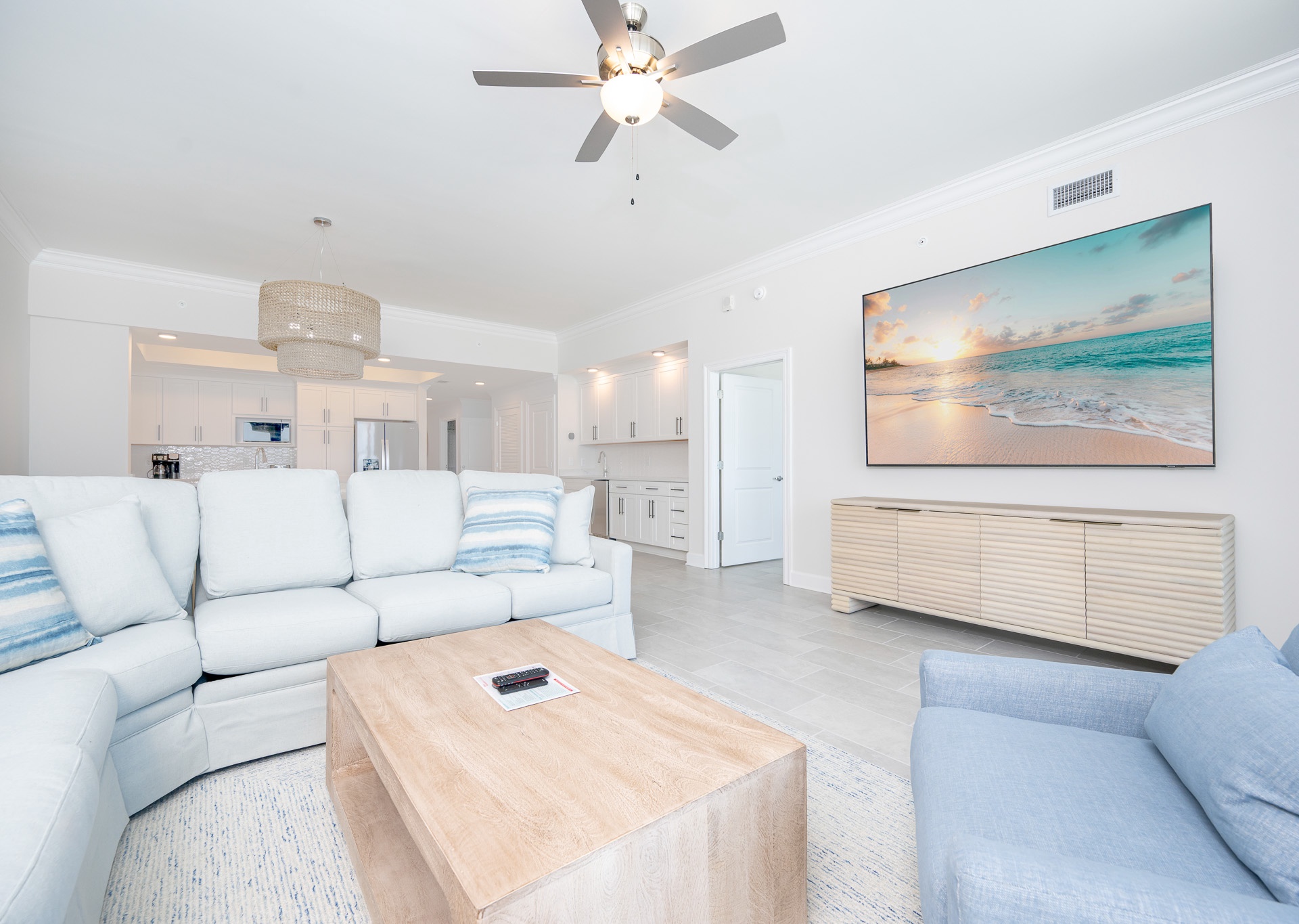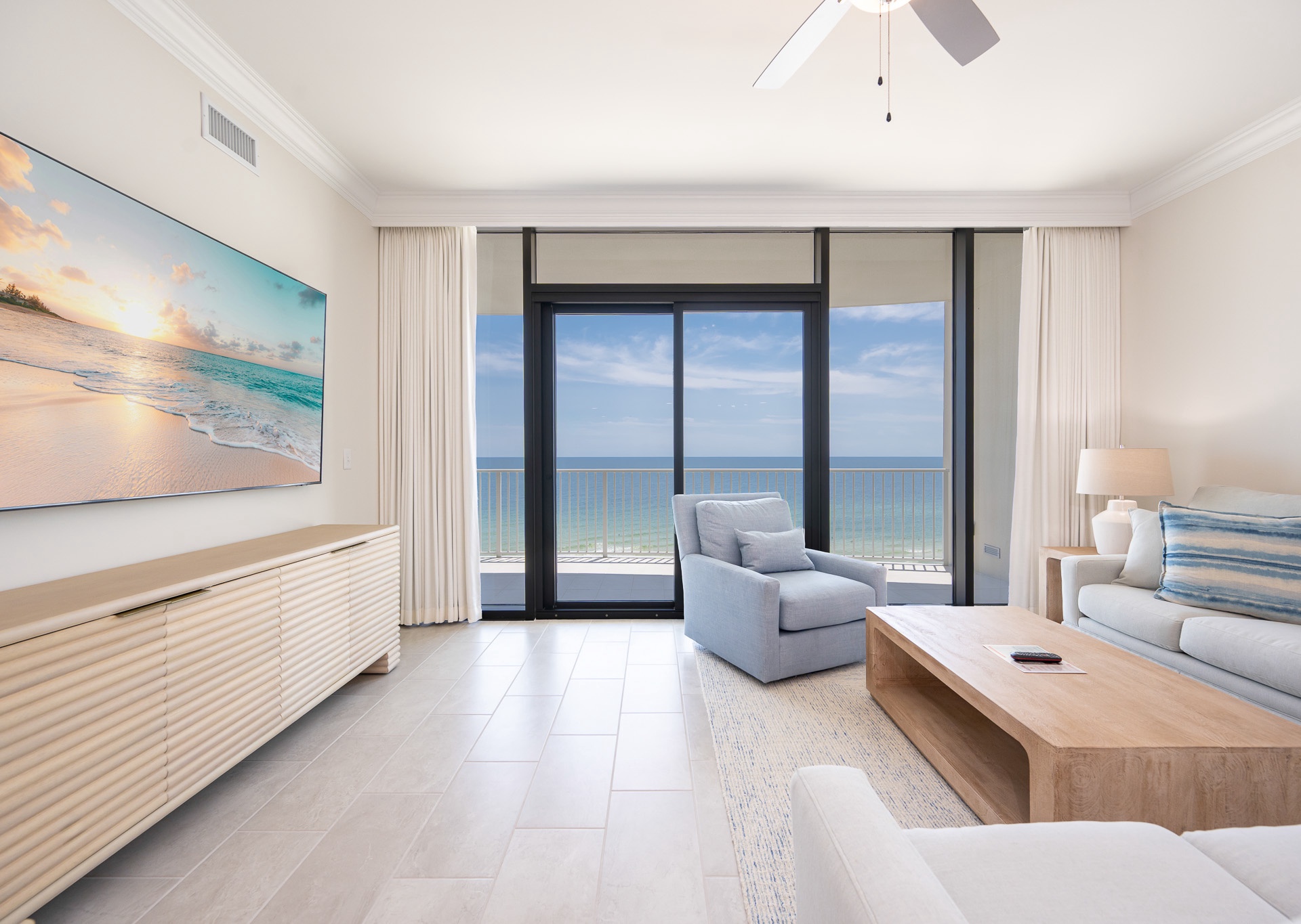 The open-concept living space is designed for comfort and entertaining. Floor-to-ceiling windows fill the condo with natural light and frame breathtaking Gulf views. A large sectional sofa with swivel chair, flat-screen TV, and ceiling fans in every room ensure everyone feels right at home.