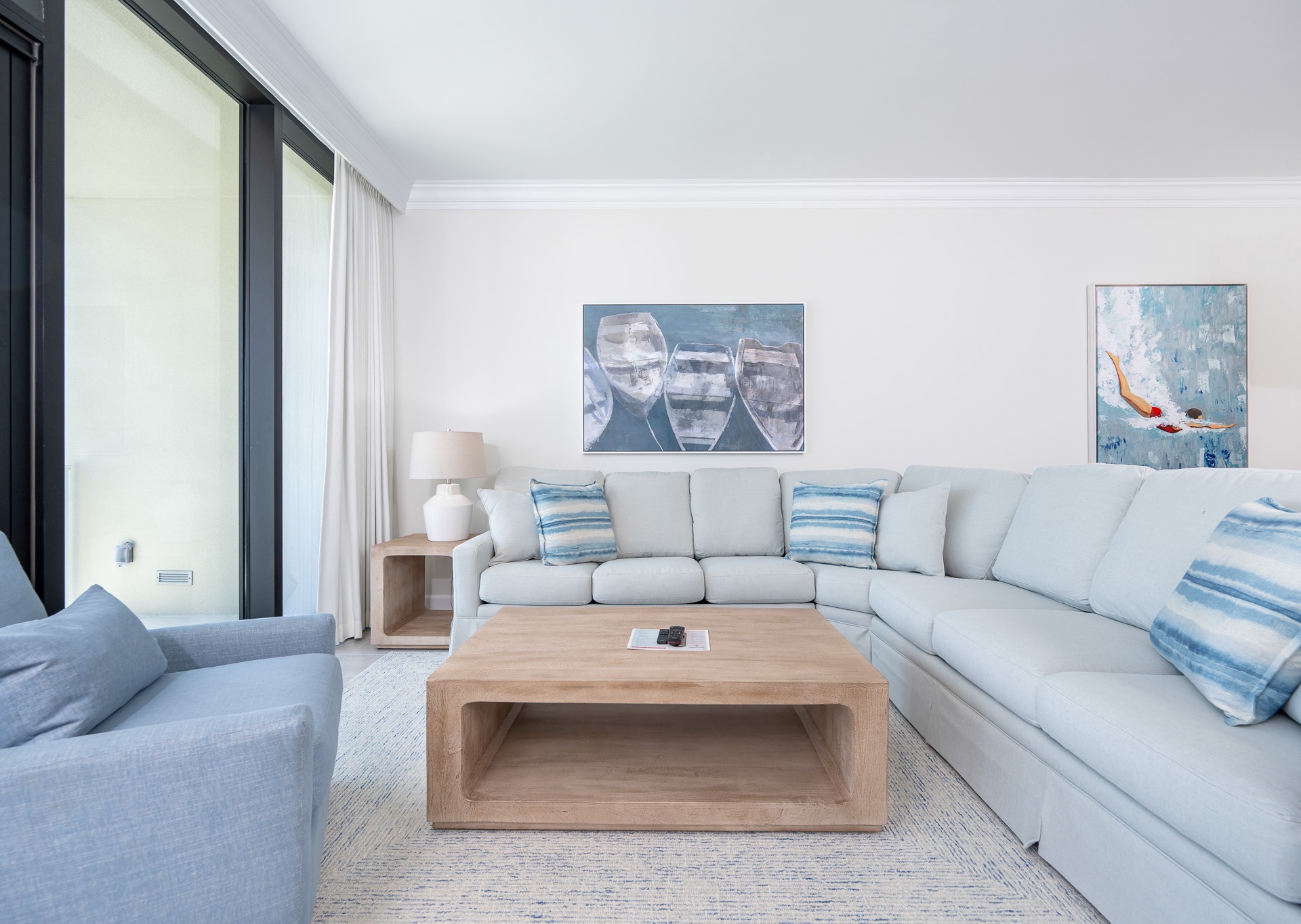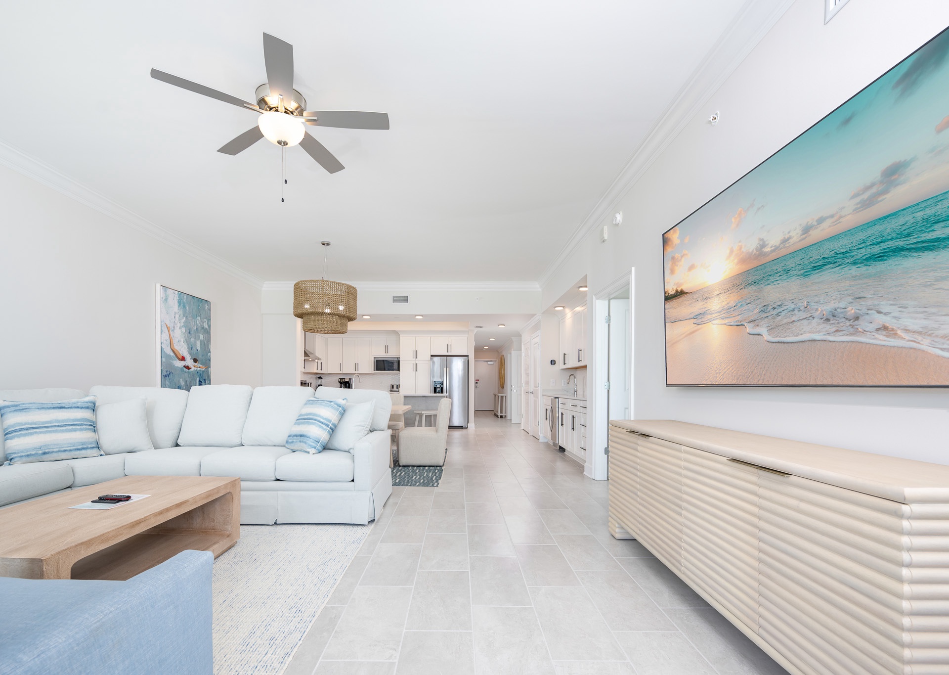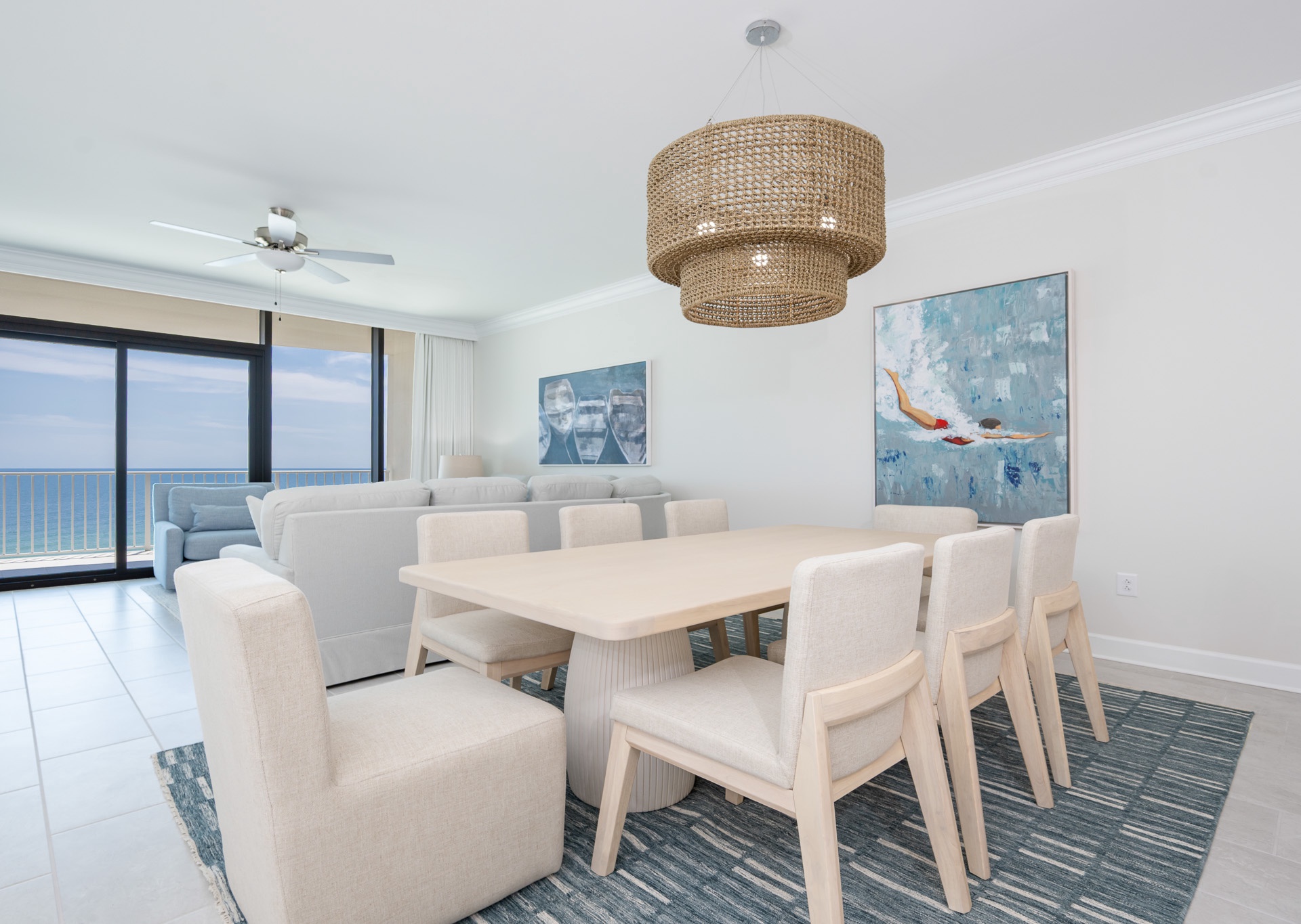 The open-concept living space is designed for comfort and entertaining. Floor-to-ceiling windows fill the condo with natural light and frame breathtaking Gulf views. A large sectional sofa with swivel chair, flat-screen TV, and ceiling fans in every room ensure everyone feels right at home.