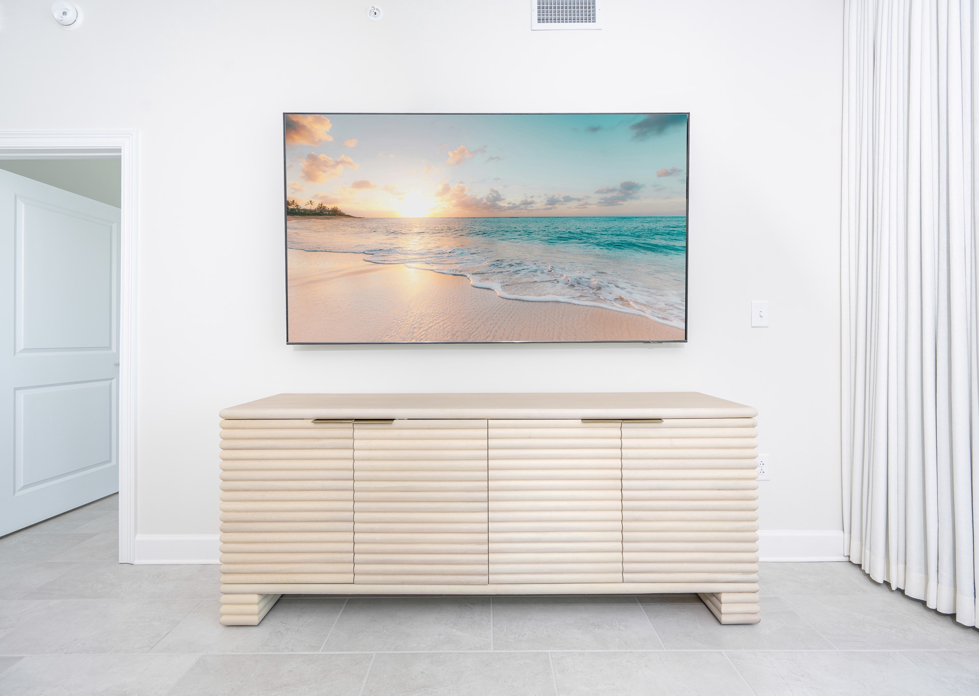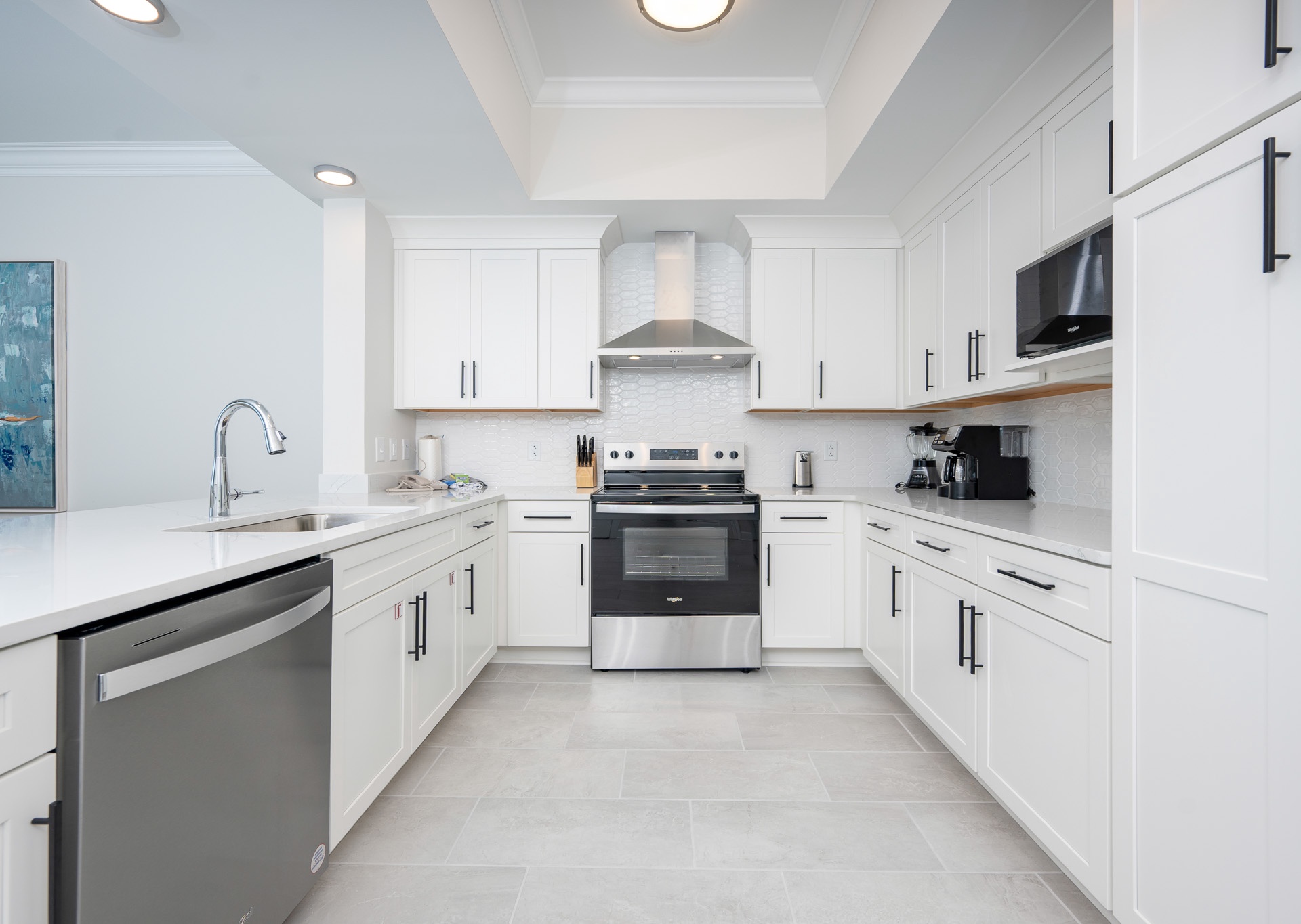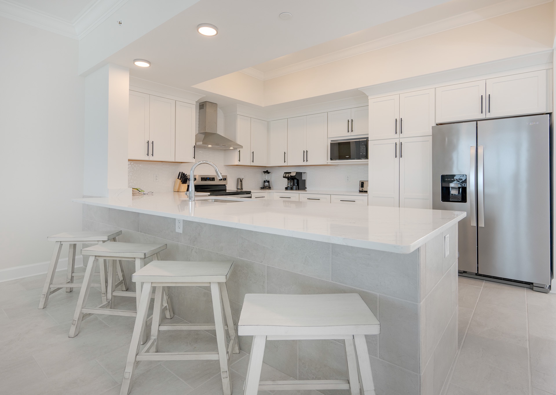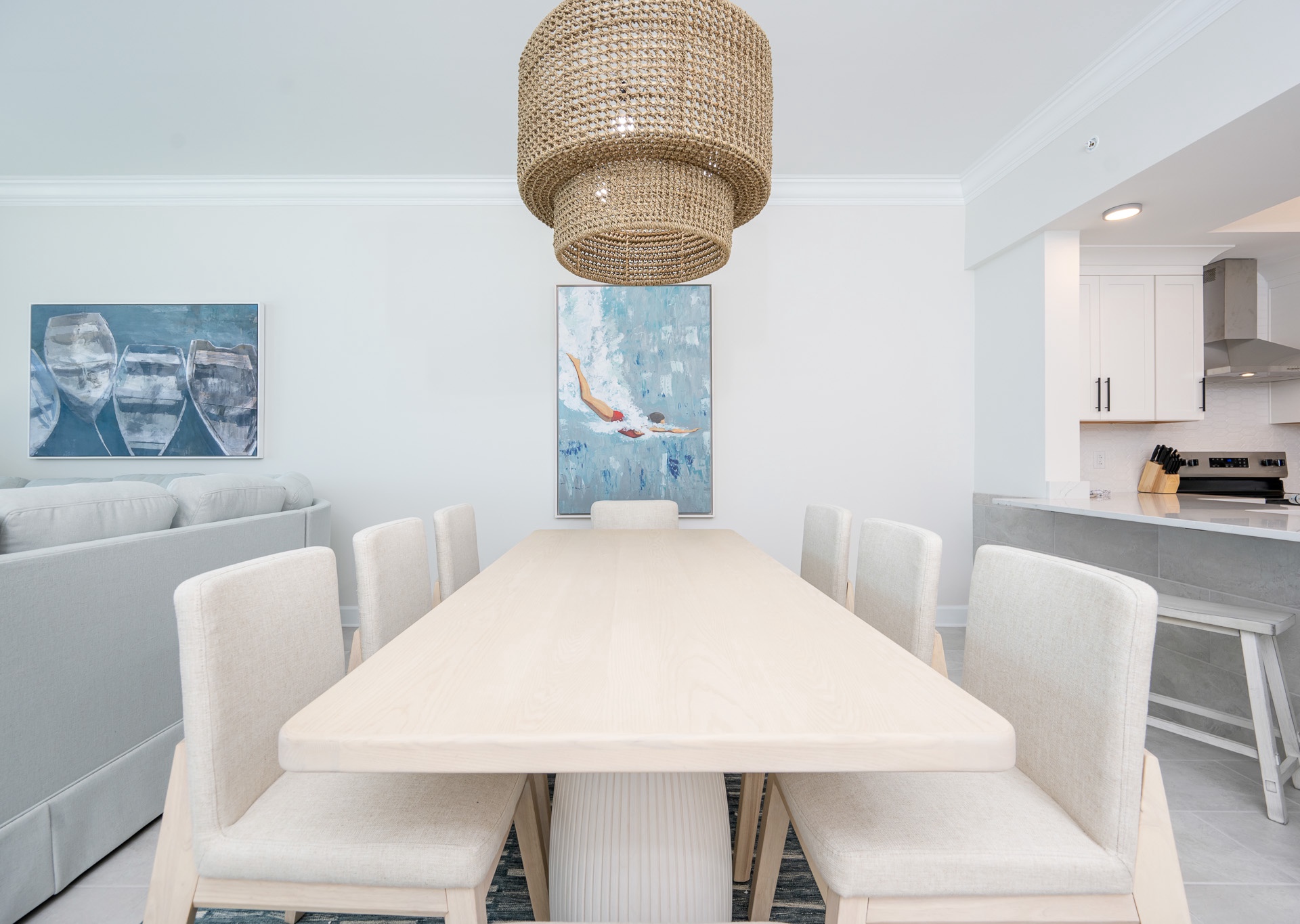 The fully equipped kitchen is a chef’s dream with stainless steel appliances, a hooded range, white cabinetry, Keurig and drip coffee makers, and a breakfast bar with four stools. An adjacent wet bar with an ice maker and prep sink makes hosting and entertaining a breeze. Gather around the dining table that seats eight for meals and game nights with family and friends.