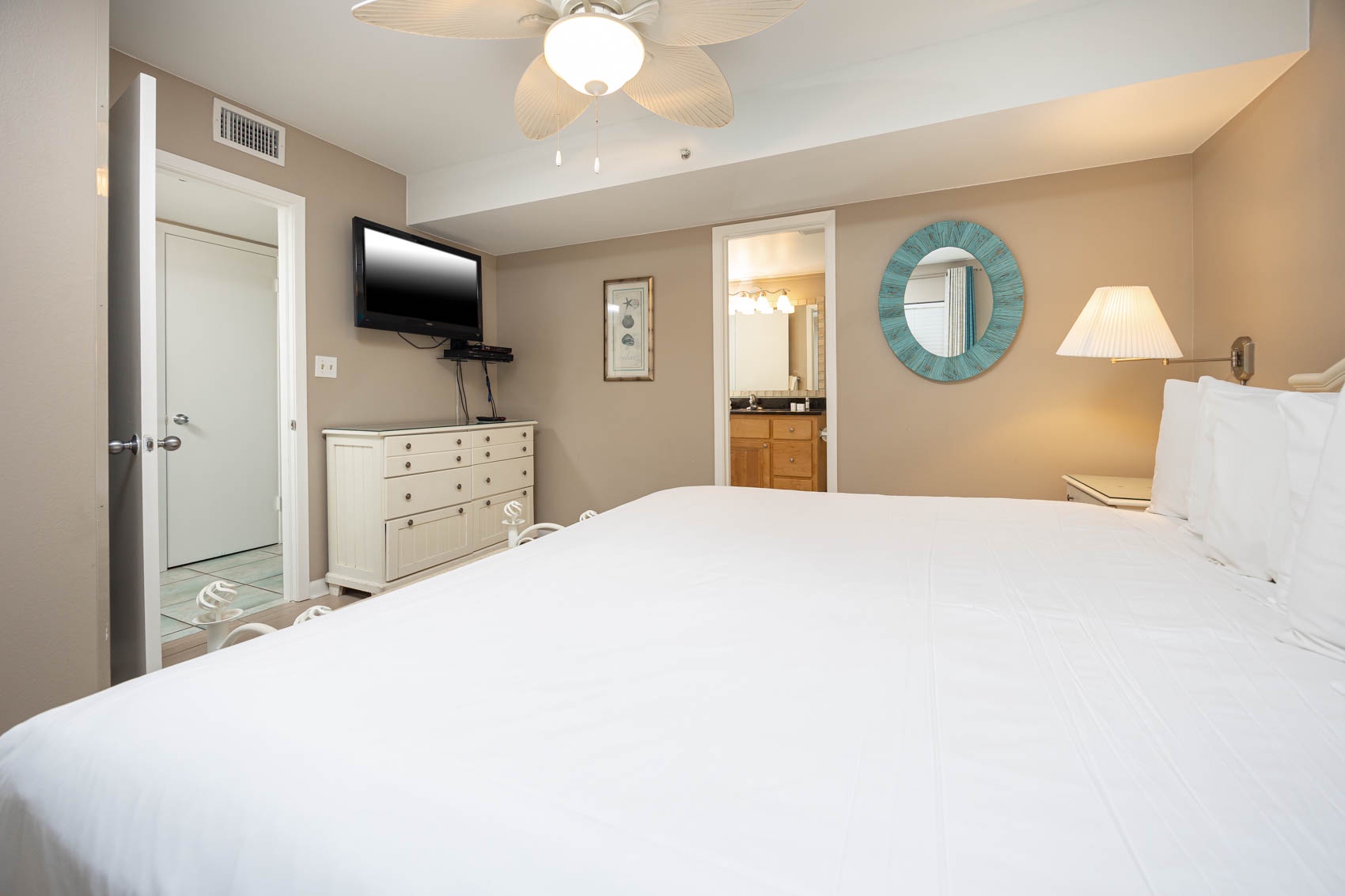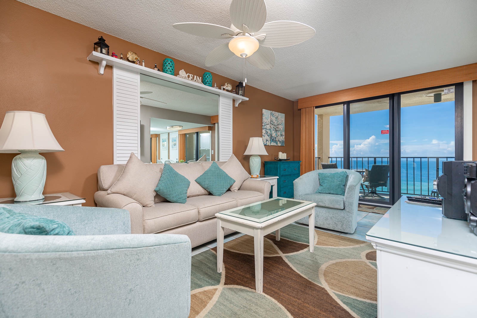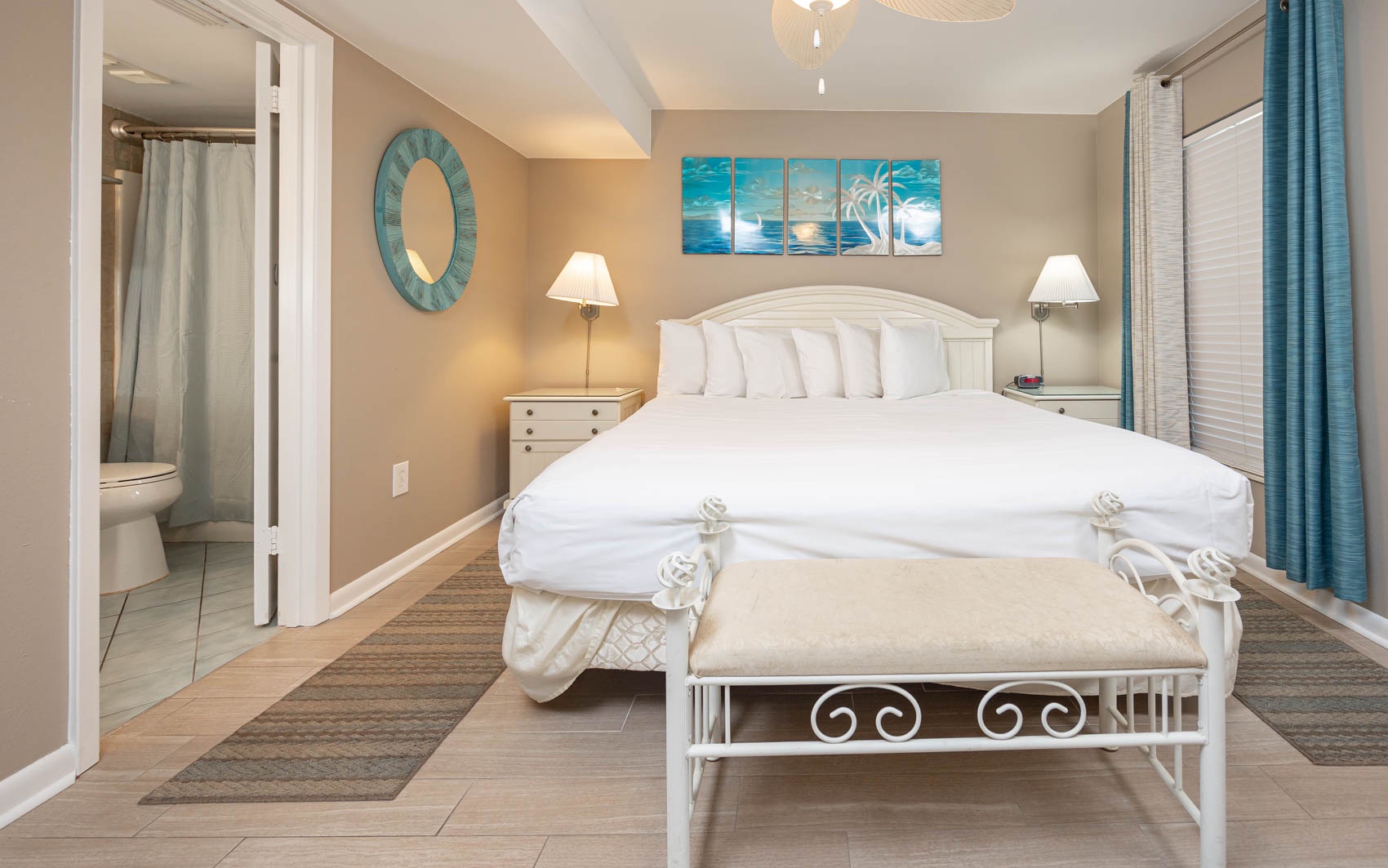 Interior: As you step inside, you'll be greeted by a cool and refreshing ambiance to include tile floors throughout the living area. Sink into the inviting sofa and two seafoam green barrel chairs, offering a comfortable and soothing atmosphere. A charming, shuttered mirror with a delightful shelf gives the space an additional open feel, allowing you to bring the beach indoors. The bedroom is a tranquil oasis with blackout color block drapes to ensure a restful night's sleep. The king-sized bed and beautiful turquoise color scheme create a serene and coastal-inspired retreat. The recently updated master bath boasts elegant tile and a granite countertop vanity, adding a touch of sophistication to your daily routine.