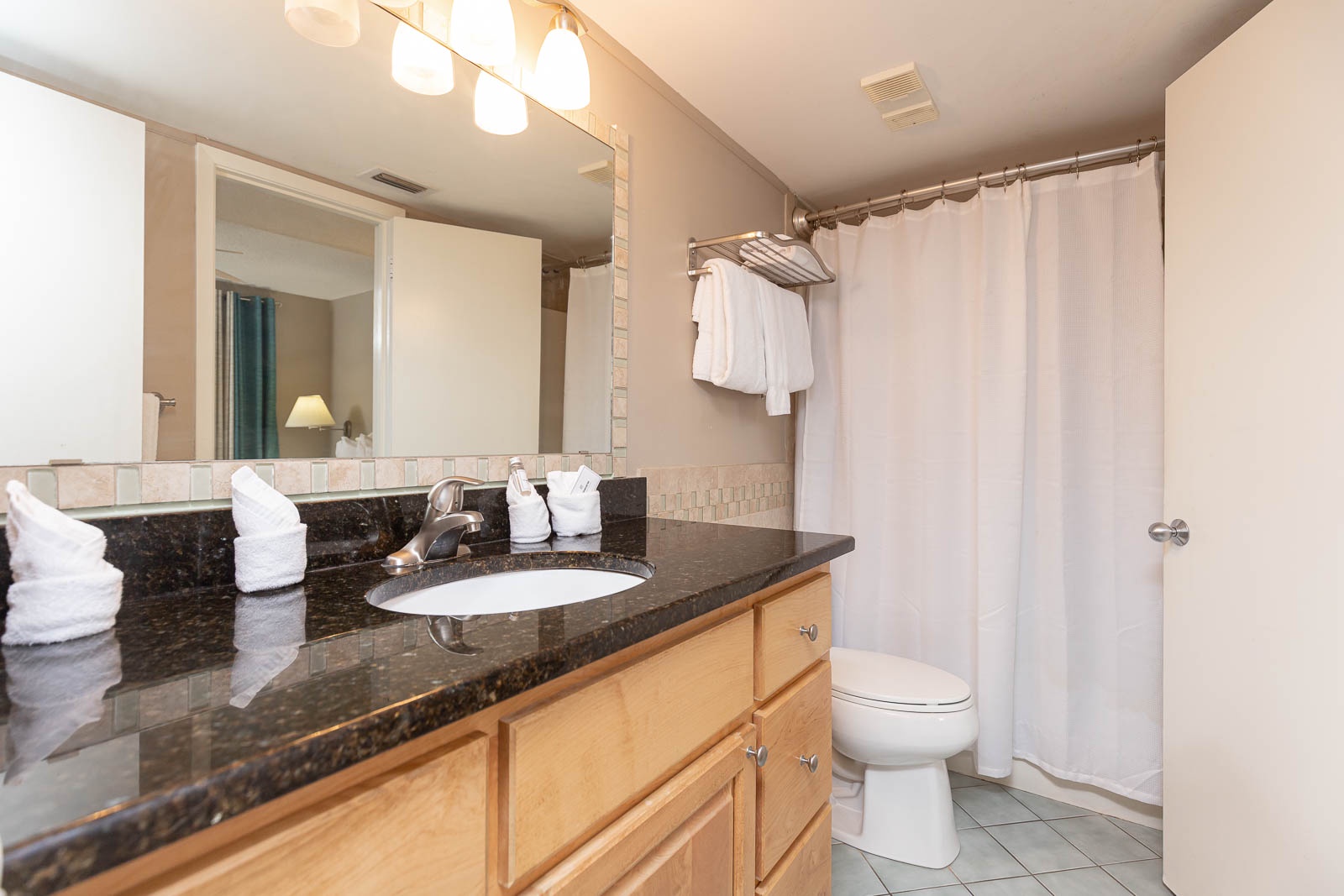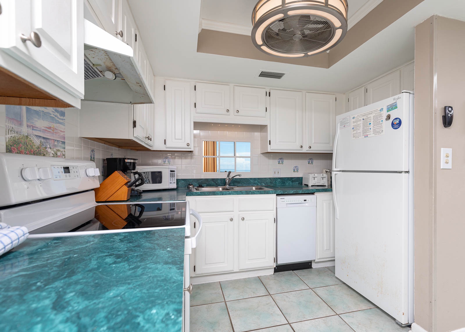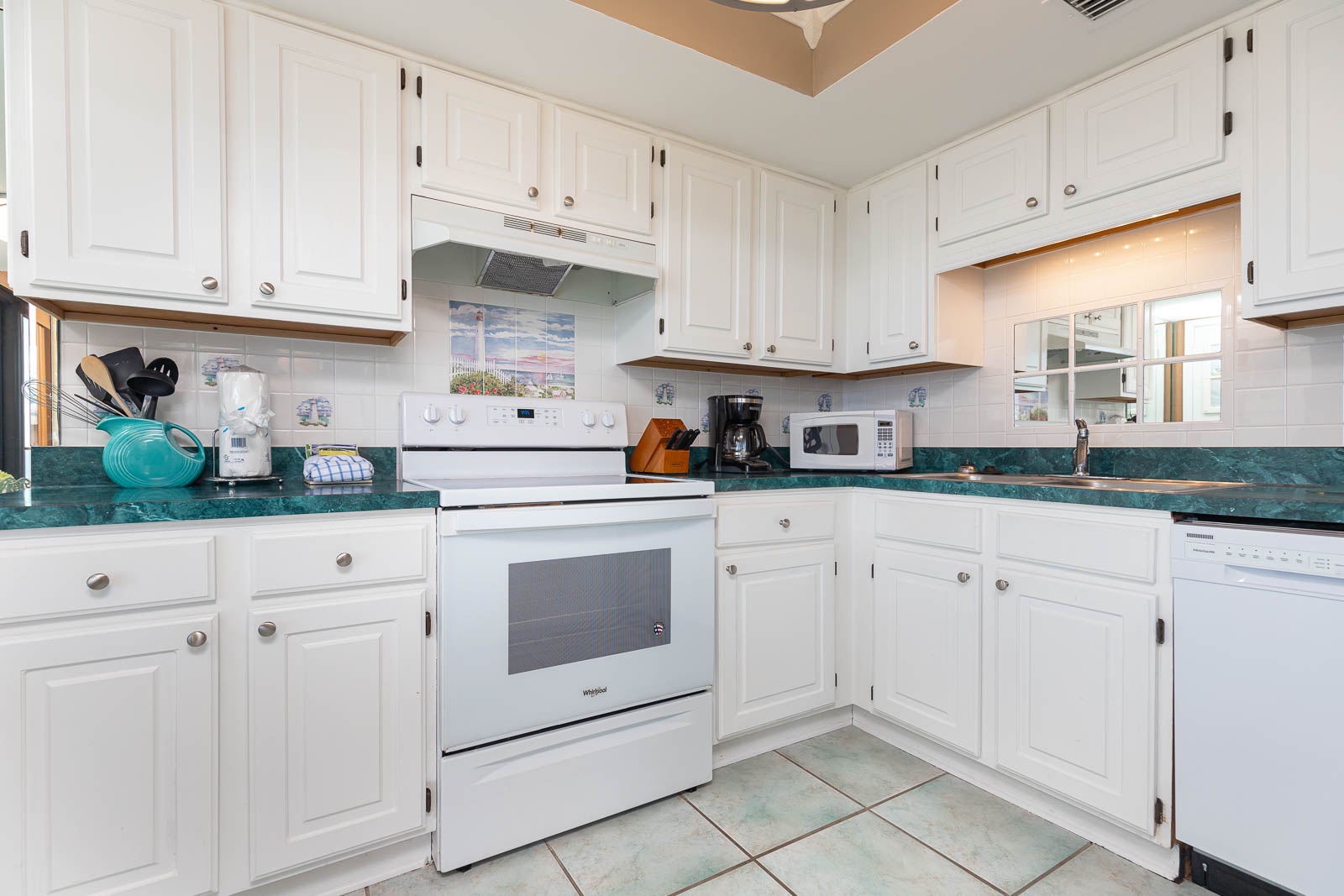 Interior: As you step inside, you'll be greeted by a cool and refreshing ambiance to include tile floors throughout the living area. Sink into the inviting sofa and two seafoam green barrel chairs, offering a comfortable and soothing atmosphere. A charming, shuttered mirror with a delightful shelf gives the space an additional open feel, allowing you to bring the beach indoors. The bedroom is a tranquil oasis with blackout color block drapes to ensure a restful night's sleep. The king-sized bed and beautiful turquoise color scheme create a serene and coastal-inspired retreat. The recently updated master bath boasts elegant tile and a granite countertop vanity, adding a touch of sophistication to your daily routine.