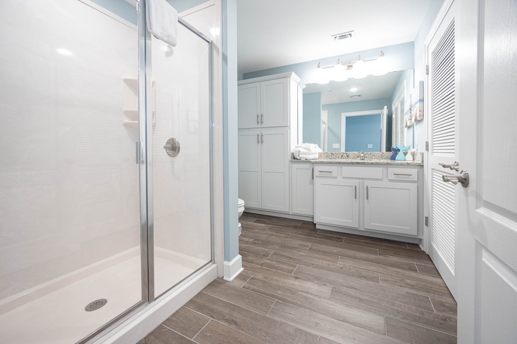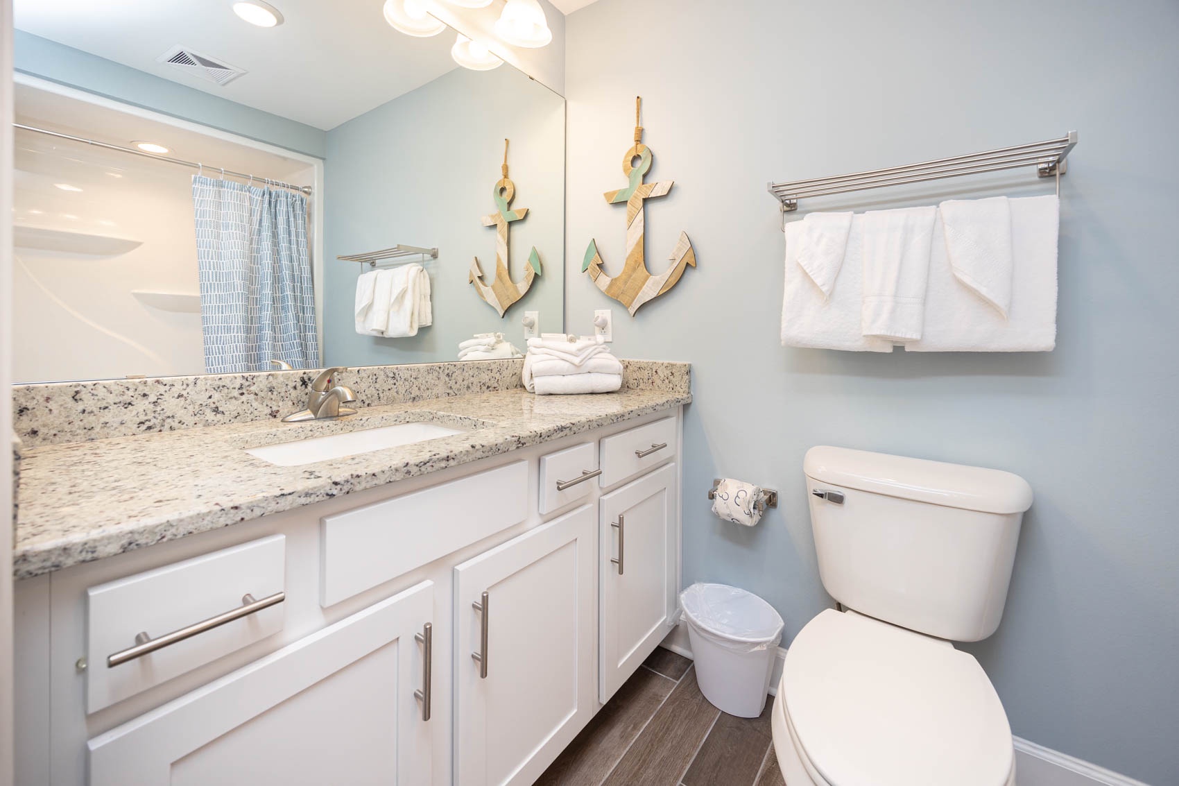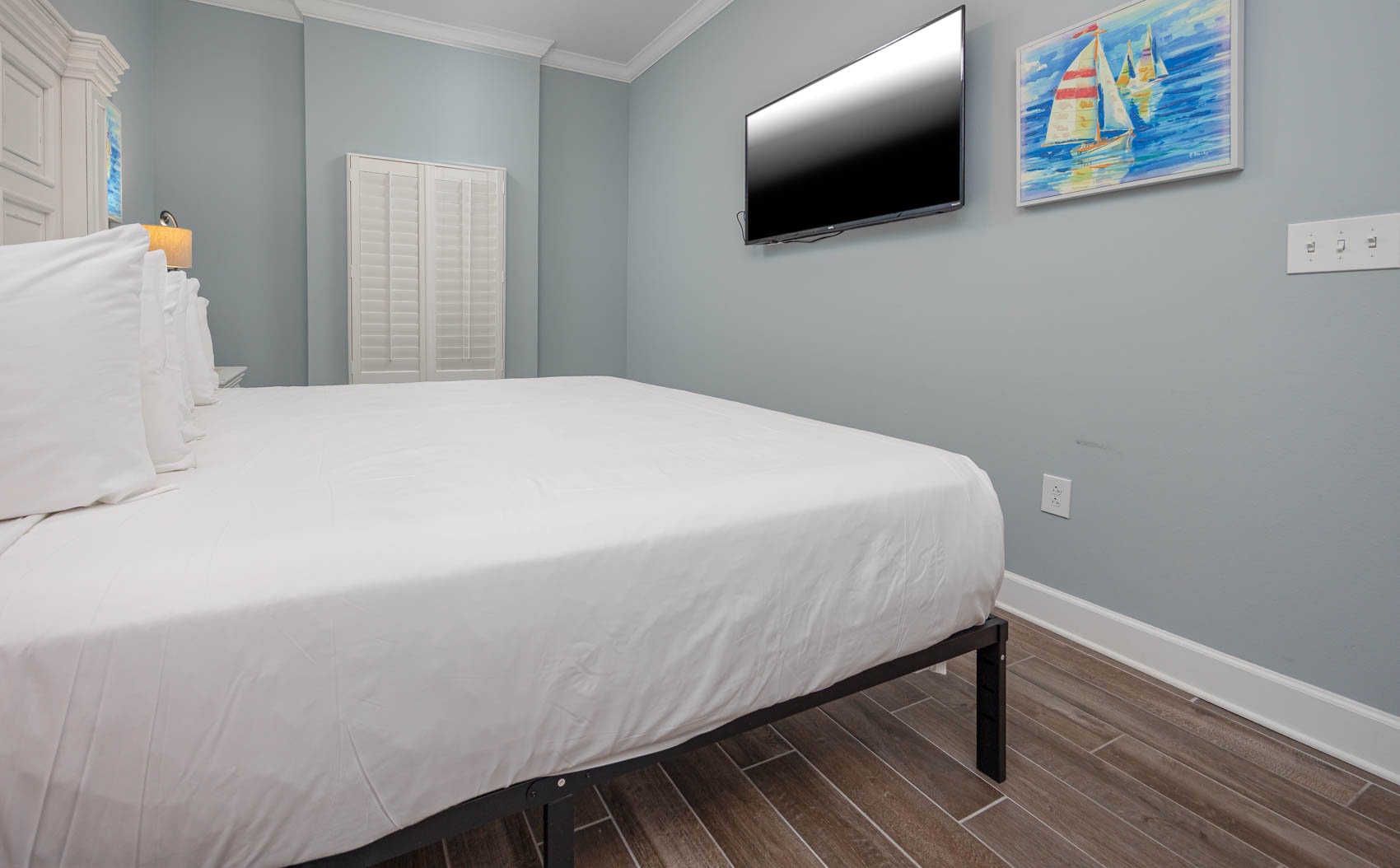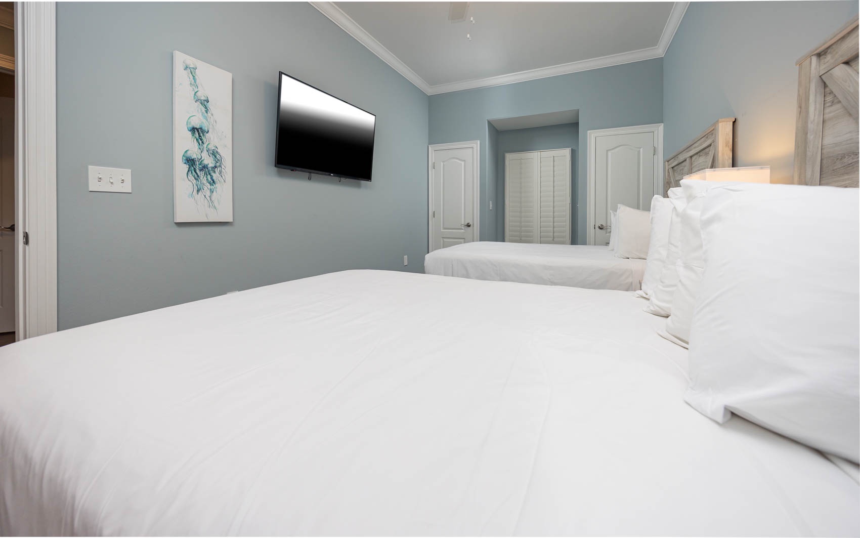 The master bedroom features a king bed, while the second bedroom offers two queen beds. Additionally, the living room includes a queen-sized sofa sleeper for extra sleeping space. Flat-screen TVs throughout the condo ensure everyone can enjoy their favorite shows.