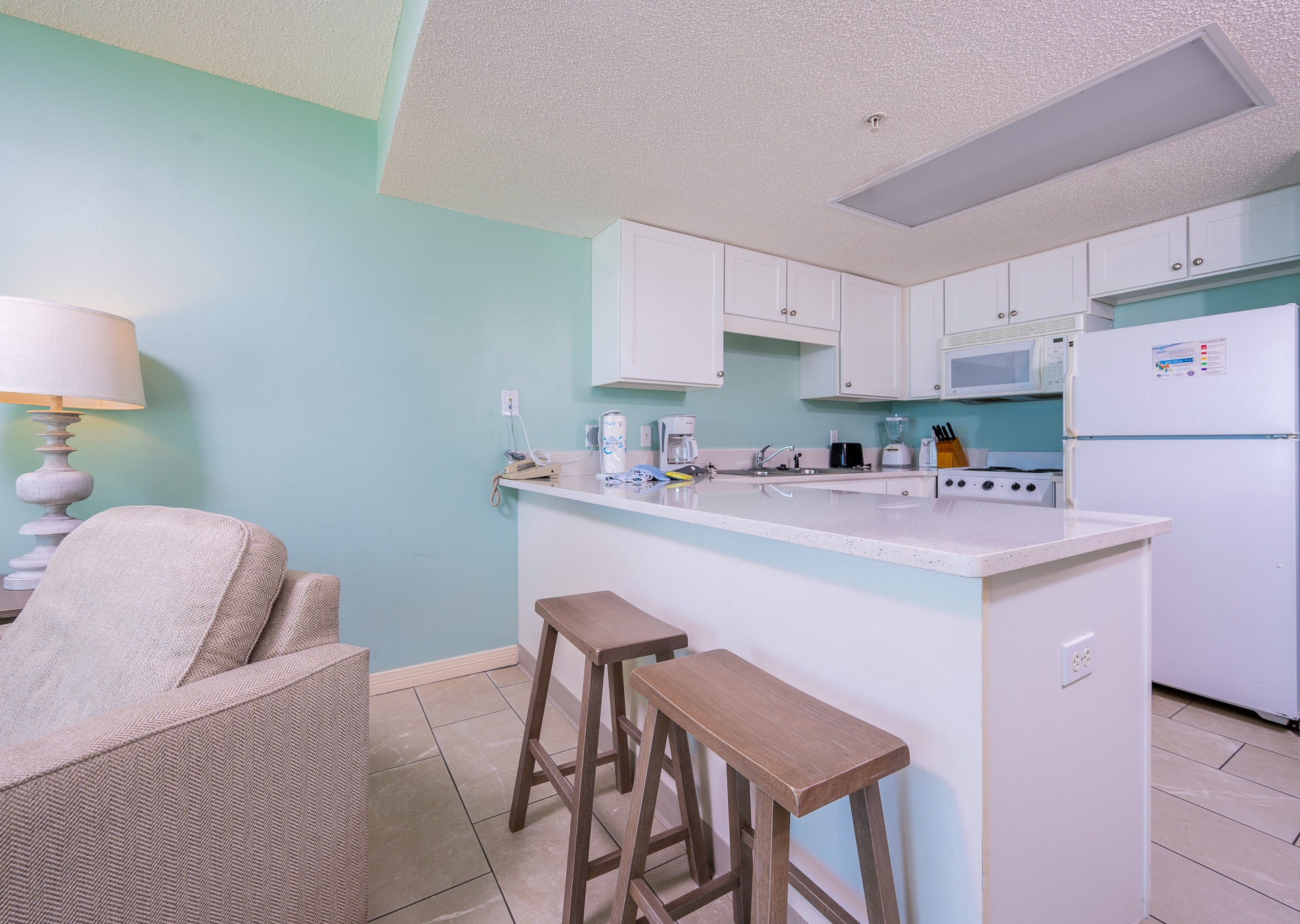 The suite features a full-size kitchen, fully equipped for your cooking needs, and a separate living room to relax after a day of fun in the sun. The private bedroom includes a cozy king-size bed with an en-suite bathroom, while the hallway features built-in bunk beds perfect for small children. An additional half bath adds extra convenience for your stay.
