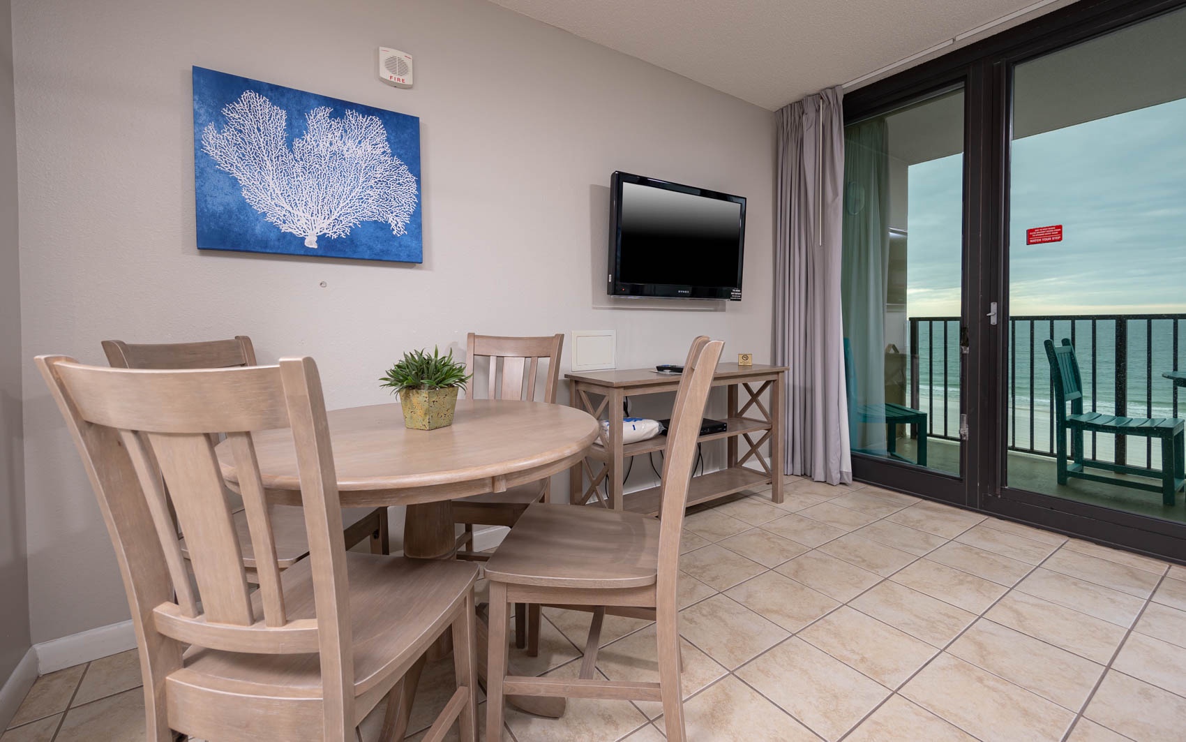 Phoenix All Suites West, situated on the pristine shores of Gulf Shores, Alabama, offers a comfortable and well-appointed one-and-a-half bath hotel suite that sleeps up to six guests. The suite features a spacious king-sized bed in the bedroom, a convenient queen sofa sleeper in the living area, and charming built-in bunk beds in the hallway, perfect for accommodating families or small groups.