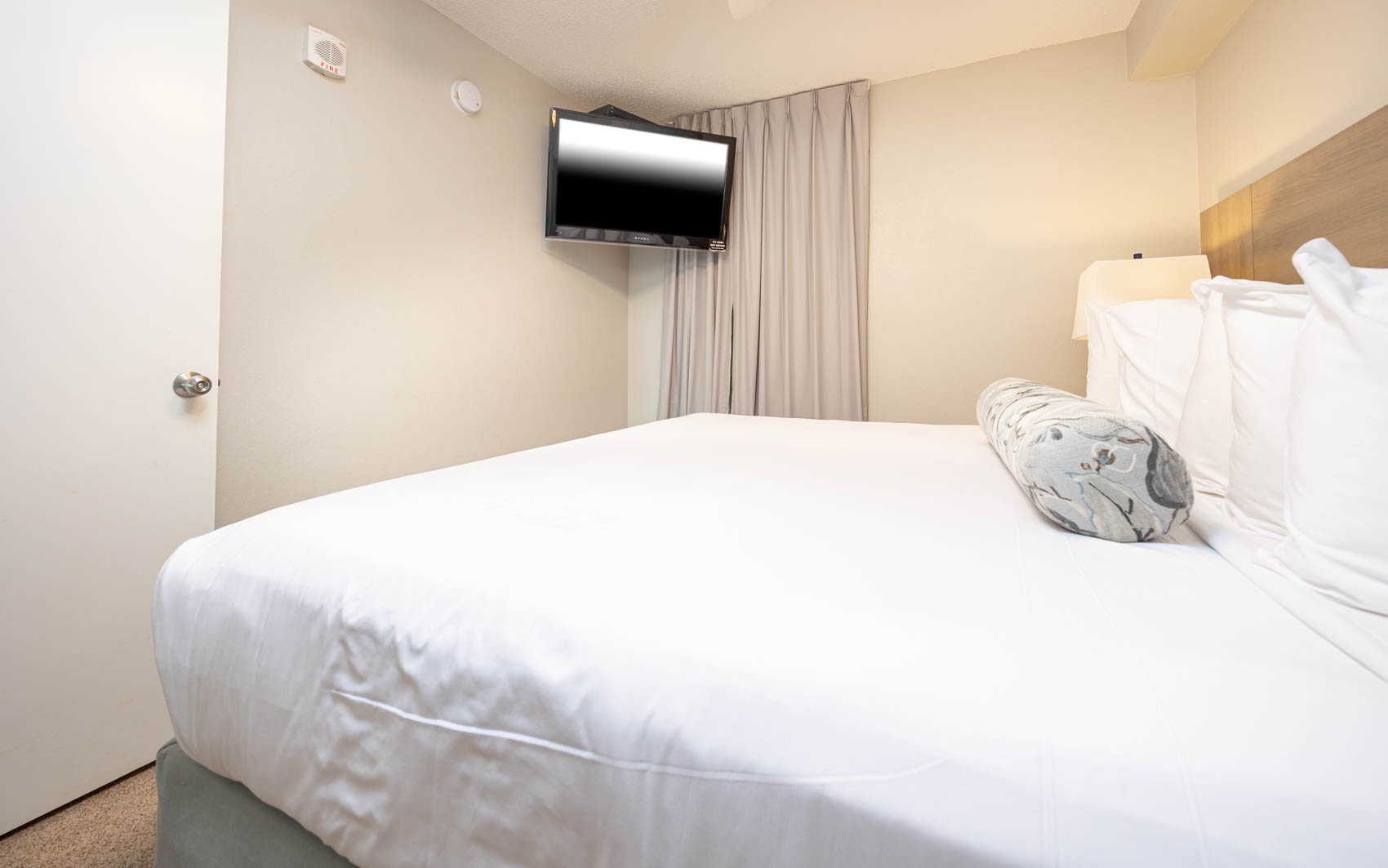 Phoenix All Suites West, situated on the pristine shores of Gulf Shores, Alabama, offers a comfortable and well-appointed one-and-a-half bath hotel suite that sleeps up to six guests. The suite features a spacious king-sized bed in the bedroom, a convenient queen sofa sleeper in the living area, and charming built-in bunk beds in the hallway, perfect for accommodating families or small groups.