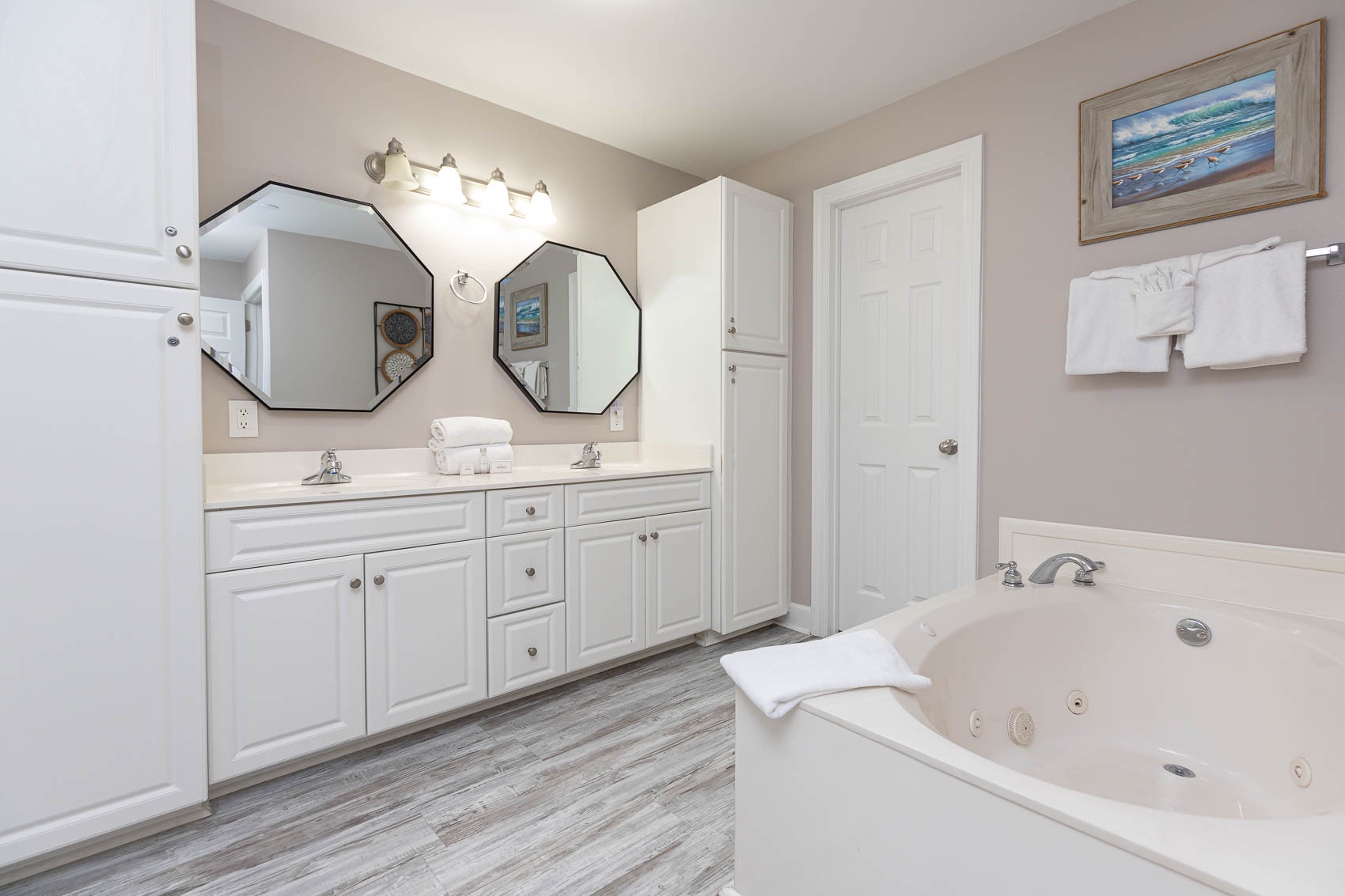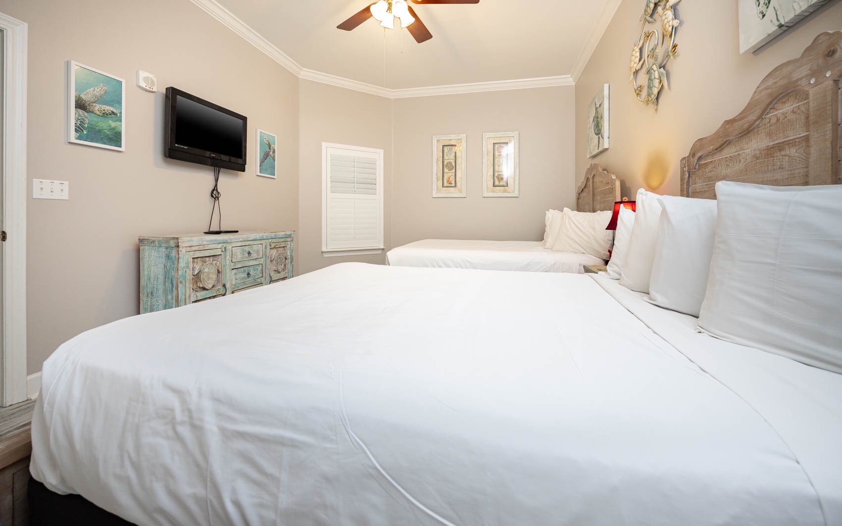 The master bedroom is a true sanctuary, furnished with a comfortable king-size bed and boasting its own private balcony overlooking the sparkling waters. It features an ensuite bathroom with a luxurious soaking tub, a separate shower, and double vanity sinks. The two additional bedrooms offer flexibility and comfort, with a combination of king-size bed and two queens, and ensuite bathrooms for convenience and privacy. For additional sleeping arrangements, the living area includes a sofa bed.