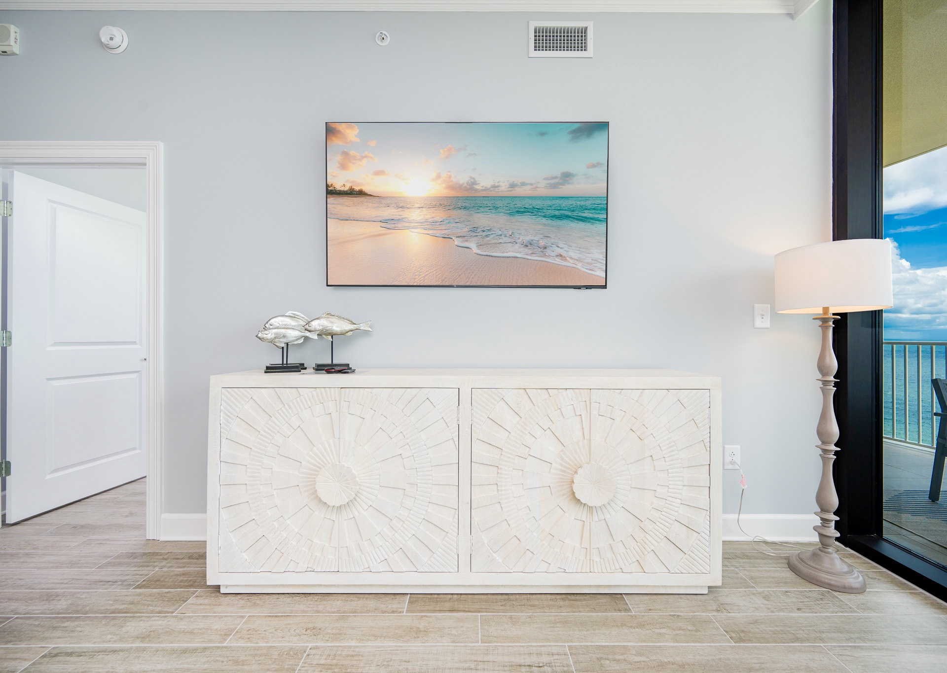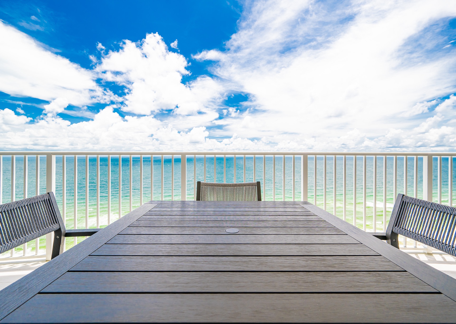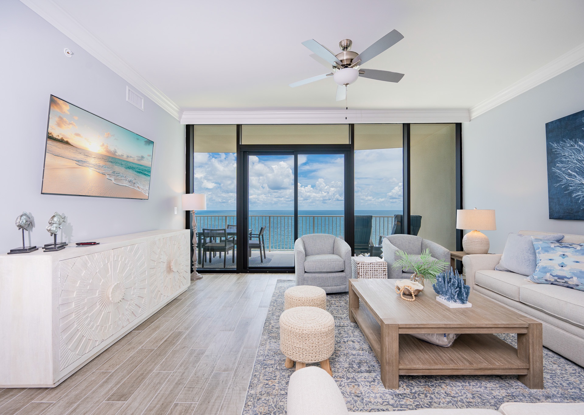Enjoy floor-to-ceiling windows in both the living room and master bedroom, which flood the space with natural light and lead out to a private tiled balcony furnished with high-quality POLYWOOD furniture, perfect for soaking in the sunrise, enjoying a glass of wine at sunset, or just listening to the waves roll in.