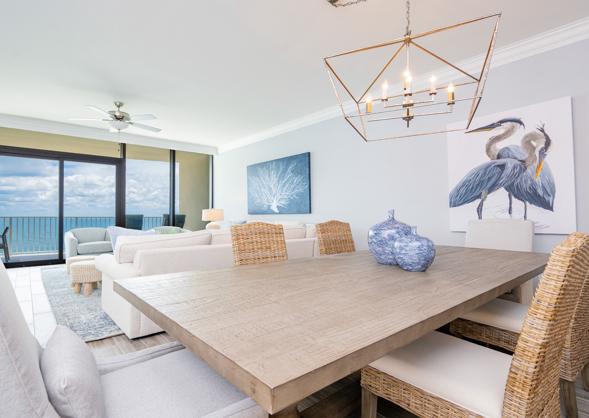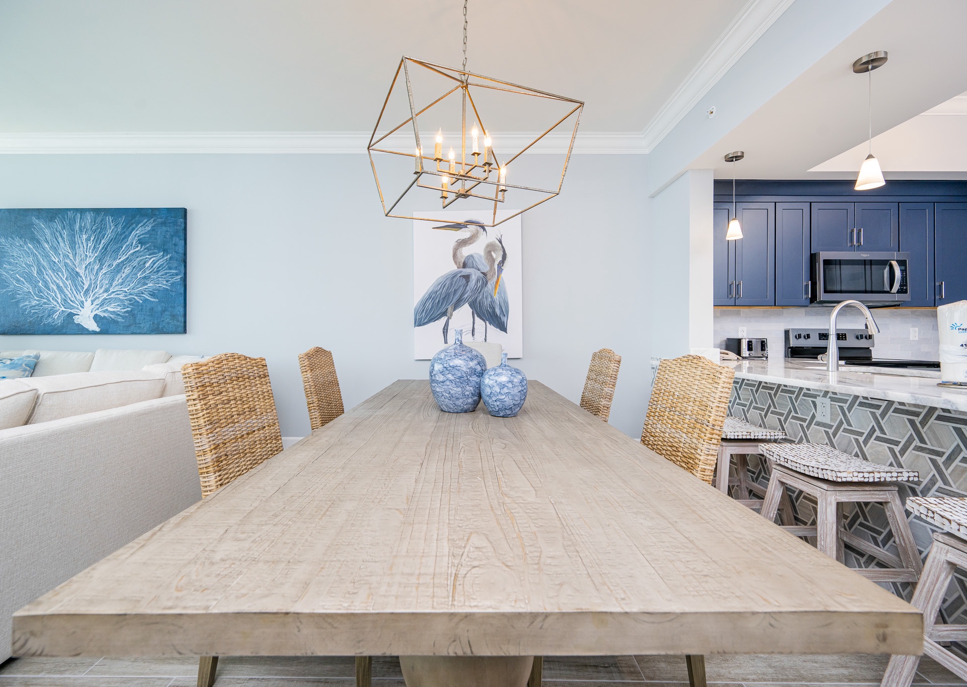 • A spacious dining table that seats six, plus seating for four more at the breakfast bar