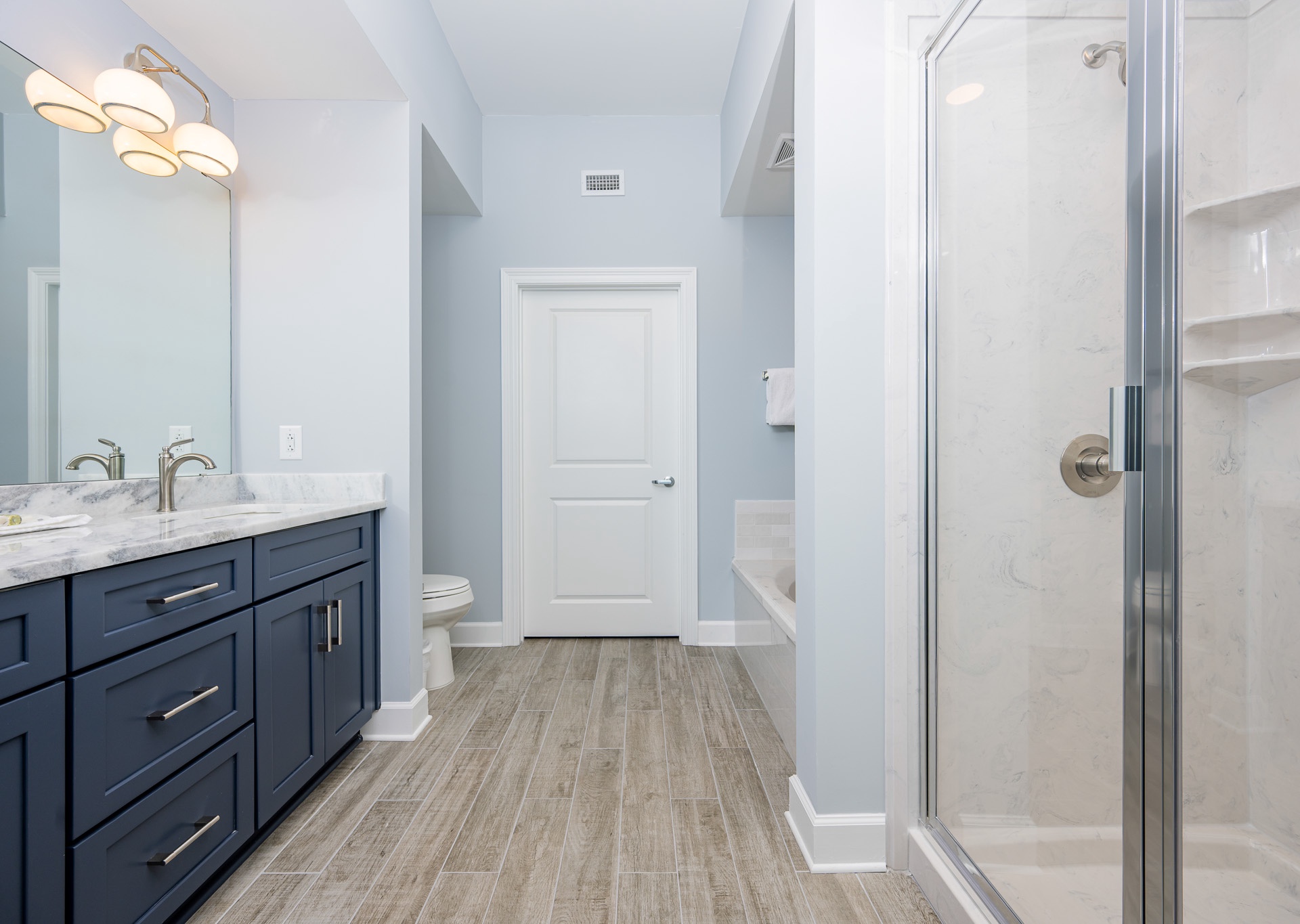 • A master bath with a Garden tub, walk-in shower, and dual vanity