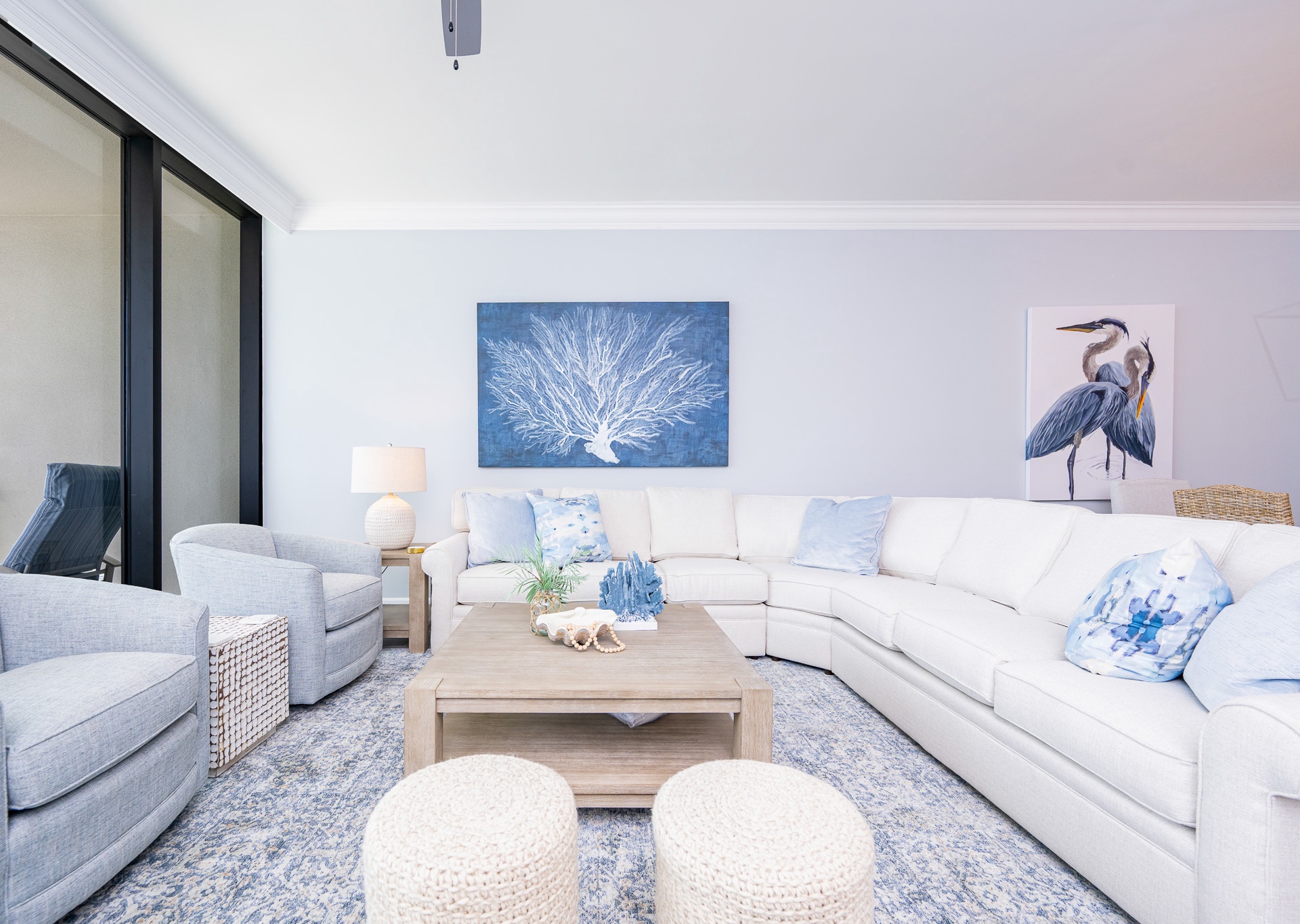 • A large sectional sofa, swivel chairs, and ottomans for plenty of seating