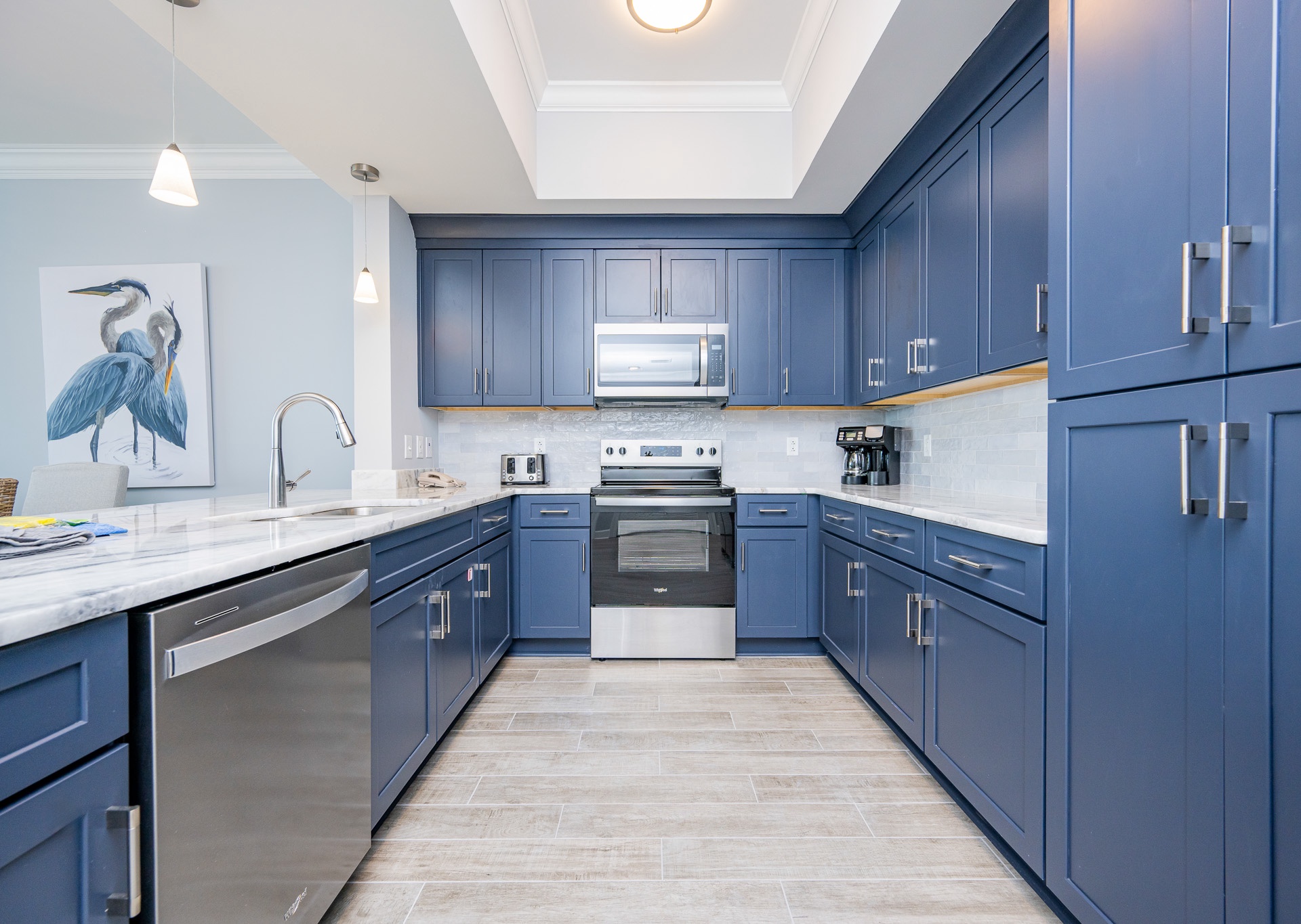 • Beautiful bluish cabinetry, stainless steel appliances, and both a Keurig and regular coffee maker in the fully equipped kitchen