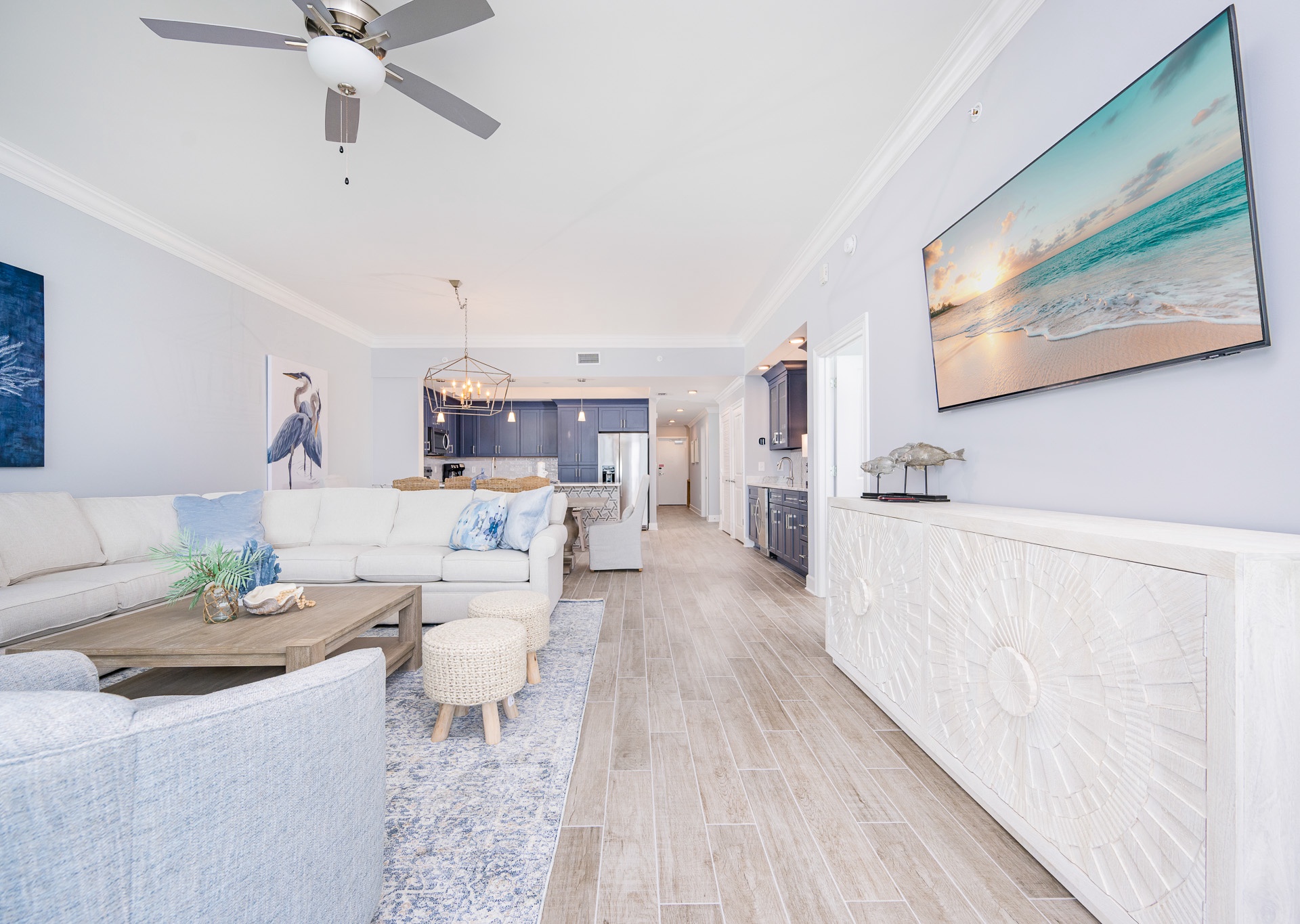 The open-concept living area features: