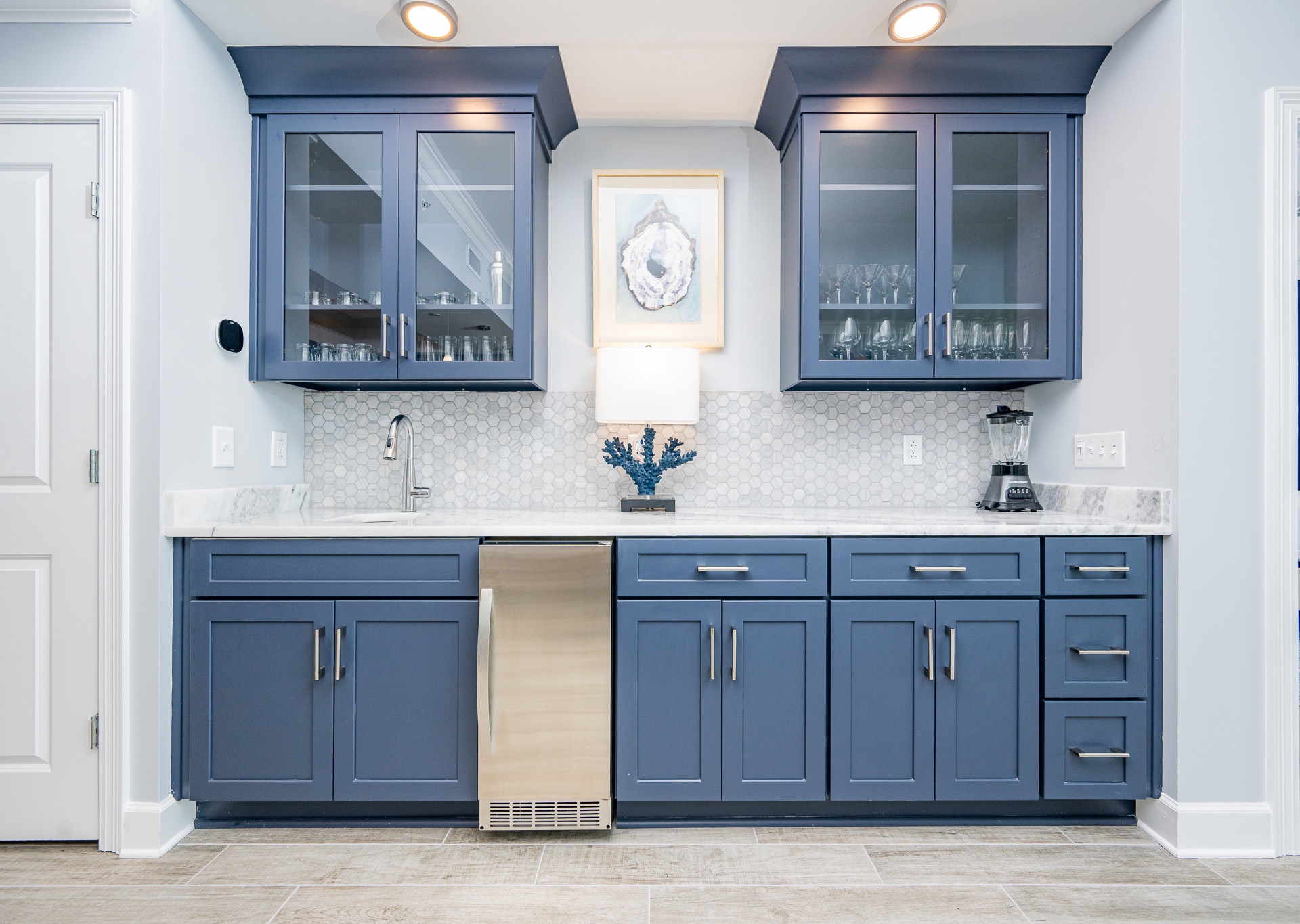 • A well-appointed wet bar with its own icemaker, prep sink, and plenty of stemware for entertaining