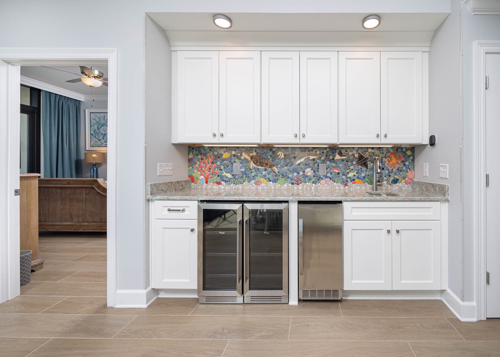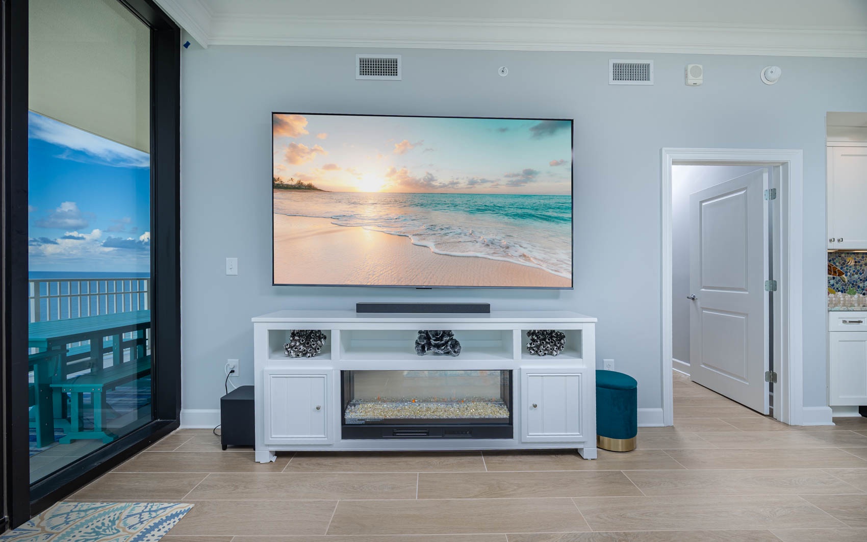 The living room features a stunning 98-inch television with a soundbar for an immersive viewing experience, while each of the four bedrooms is equipped with a 75-inch TV. Above the bar, a handcrafted mosaic creates the illusion of peering into a vibrant aquarium, adding a unique artistic touch.