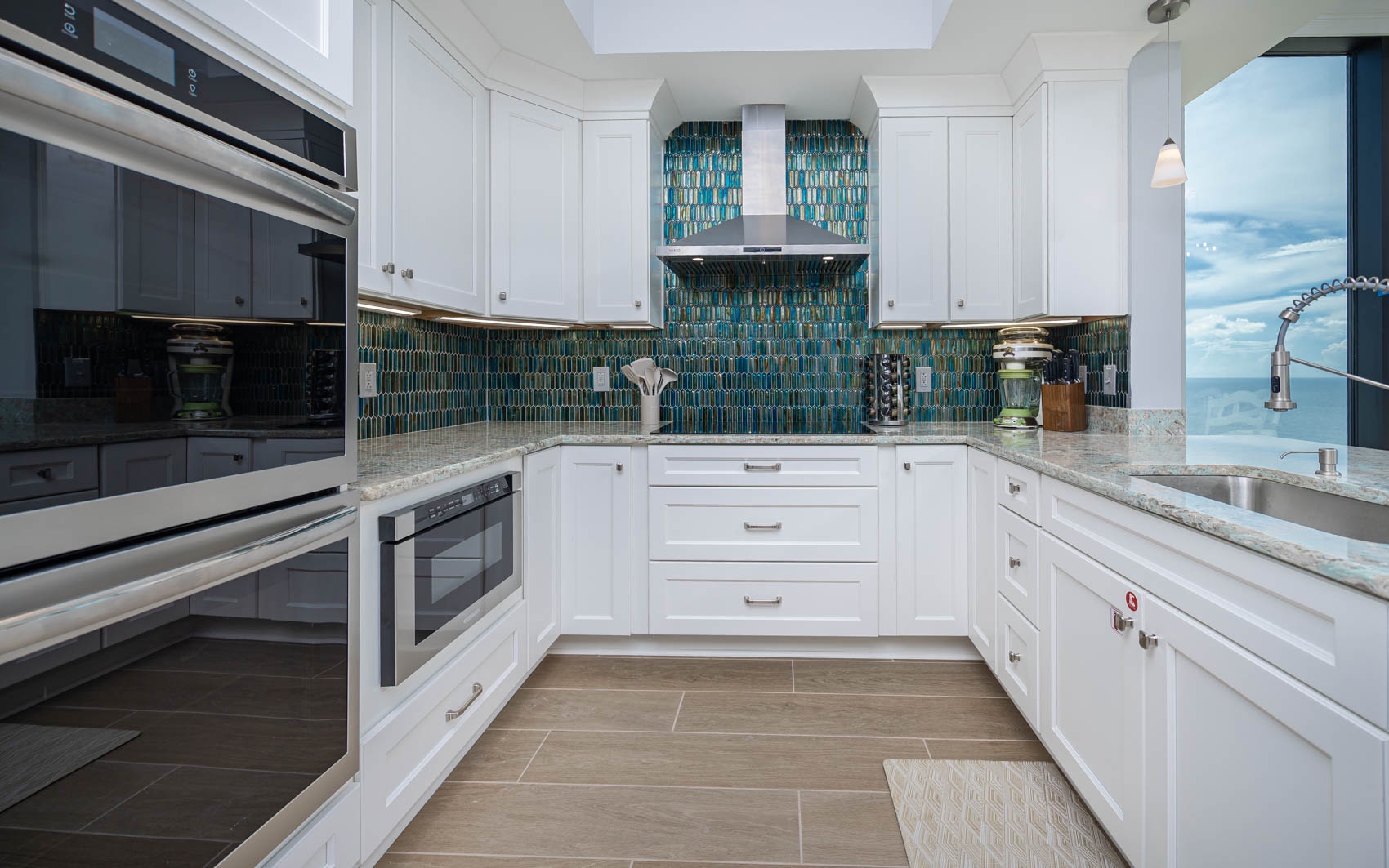 - Kitchens with stainless steel appliances, granite countertops, custom cabinets, a wet bar with an ice maker, and a tile backsplash.