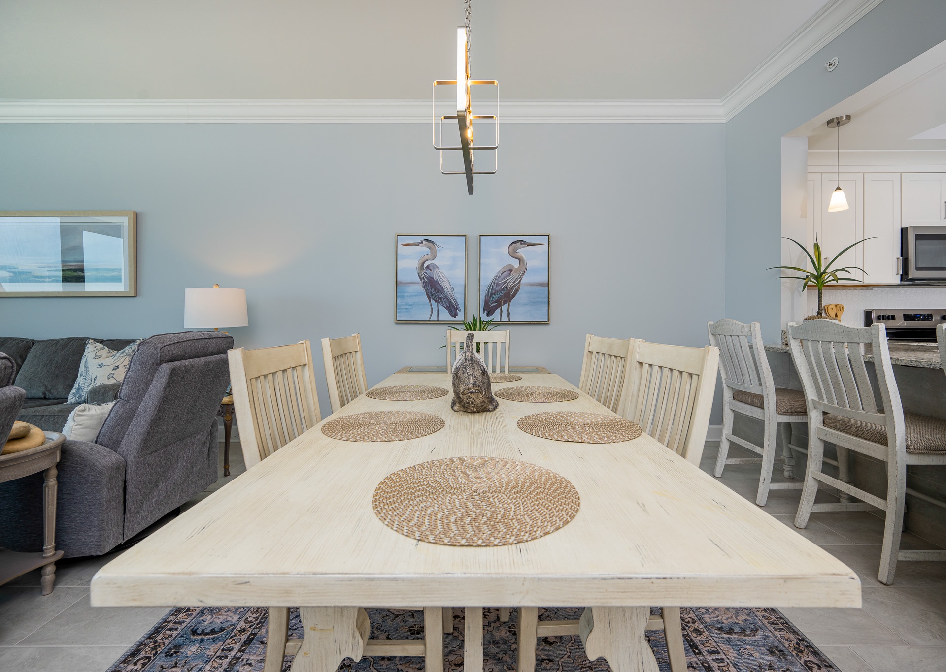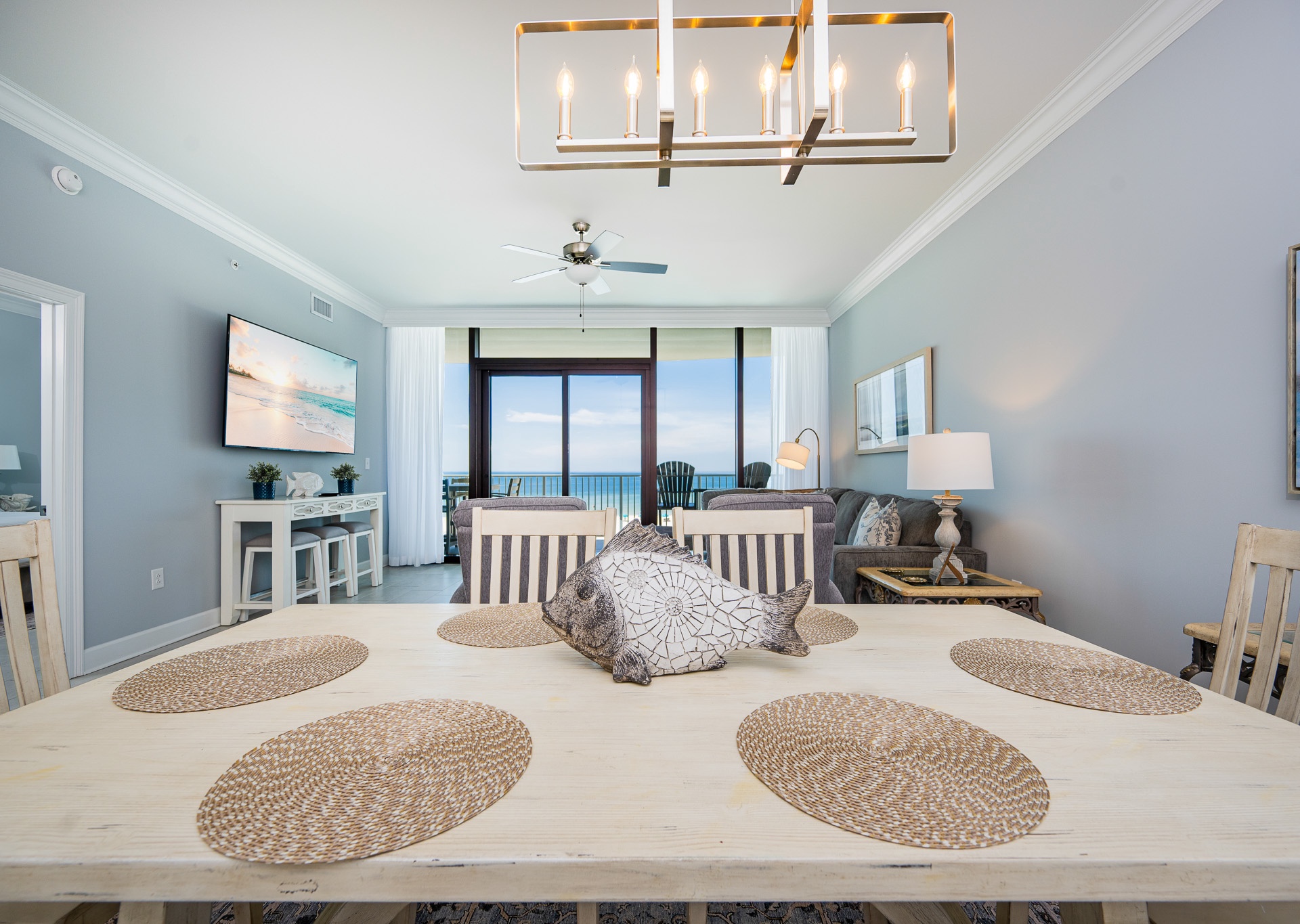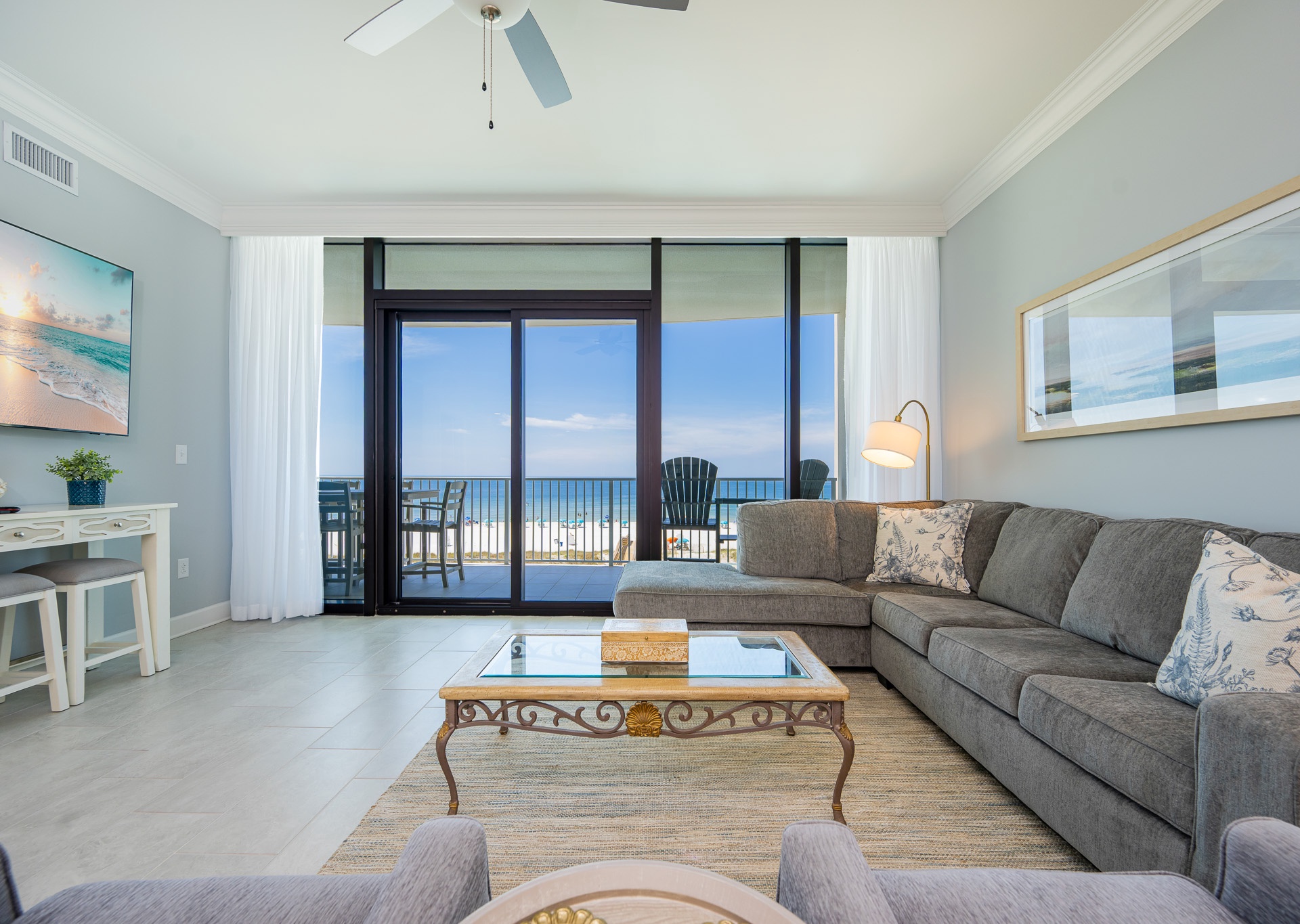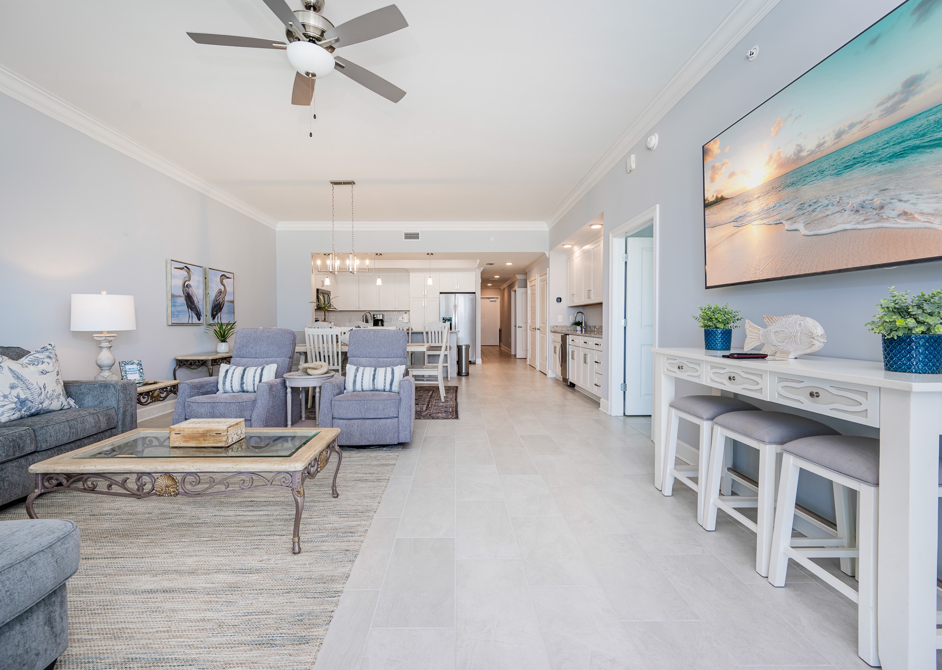 The open living area features a large sectional, additional chairs, and a wall-mounted flat-screen TV—perfect for relaxing after a beach day. A unique addition is the bistro-style bar table with three barstools in the living room, ideal for little ones to snack, color, or play while staying close to the action.