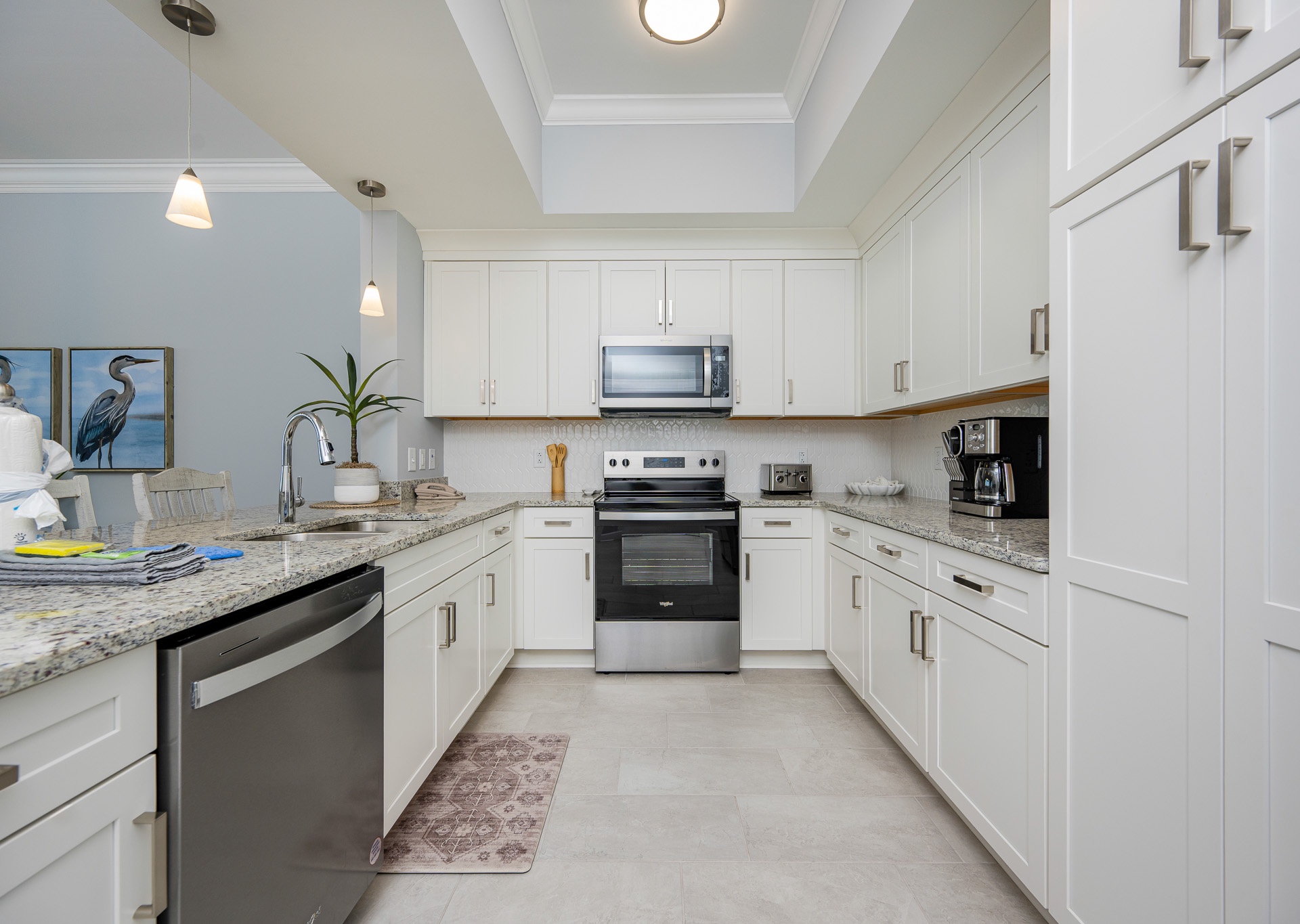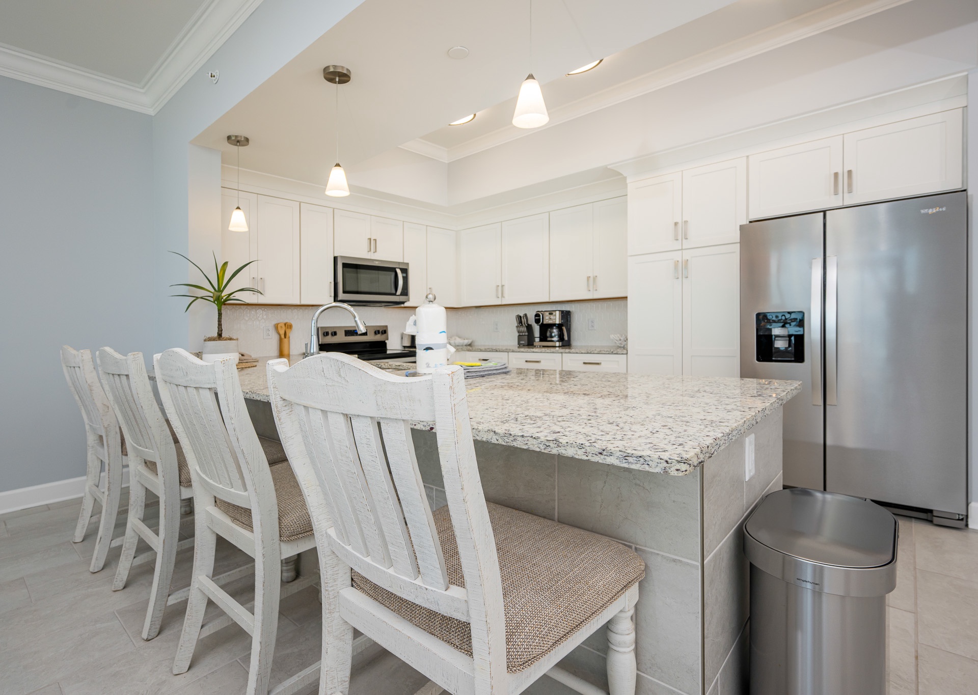Enjoy meals together at the dining table with seating for six, or grab a bite at the breakfast bar with three additional barstools. The fully equipped kitchen includes stainless steel appliances, gray cabinetry, a Keurig and regular drip coffee maker, and everything you need to feel at home.