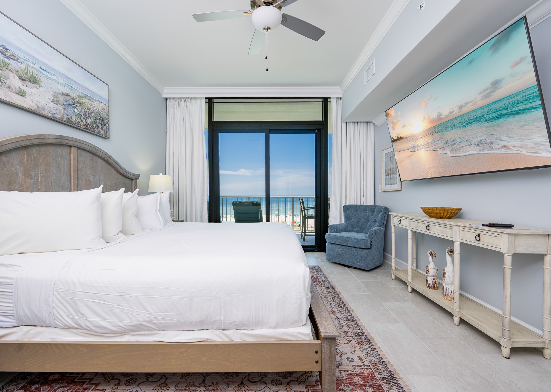 The master suite offers a wall-mounted TV, private balcony access, a Jacuzzi tub, and a glass walk-in shower, giving you a spa-like retreat.