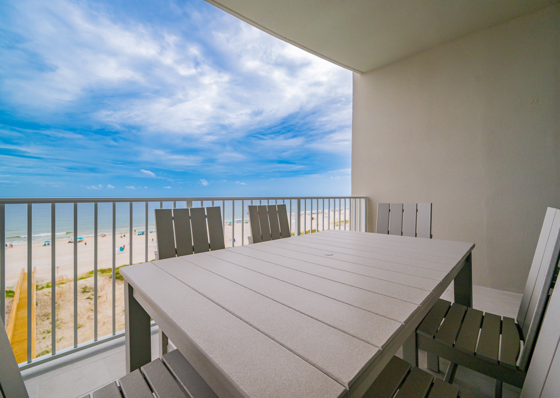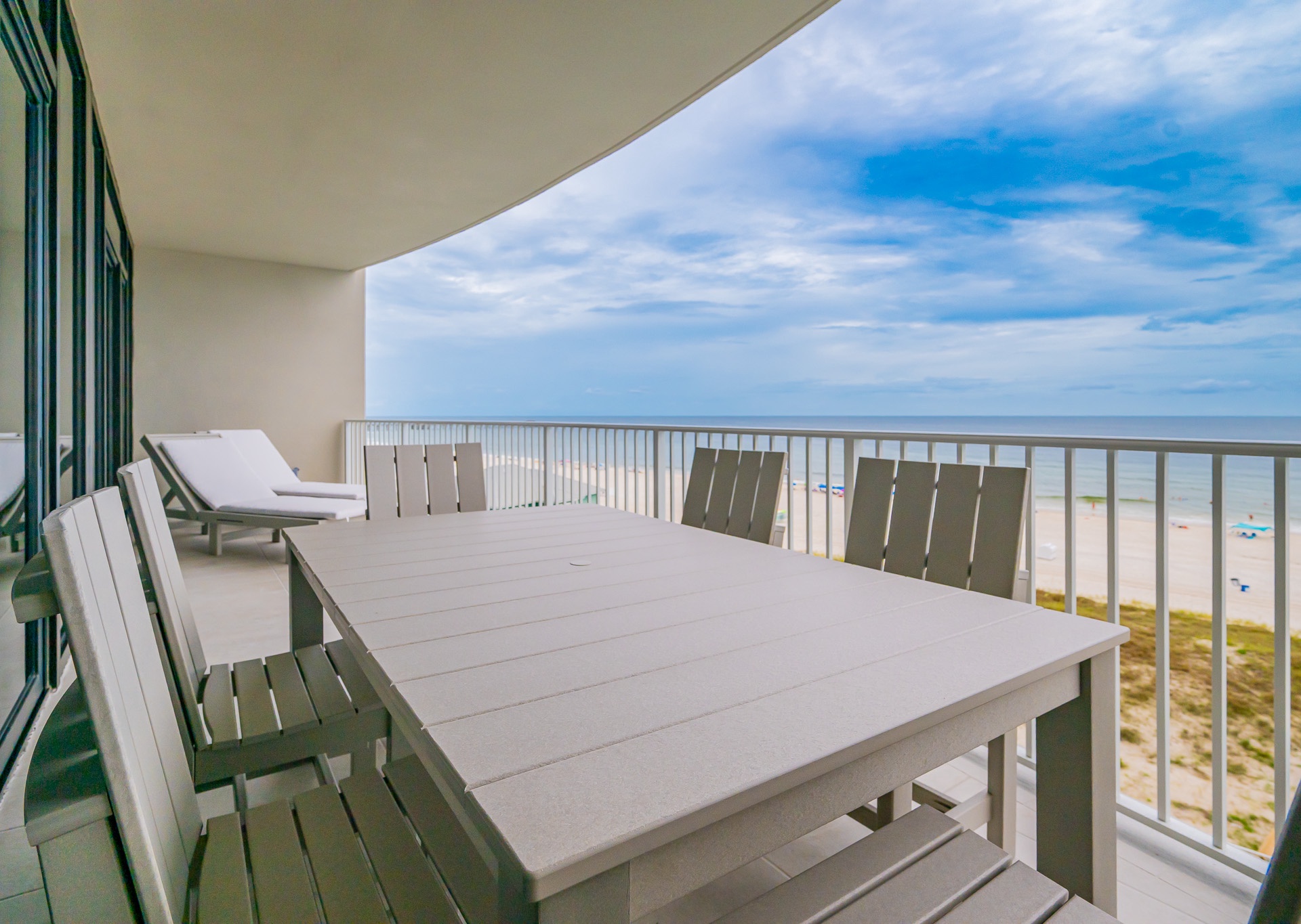 Step outside onto the tiled, oversized balcony furnished with Pollywood table and chairs plus chaise lounges with cushions, perfect for soaking in the Gulf breeze and watching sunsets.