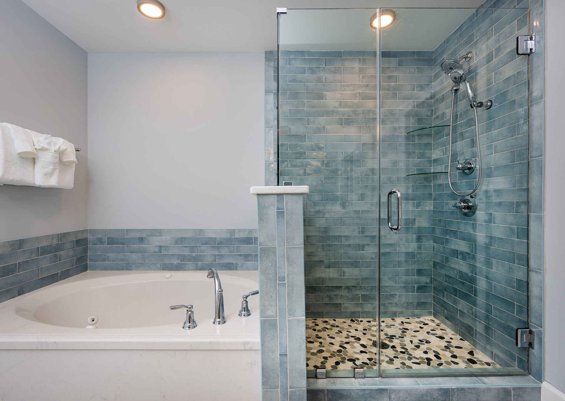 The master bedroom features a king bed, private balcony access, and a luxurious en suite bathroom with a Jacuzzi tub and a beautifully tiled walk-in glass shower.