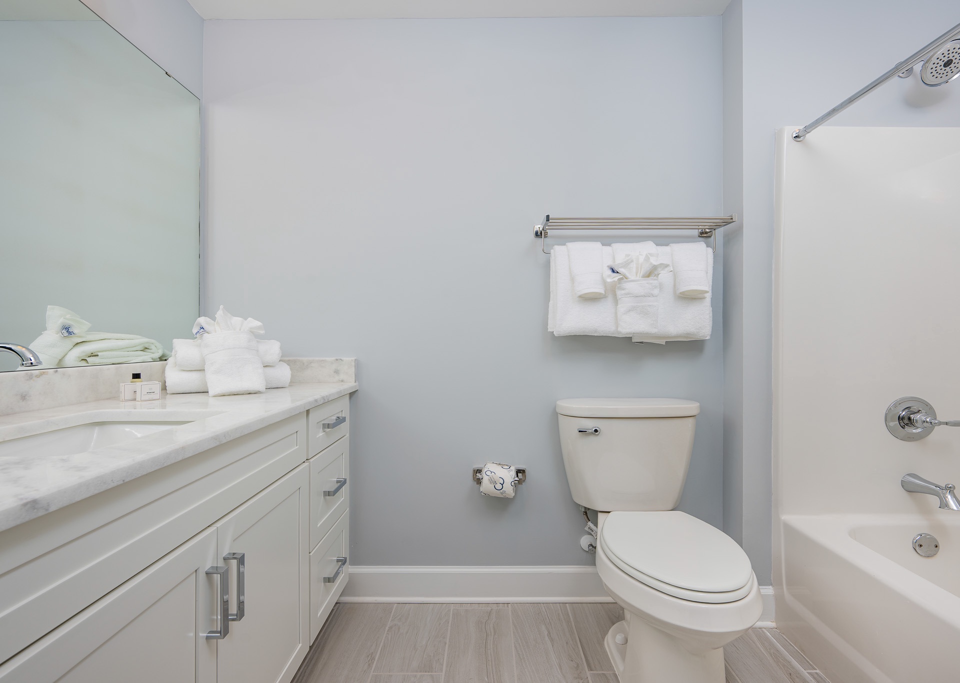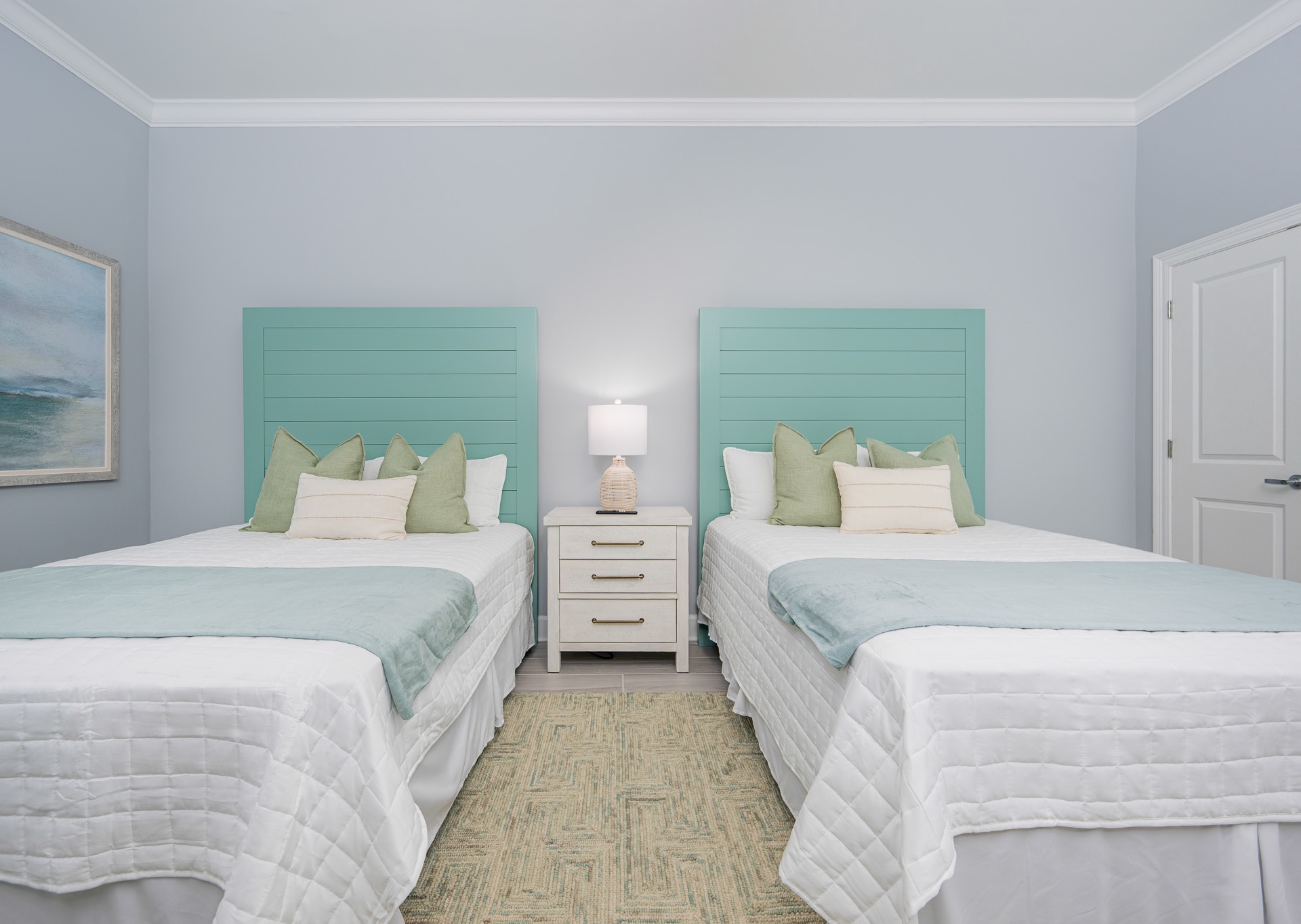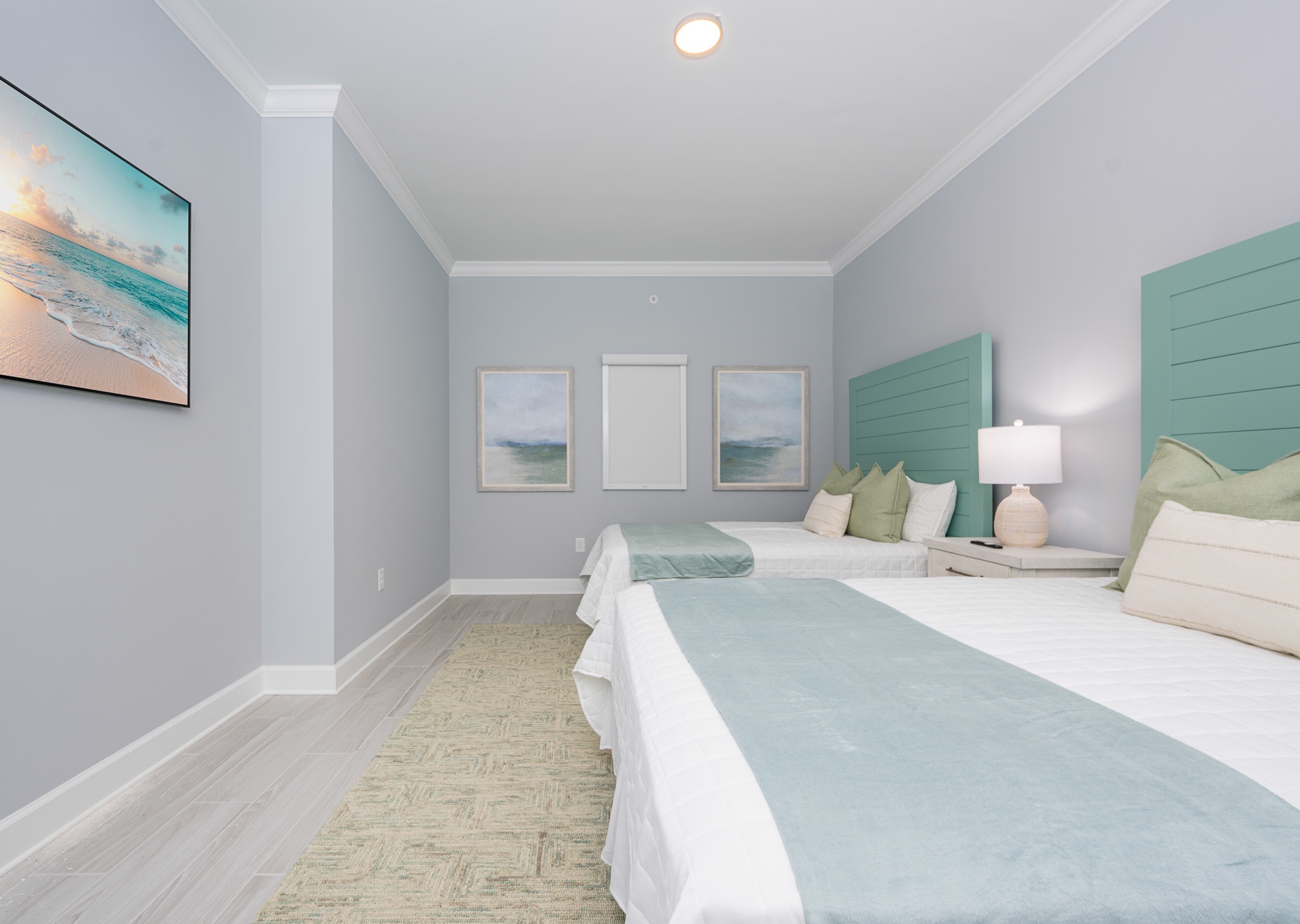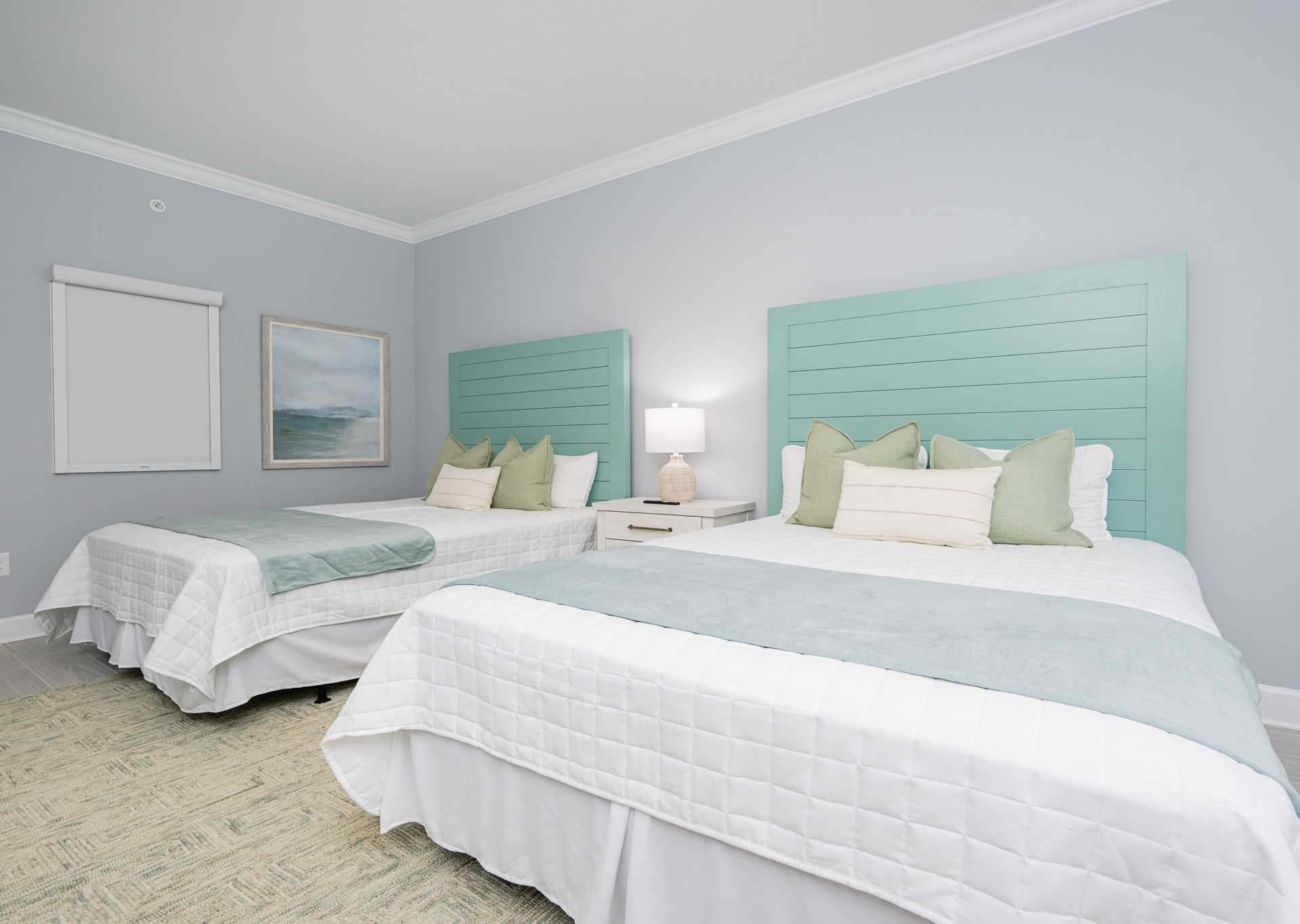 The second bedroom includes two queen beds and a private bath with a tub/shower combo.