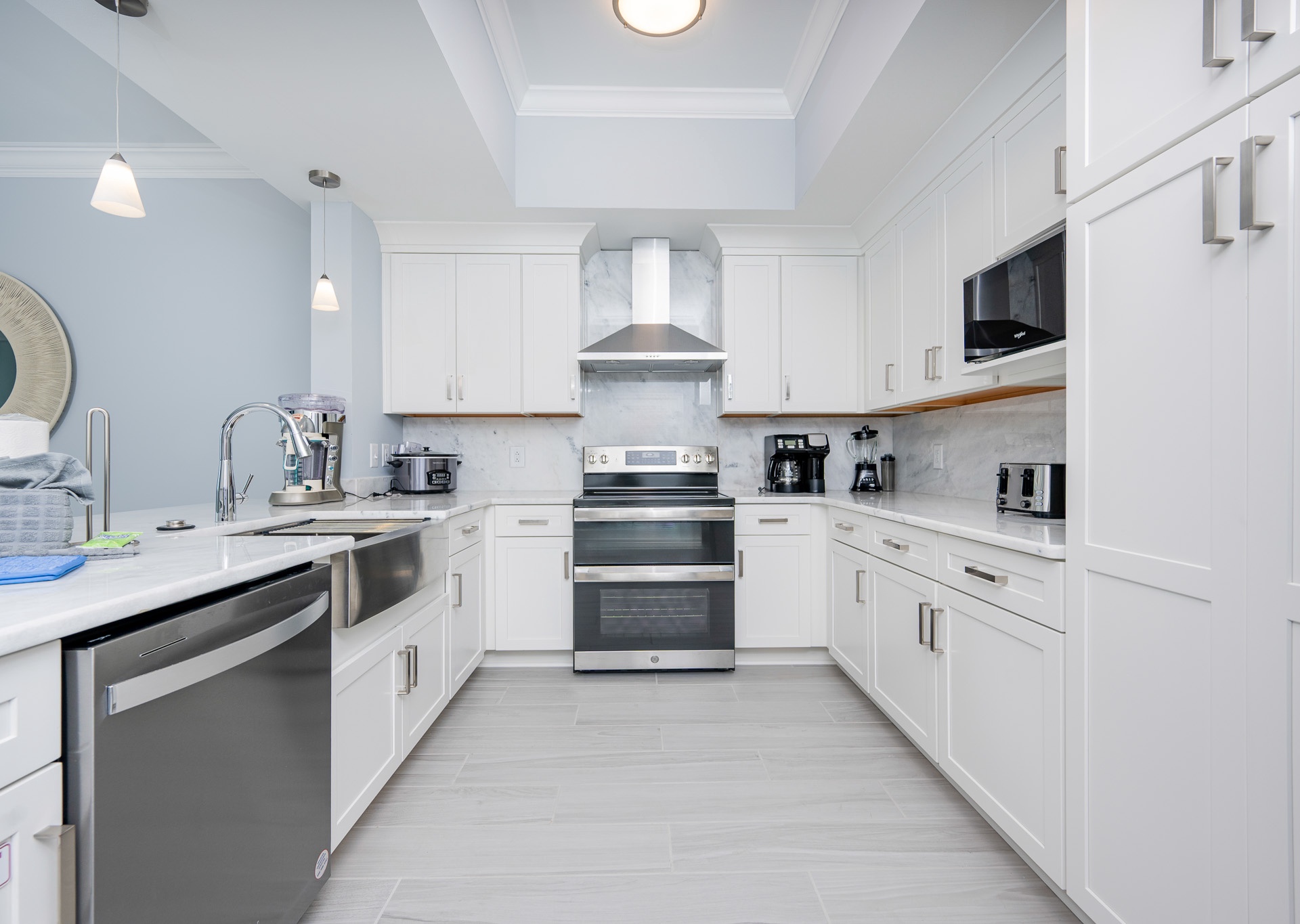 The fully stocked kitchen includes white cabinetry, stainless steel appliances, a farmhouse-style stainless sink, convection oven, Keurig and drip coffee maker, and four barstools at the breakfast bar. An additional bar area features a beverage cooler, icemaker, sink, and ample cabinetry.