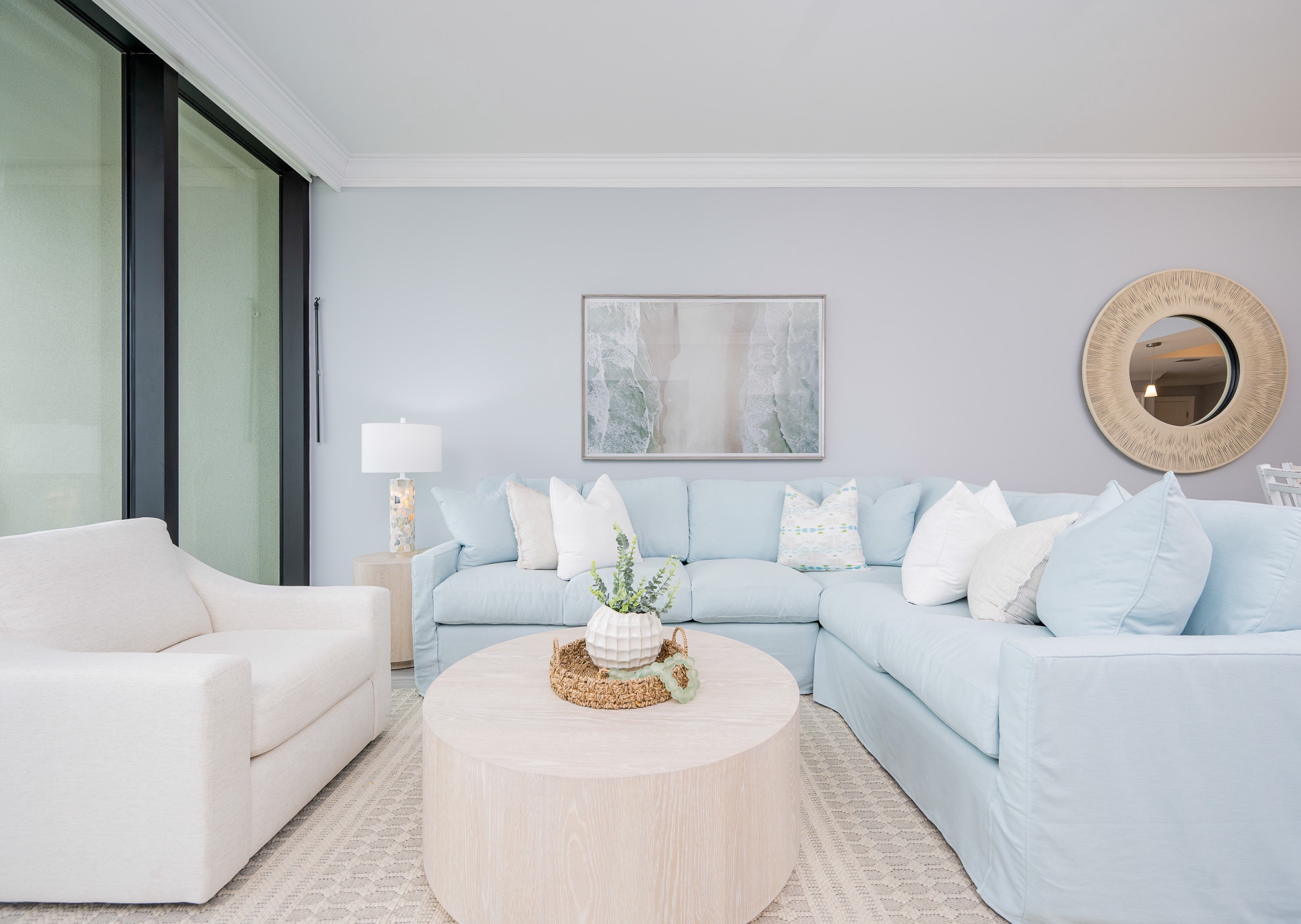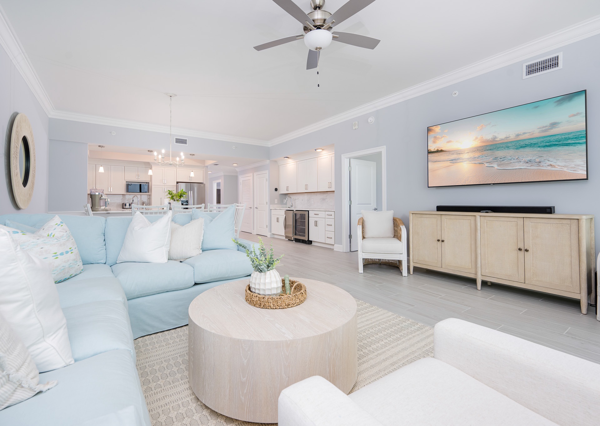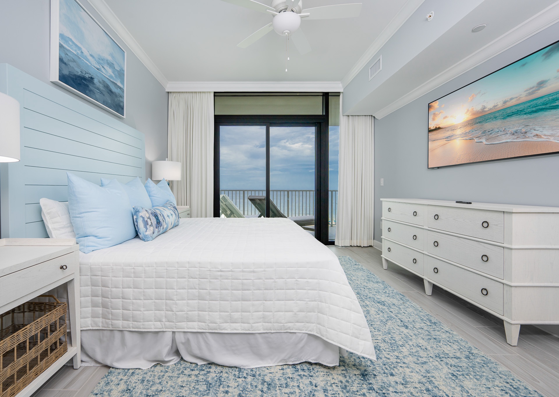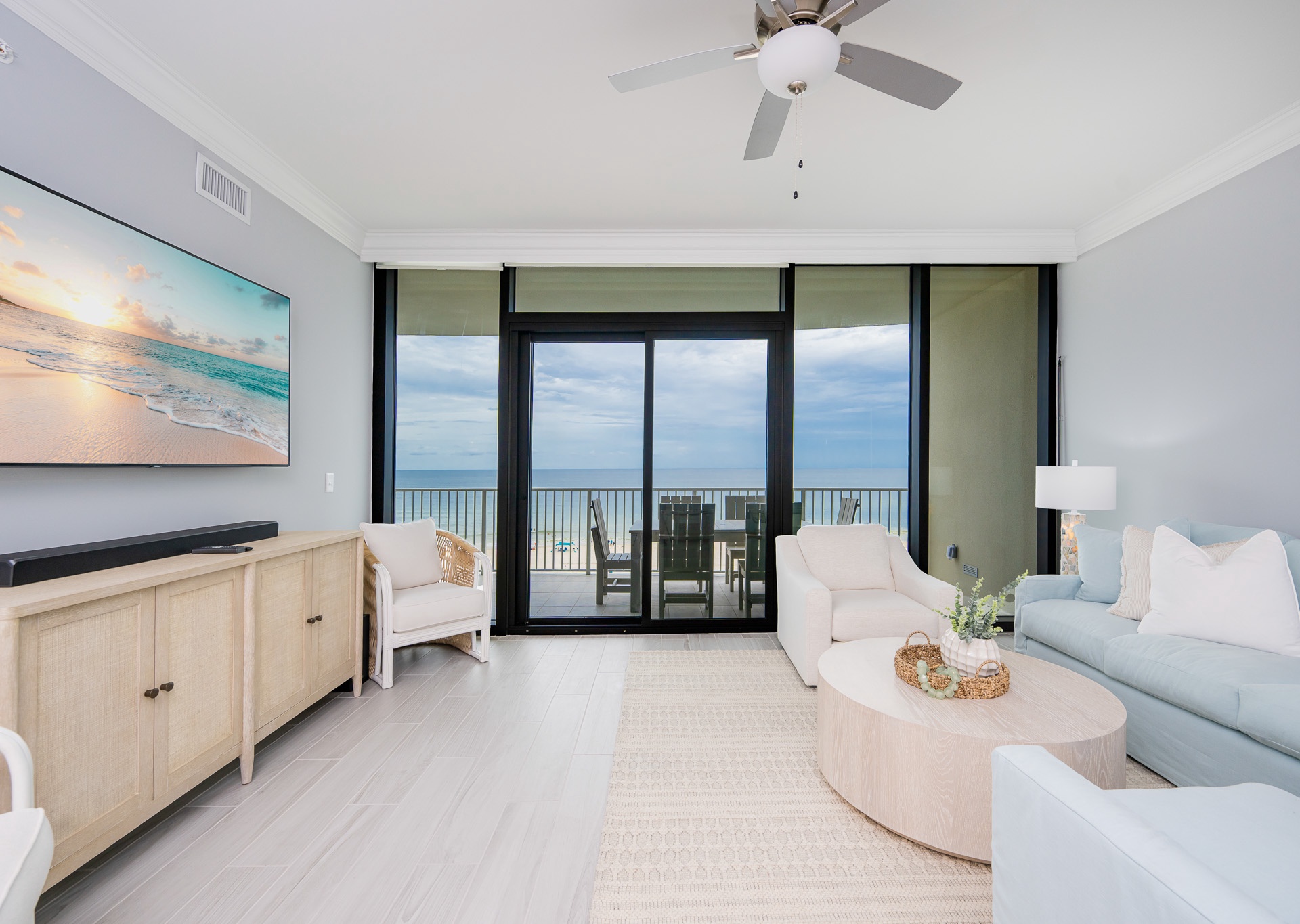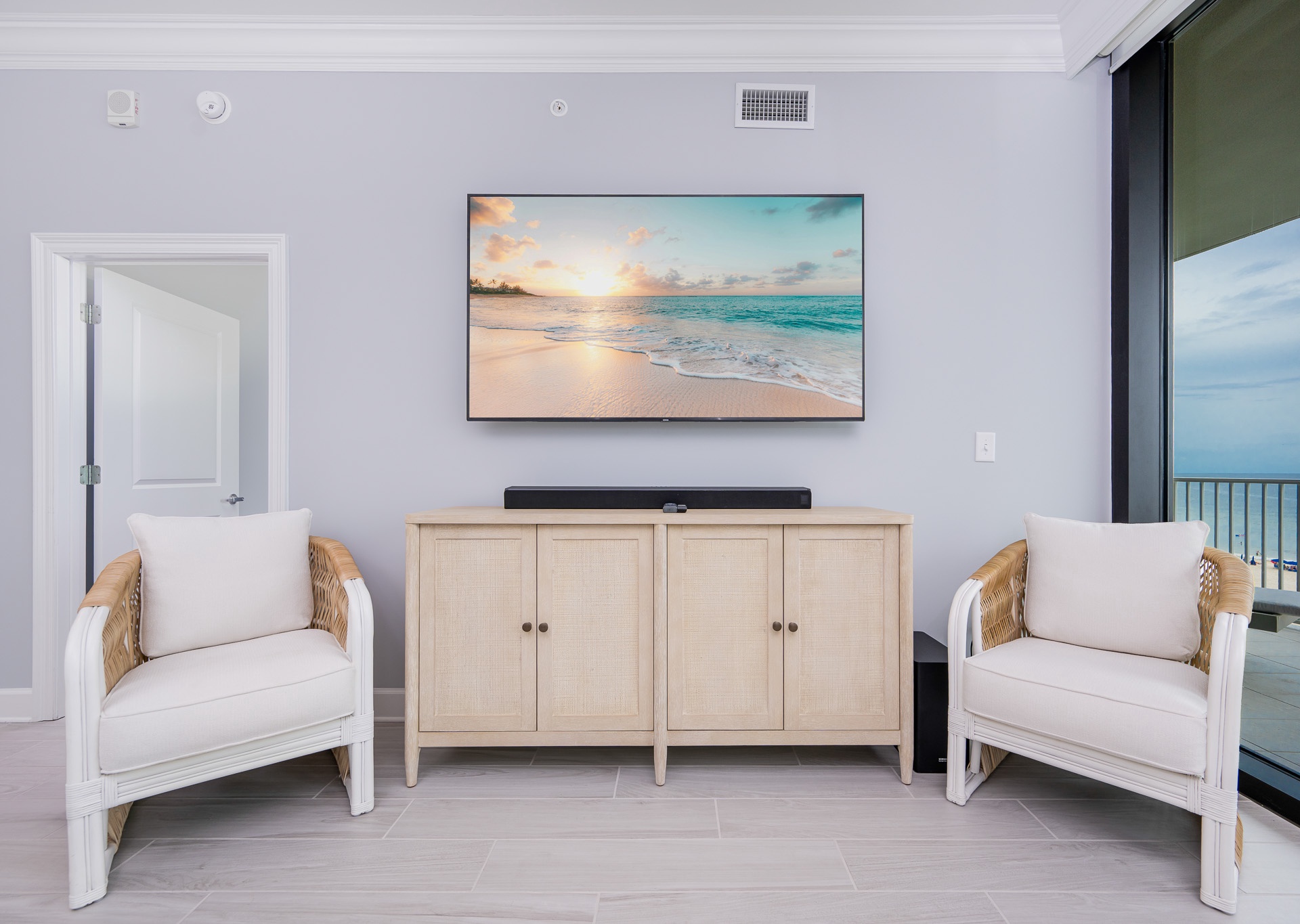 Enjoy floor-to-ceiling windows and a sliding glass door in both the living room and master bedroom, filling the space with natural light and breathtaking Gulf views. The living room and all bedrooms are equipped with wall-mounted flatscreen TVs for your entertainment.