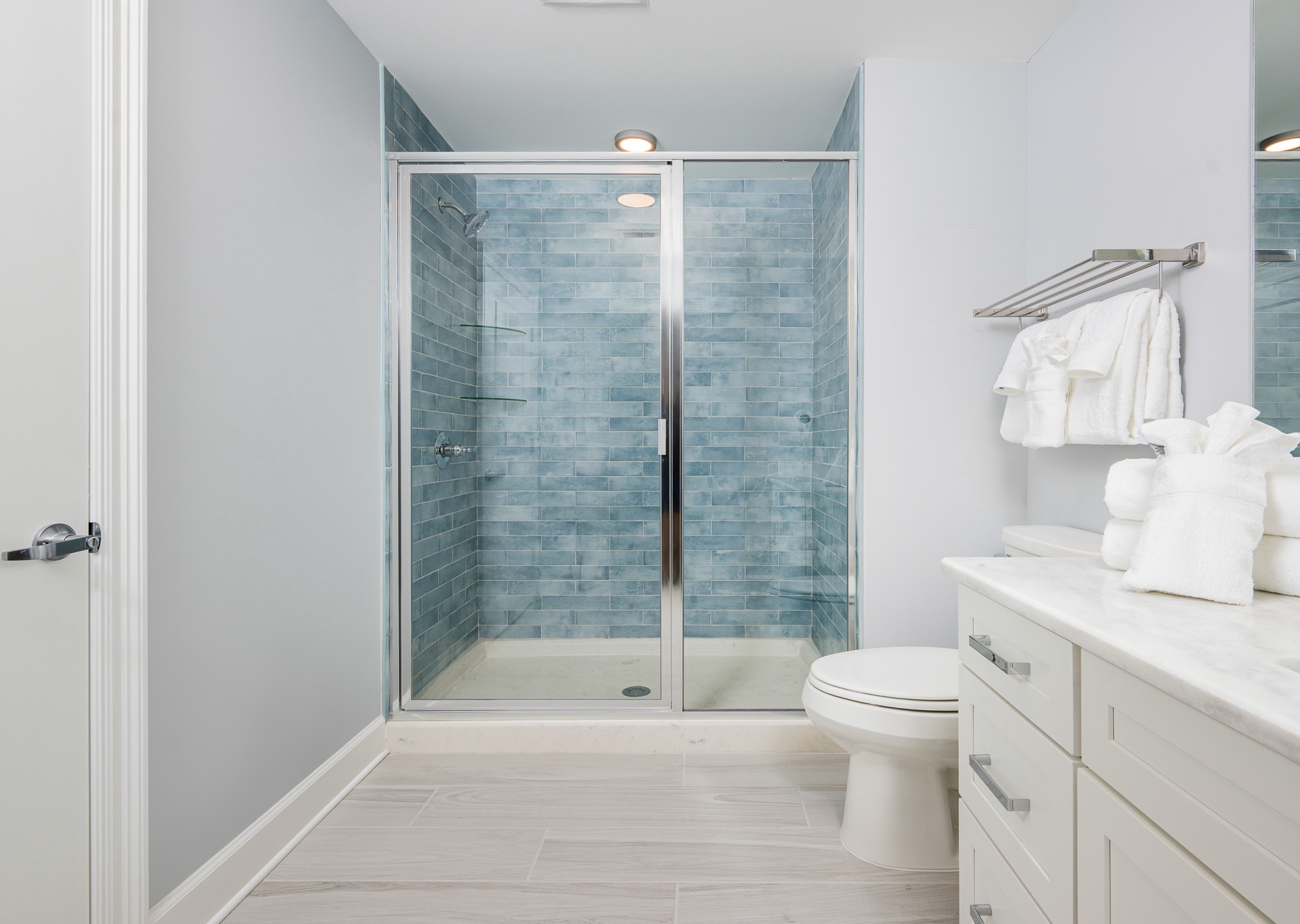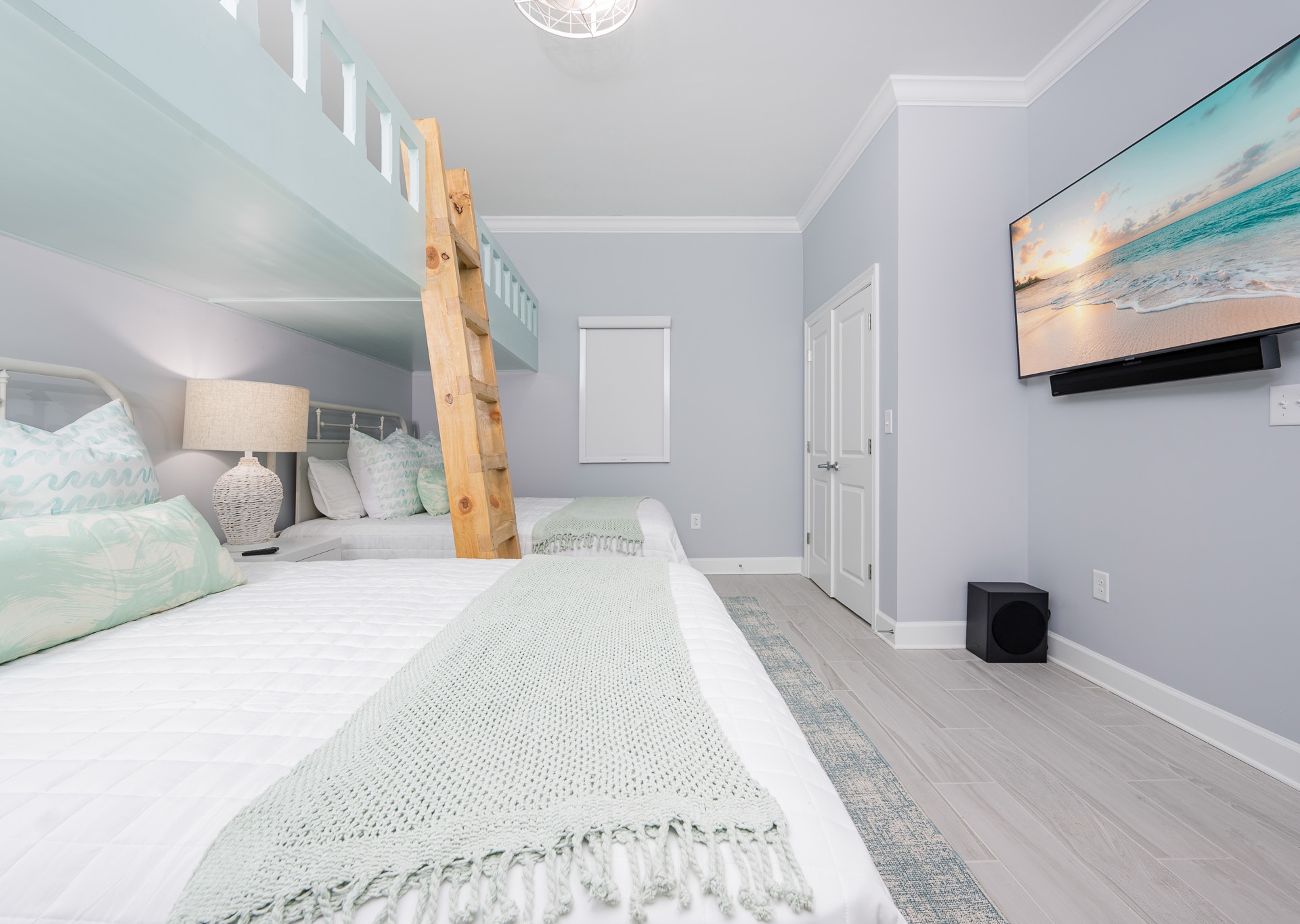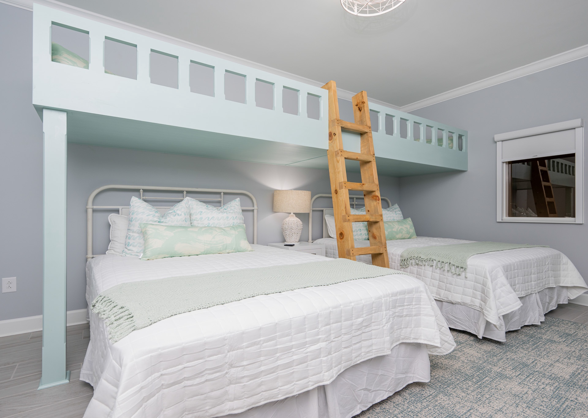 The third bedroom is ideal for multiple guests, offering two queen beds plus two loft-style twin bunkbeds, along with its own bathroom featuring a walk-in tiled shower with a glass door.