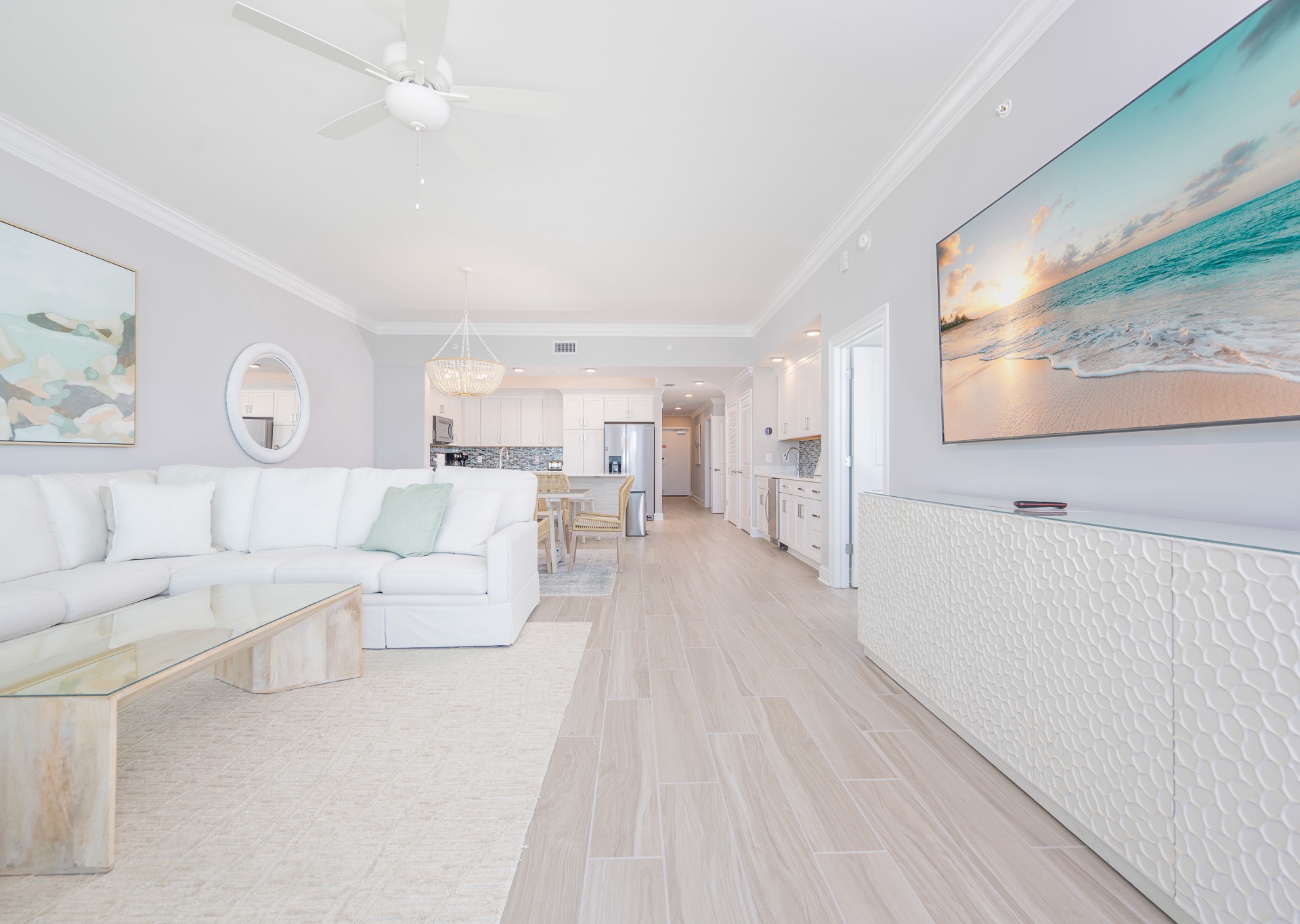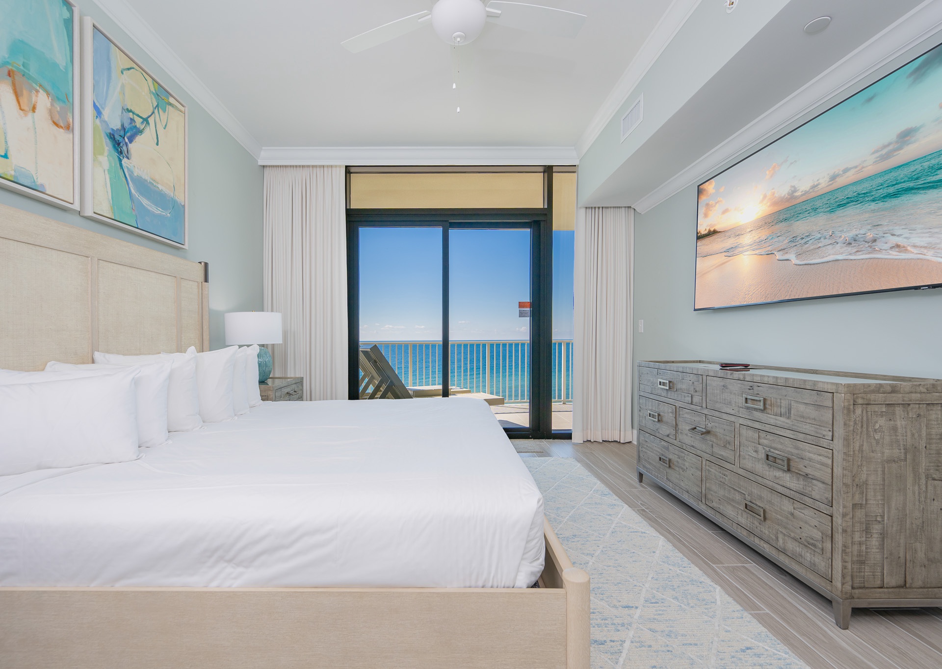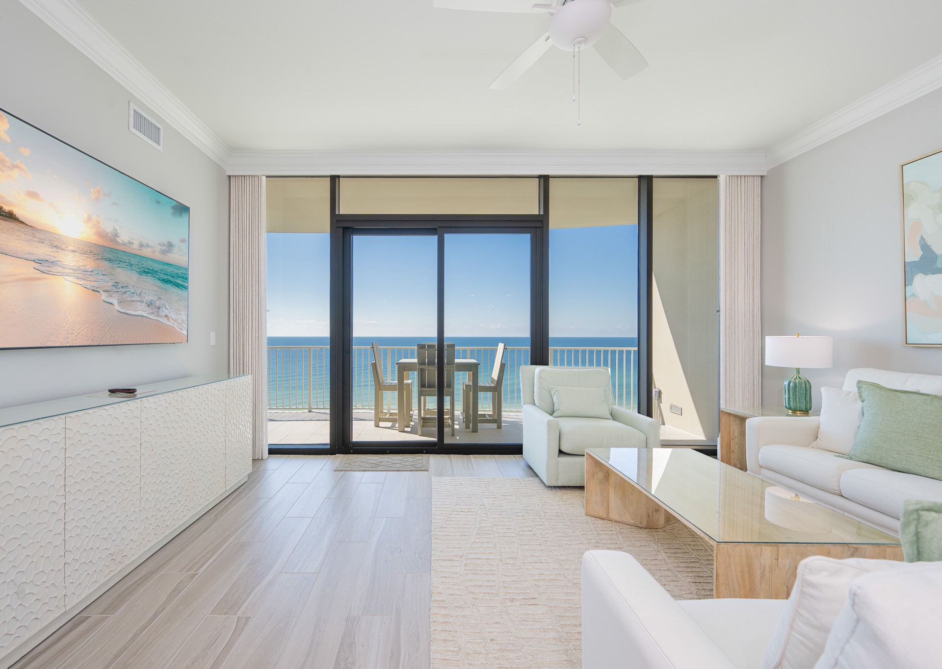 The living area boasts stunning floor-to-ceiling windows that open to the balcony, filling the space with natural light and panoramic views of the Gulf of Mexico. Relax on the plush sectional sofa and enjoy the large wall-mounted flat-screen TV. Ceiling fans are featured in the living room and all bedrooms for added comfort.