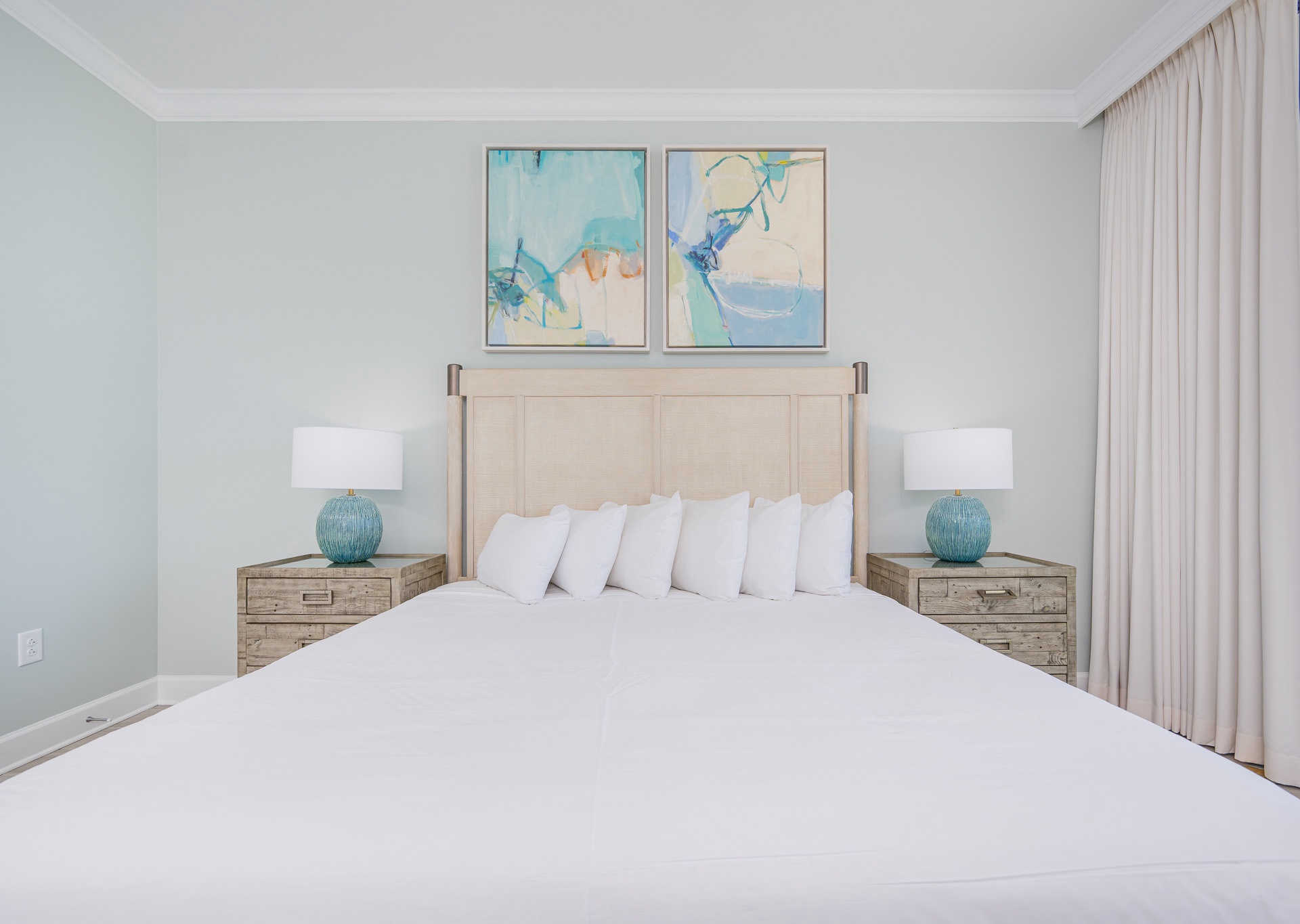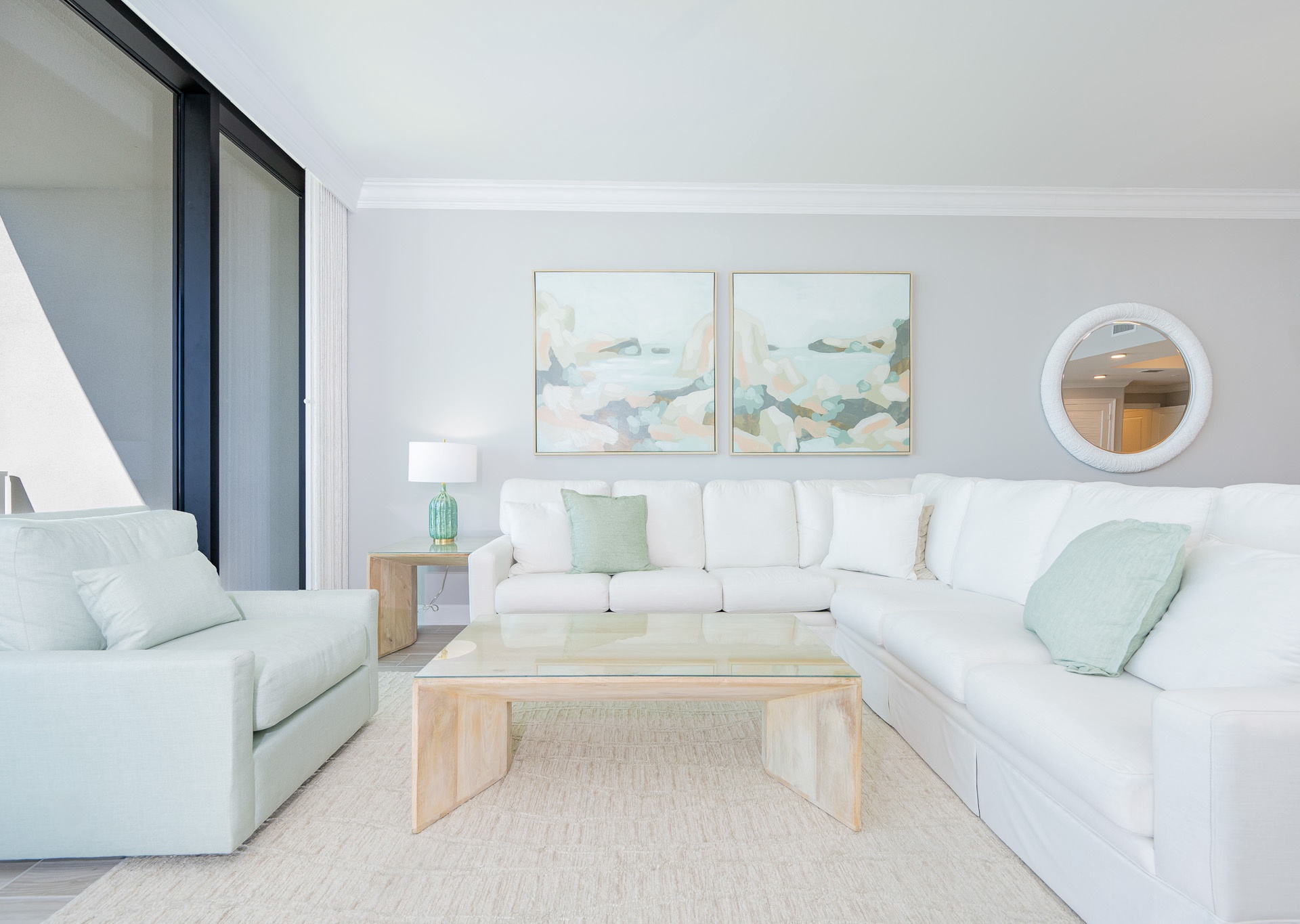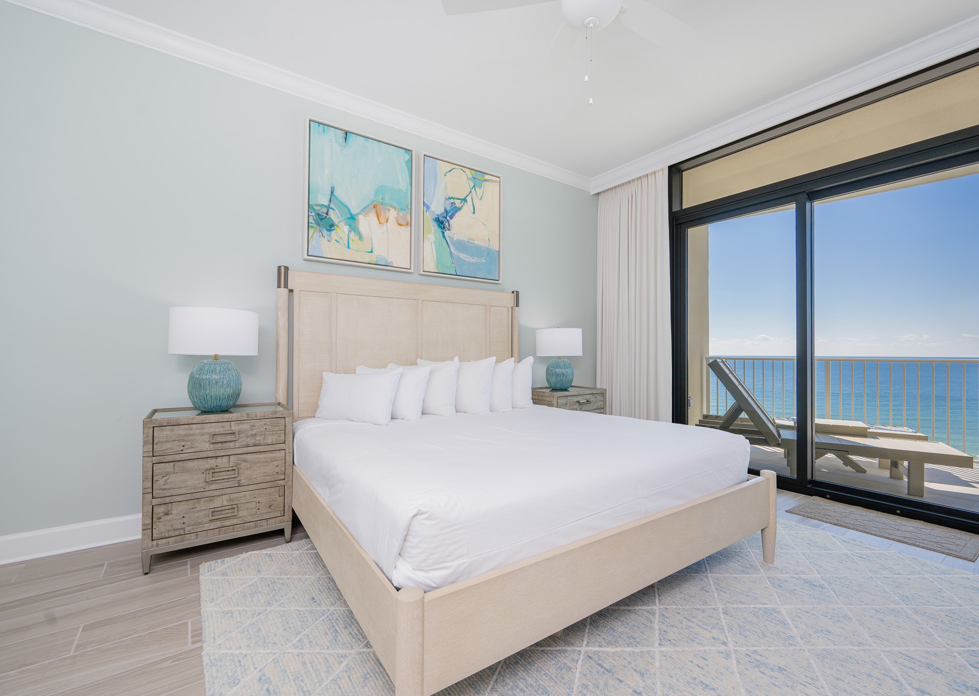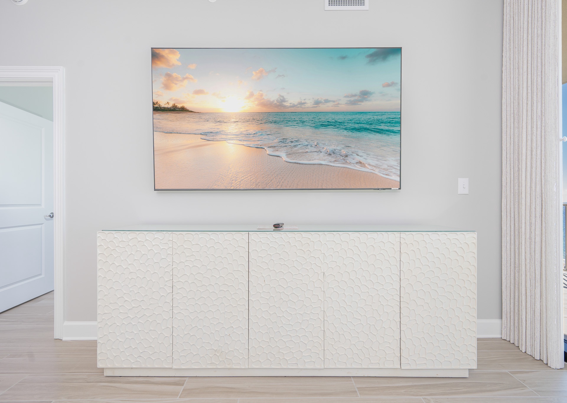 The living area boasts stunning floor-to-ceiling windows that open to the balcony, filling the space with natural light and panoramic views of the Gulf of Mexico. Relax on the plush sectional sofa and enjoy the large wall-mounted flat-screen TV. Ceiling fans are featured in the living room and all bedrooms for added comfort.