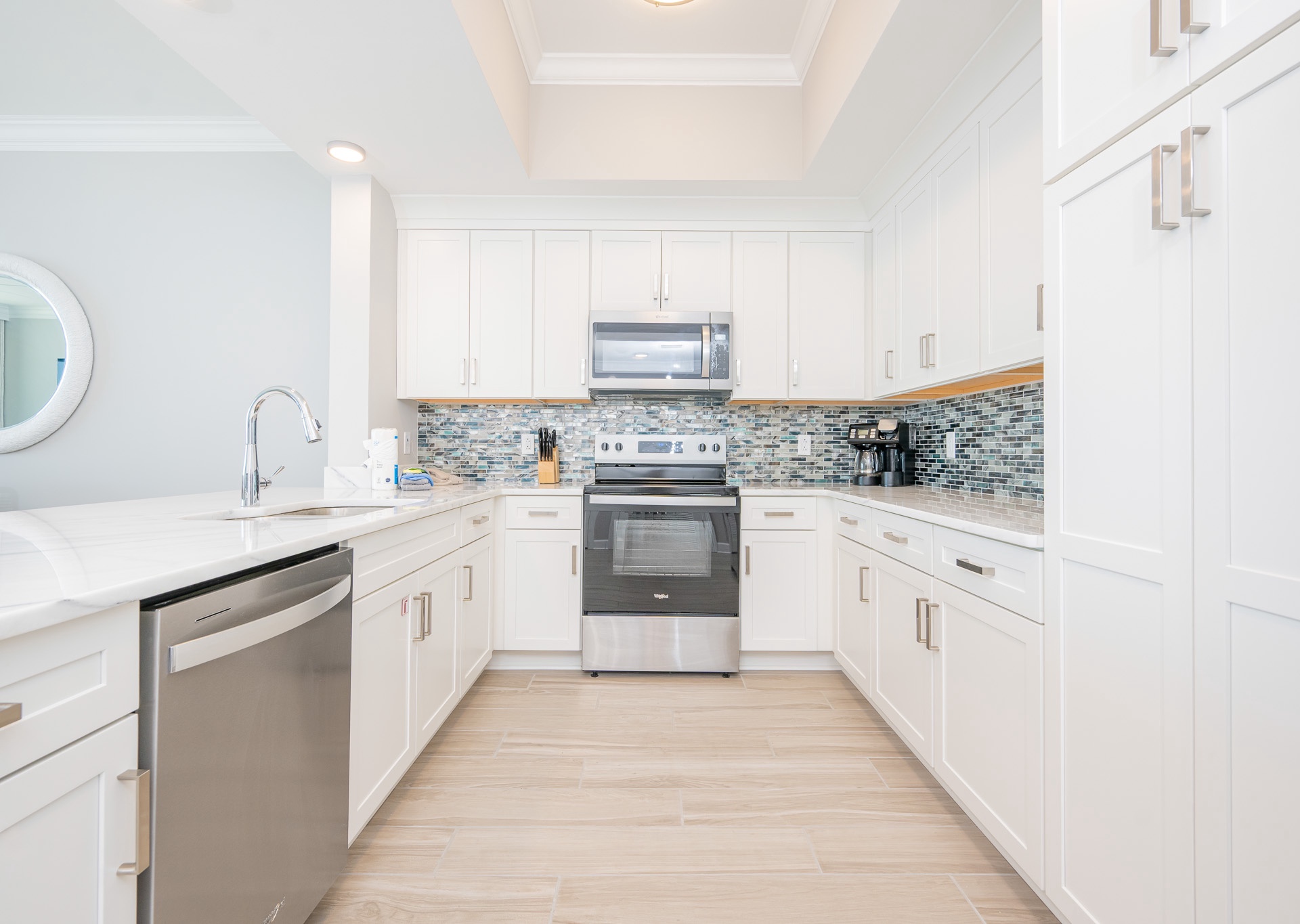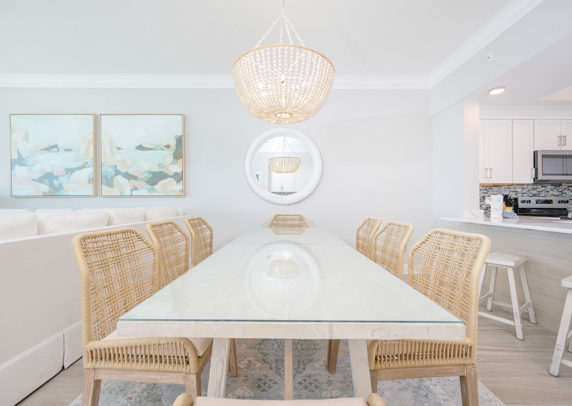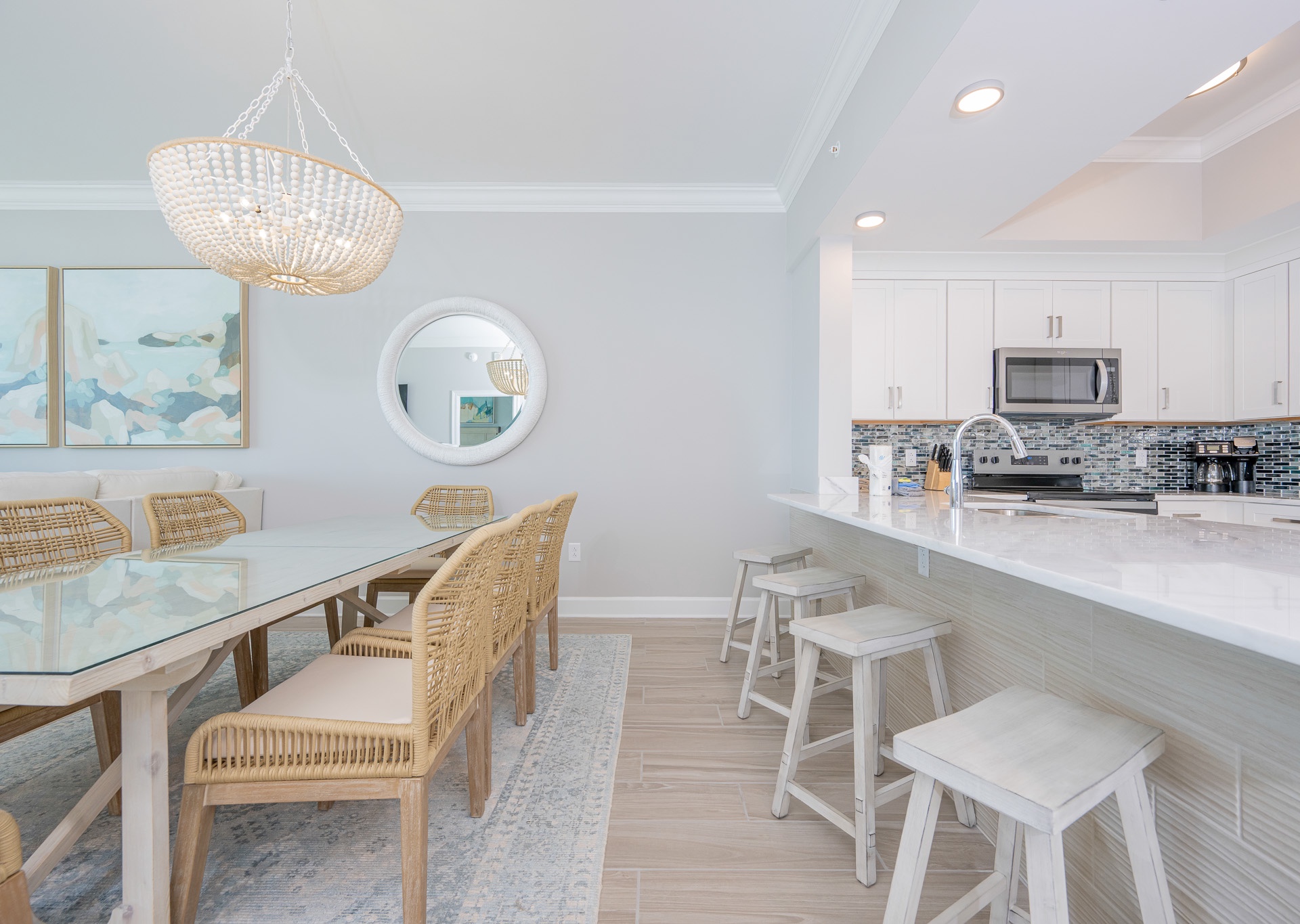 The dining area seats eight beneath a beautiful chandelier, with four additional barstools at the breakfast bar. The kitchen is fully equipped with stainless steel appliances, plenty of cabinetry, and an inset sink. A regular drip coffee maker and Keurig are provided for your convenience. An adjacent wet bar with a separate sink and ice maker makes entertaining effortless.