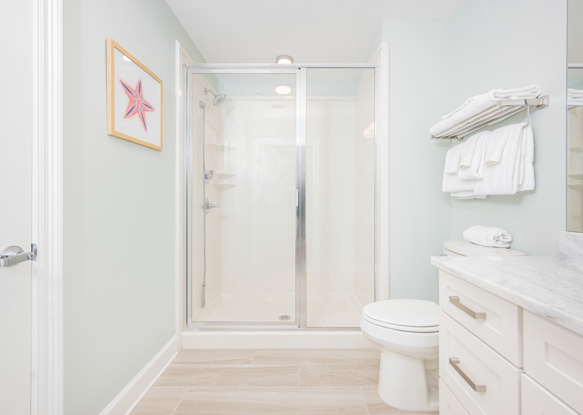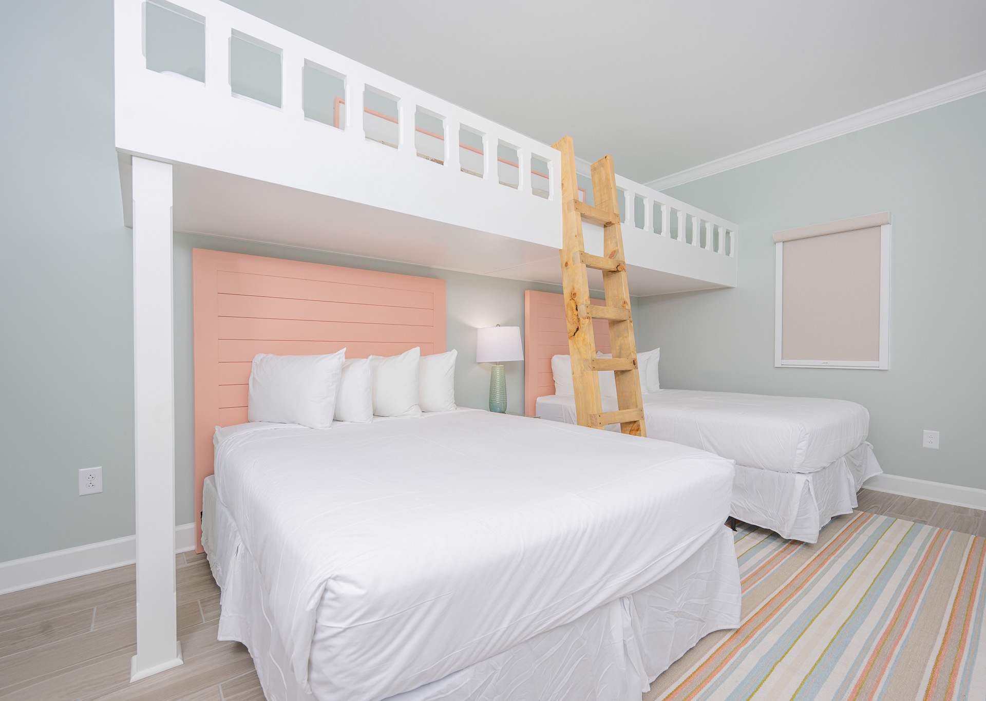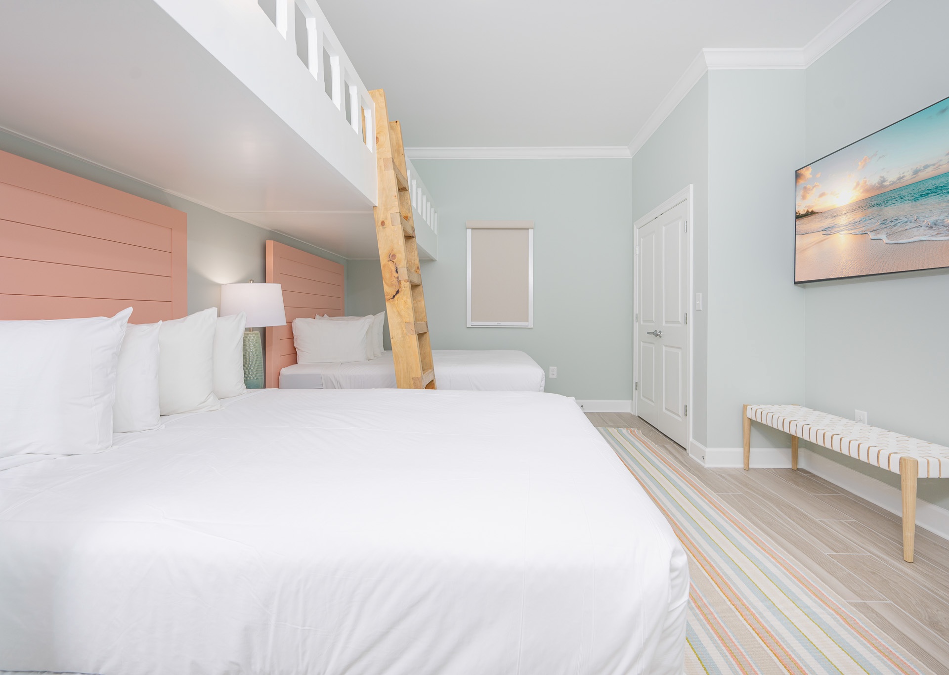 The second bedroom offers two queen beds and a bathroom with a walk-in shower that can be accessed from the bedroom or hallway. The third bedroom is perfect for families or groups, featuring two queen beds plus two built-in lifestyle bunk beds, and a private bathroom with a tub/shower combination and single vanity.