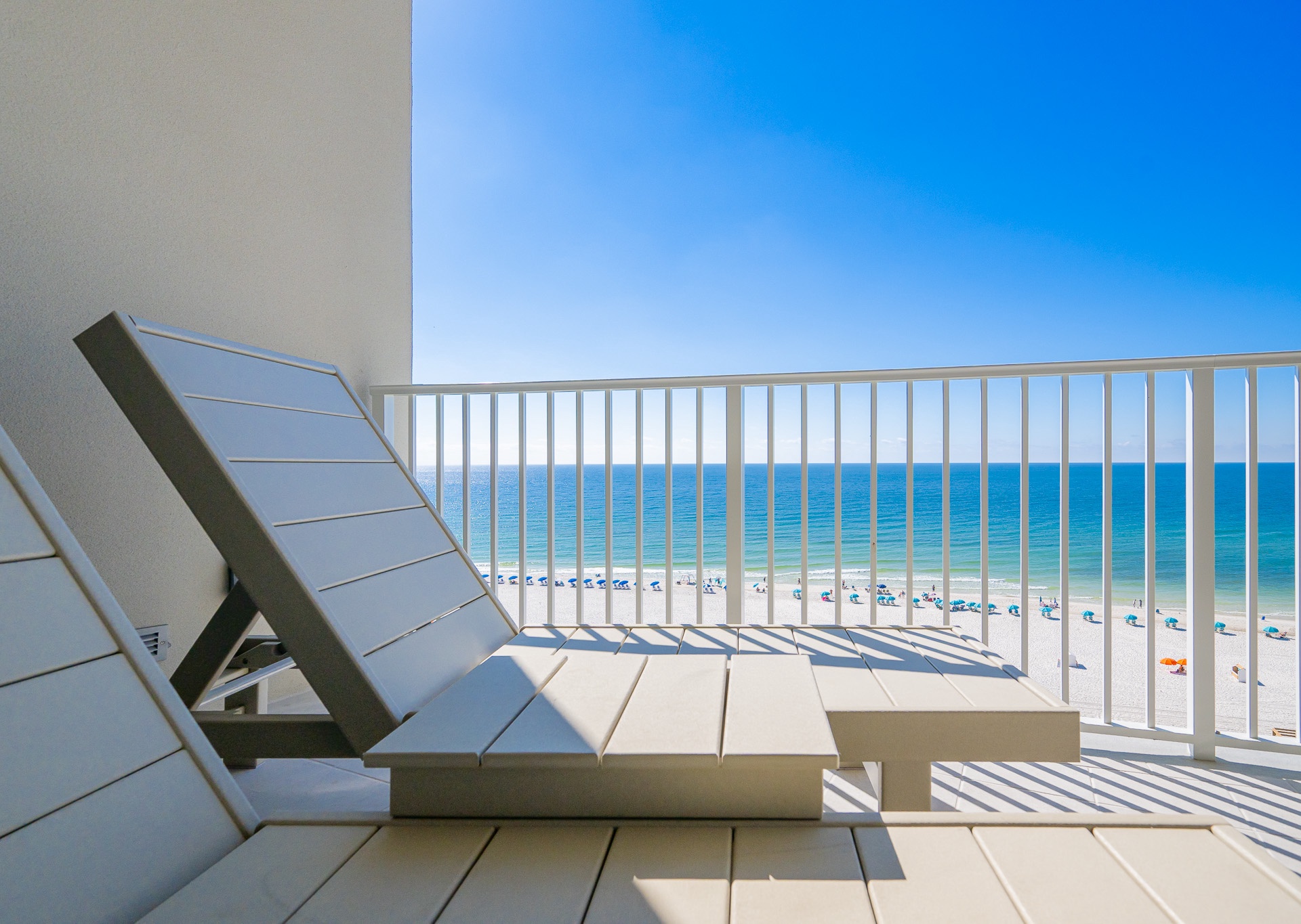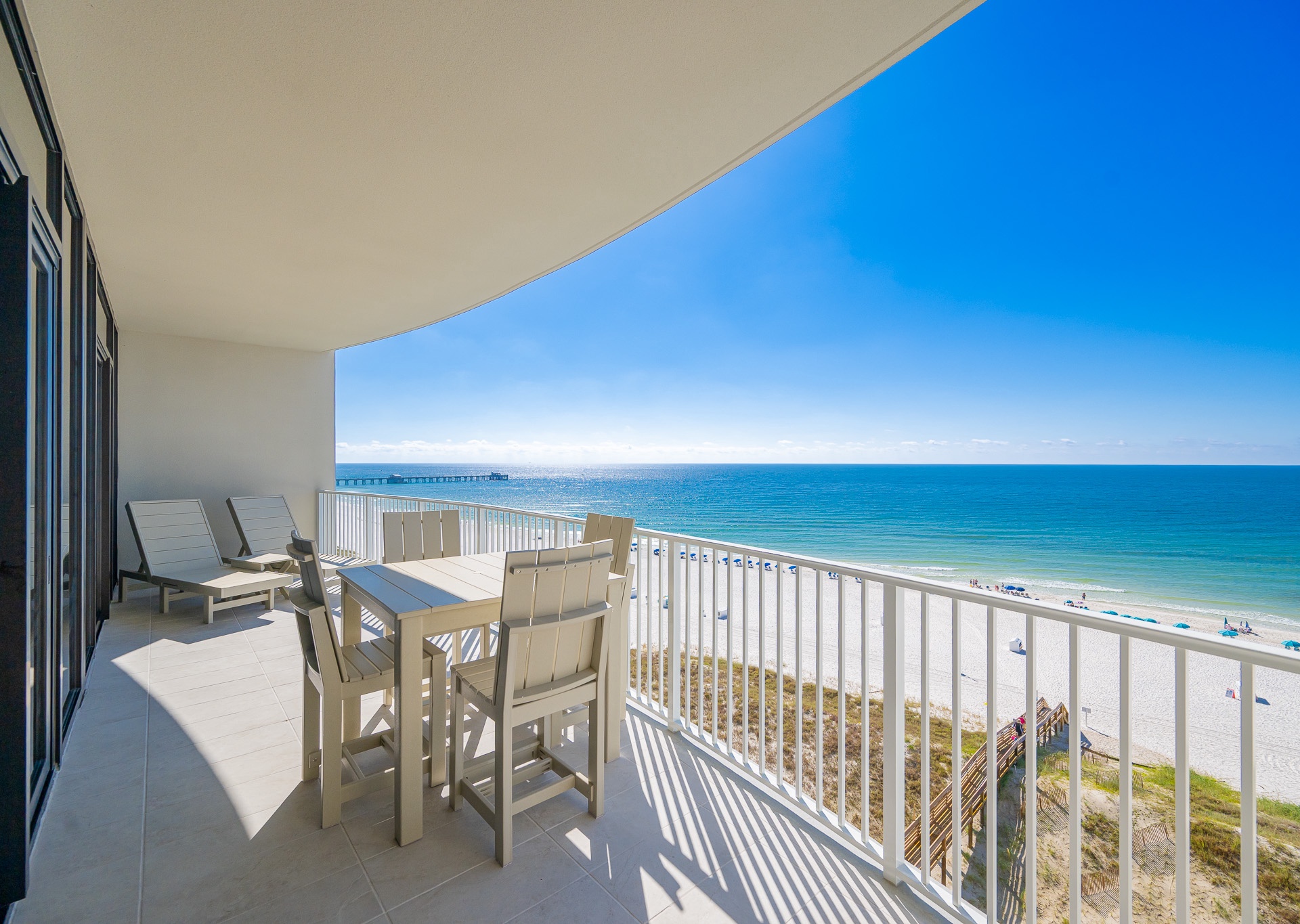 Step outside onto the expansive balcony, furnished with Pollywood-style seating, including chaise lounges, chairs, and a dining table, perfect for enjoying meals or sunsets overlooking the Gulf of America and resort amenities.