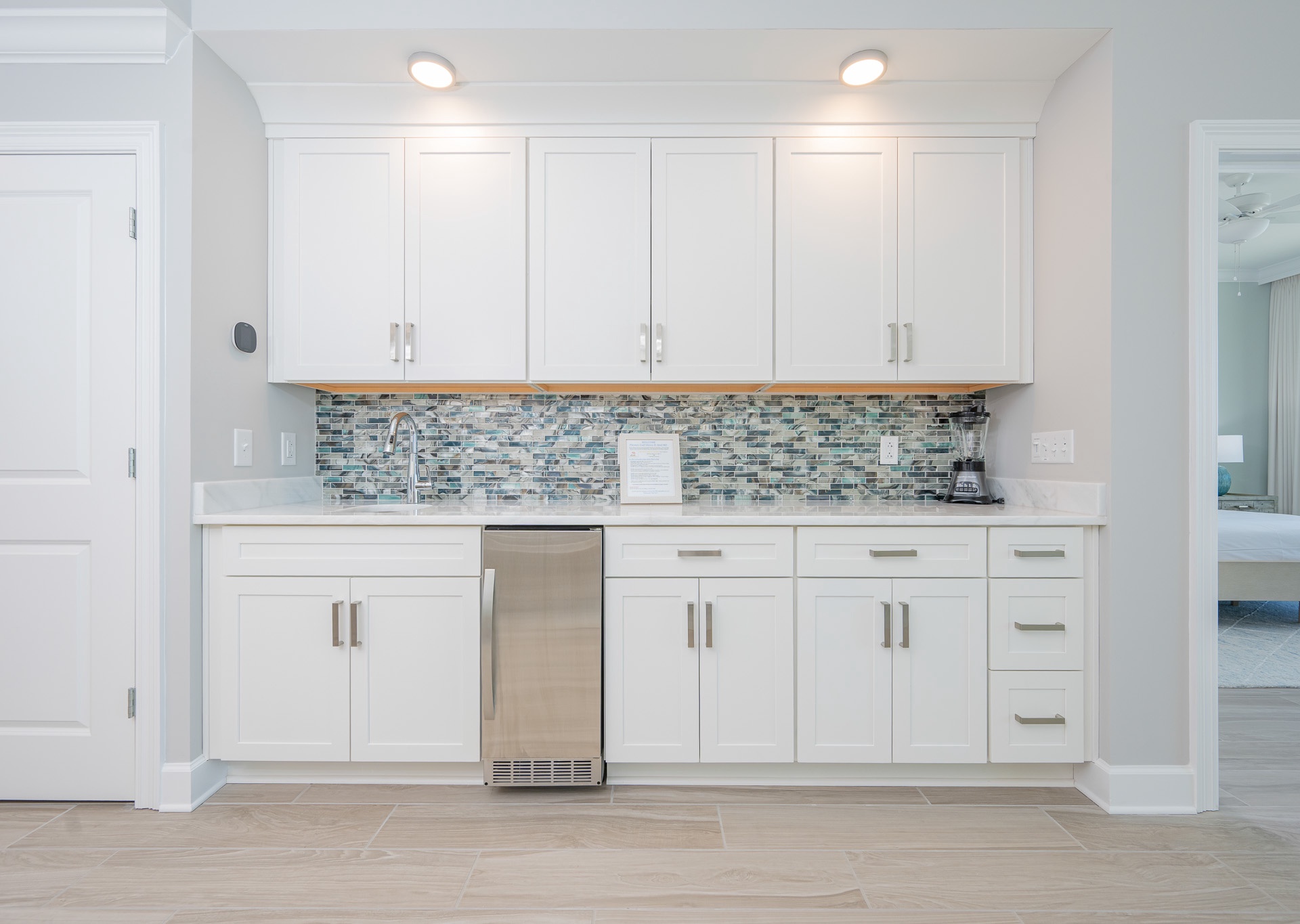 • Kitchens with stainless steel appliances, granite countertops, custom cabinets, a wet bar with an ice maker, and a tile backsplash.