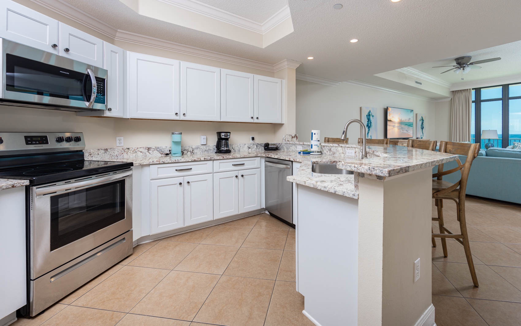 The living area is a haven of relaxation, featuring tasteful furnishings, a flat-screen TV, and large windows that frame panoramic views of the Gulf. The fully equipped kitchen is a chef's delight, boasting modern appliances and ample space for preparing meals.